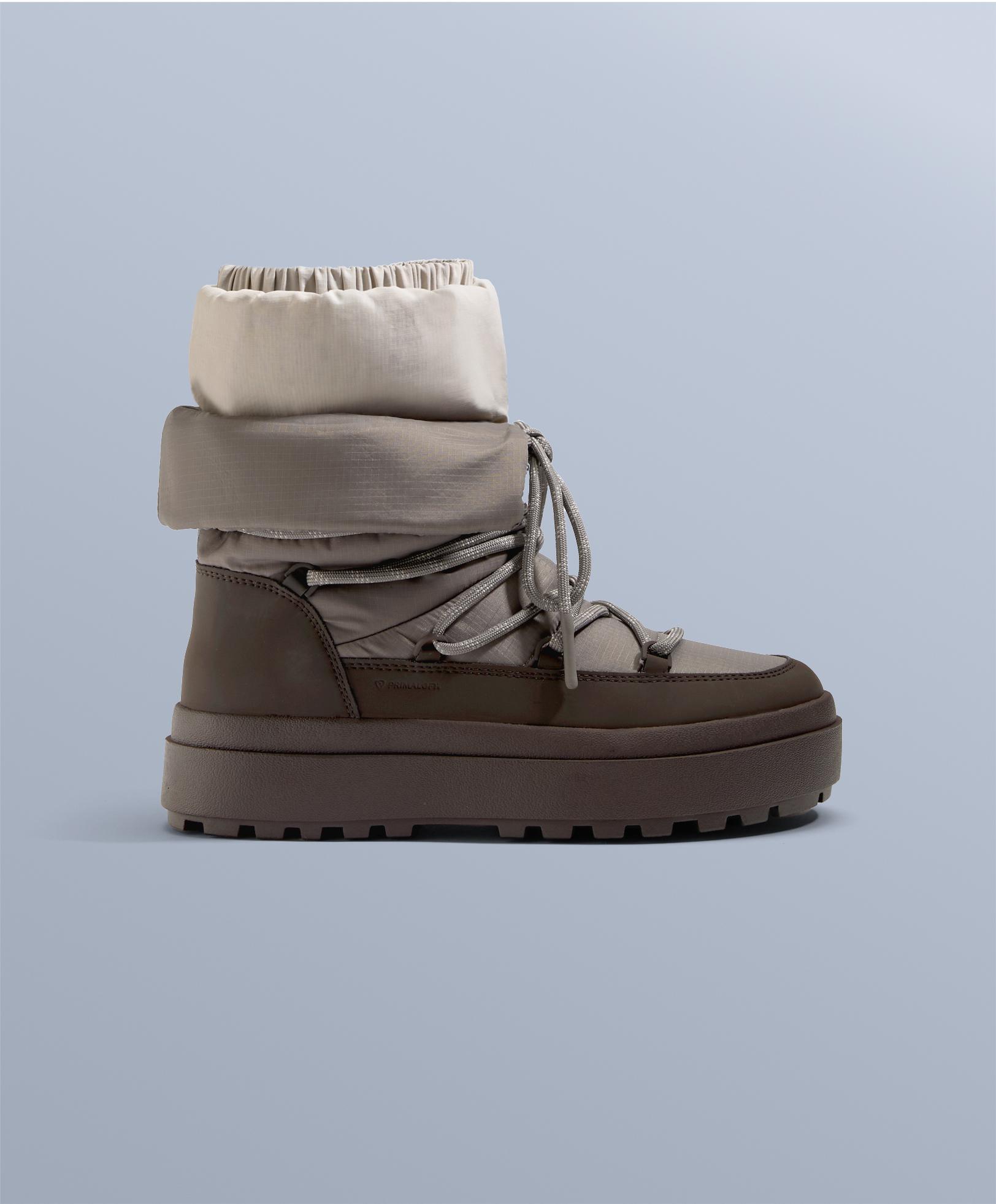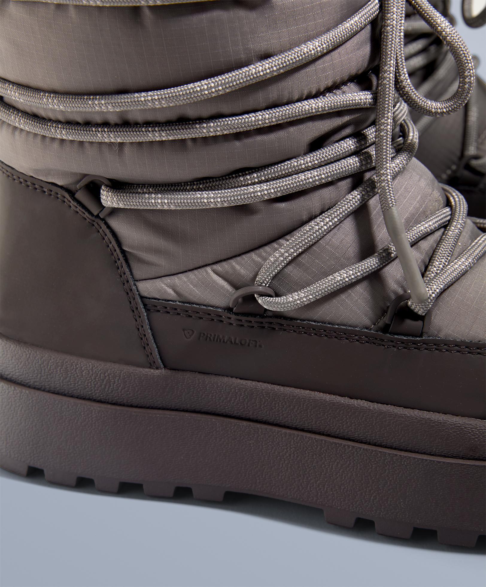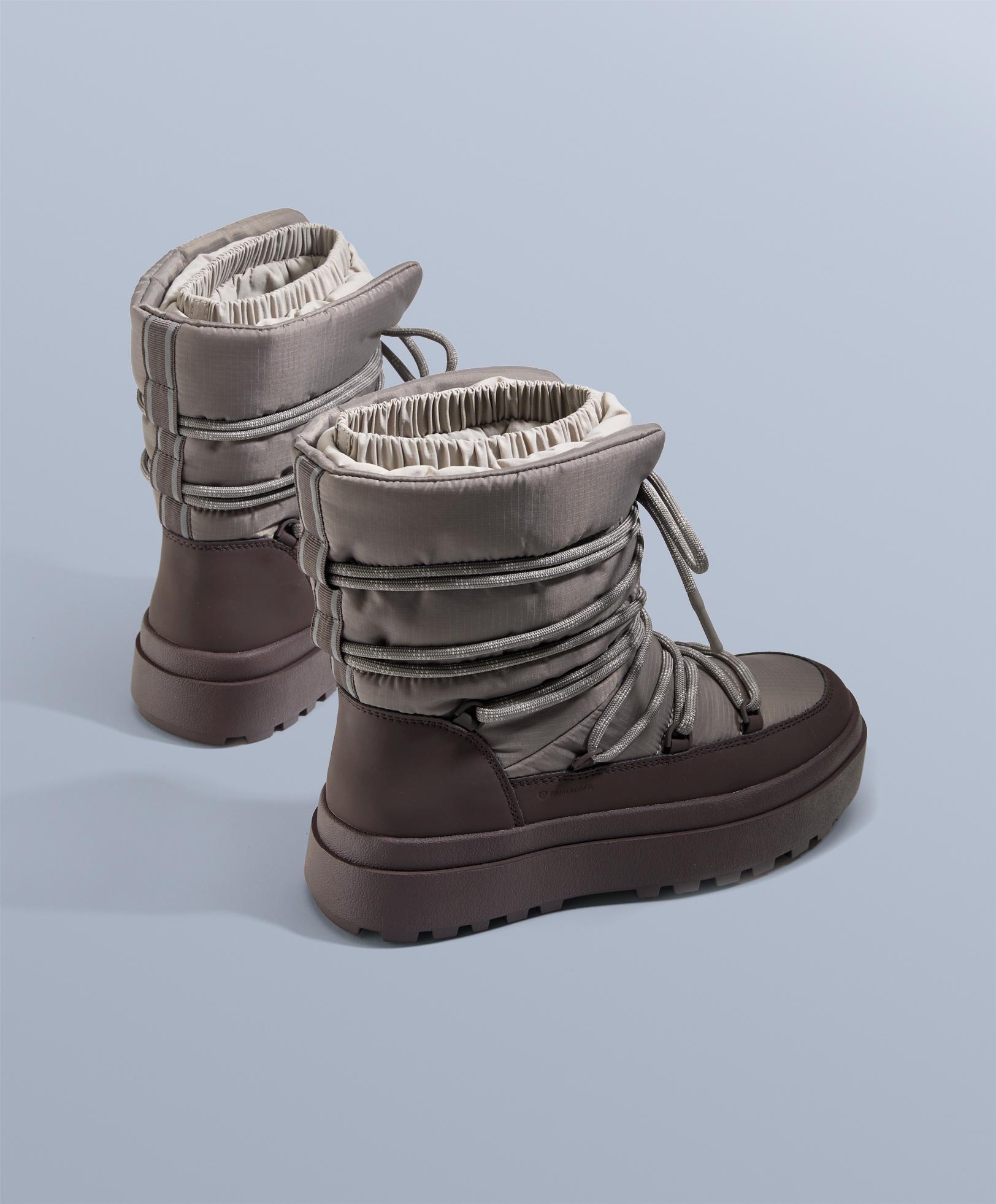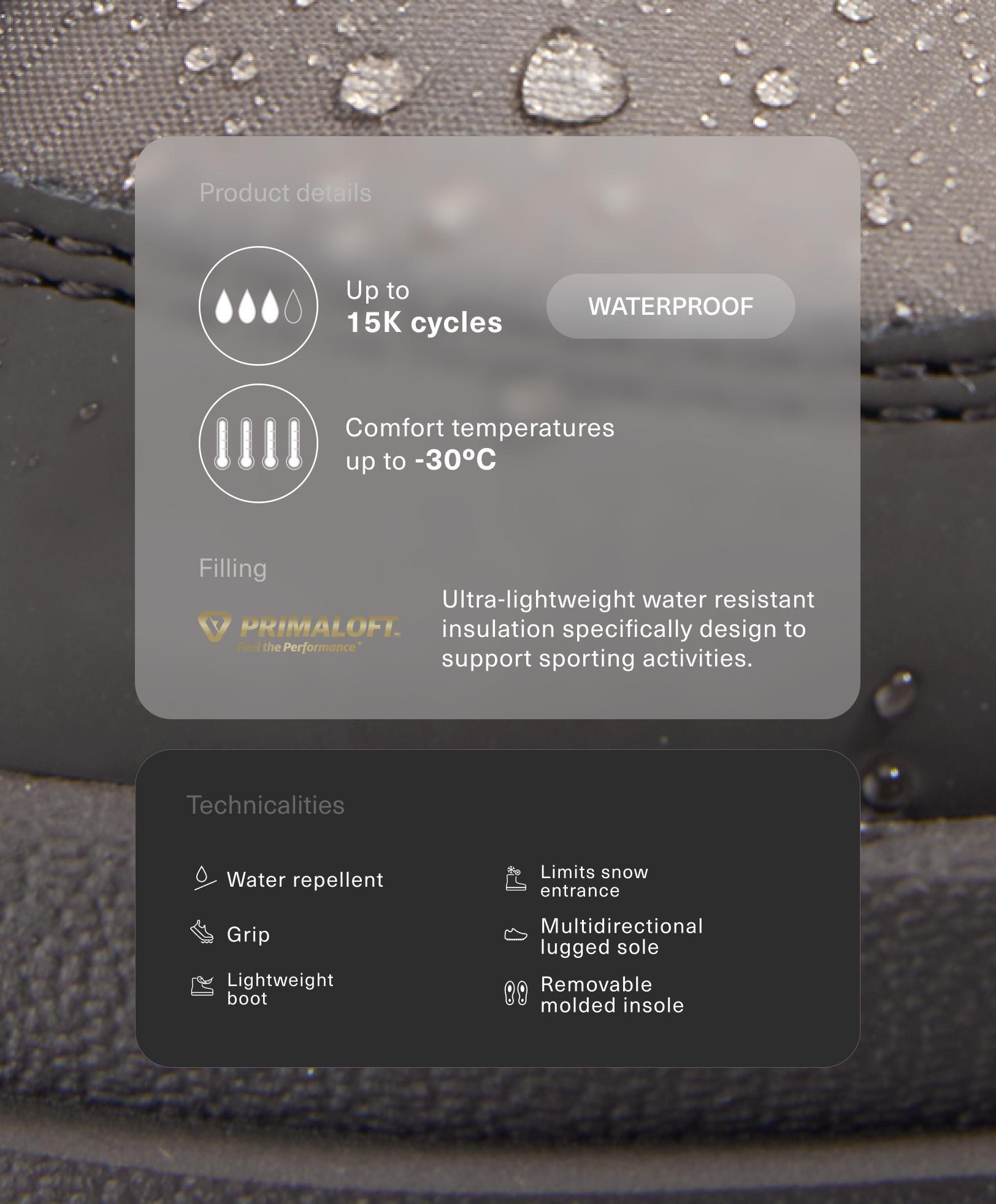 Ботинок с термоизоляцией, протестированной в лаборатории при температуре до -30ºC, гарантирует защиту в экстремально холодных условиях. Водонепроницаемая конструкция, сертифицированная на 15 000 циклов сгибания в воде, сохраняя внутреннюю поверхность сухой. Водоотталкивающее покрытие защищает от поверхностной влаги. Наполнитель Primaloft® Gold. Этот наполнитель легкий, дышащий и обладает высокой теплоизоляцией. Даже во влажном состоянии он сохраняет свои теплоизоляционные свойства, обеспечивая тепло. Разработан для снега, с регулируемой верхней манжетой, ограничивающей попадание снега, и формованной съемной технологичной стелькой для большего комфорта. Изготовлен из легких материалов для оптимизации подвижности и разнонаправленной подошвы с высоким сцеплением, обеспечивающей максимальное сцепление на скользких поверхностях. Высота подошвы: 3 см.