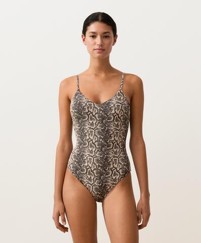 Купальник с V-образным вырезом и регулируемой застежкой на спине. Съемные чашечки без косточек и трусики средней степени закрытости. Жаккардовая ткань с принтом под змеиную кожу.