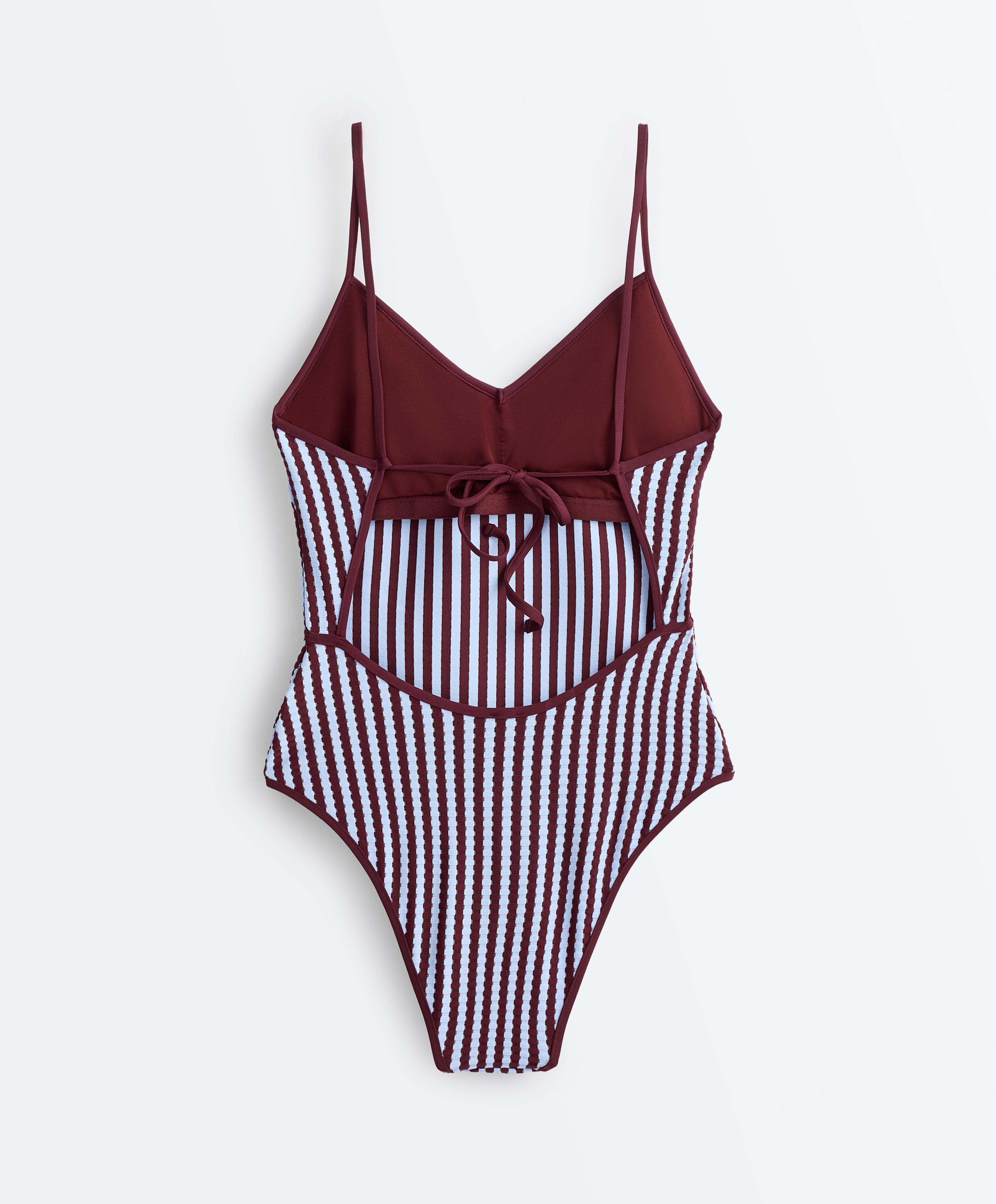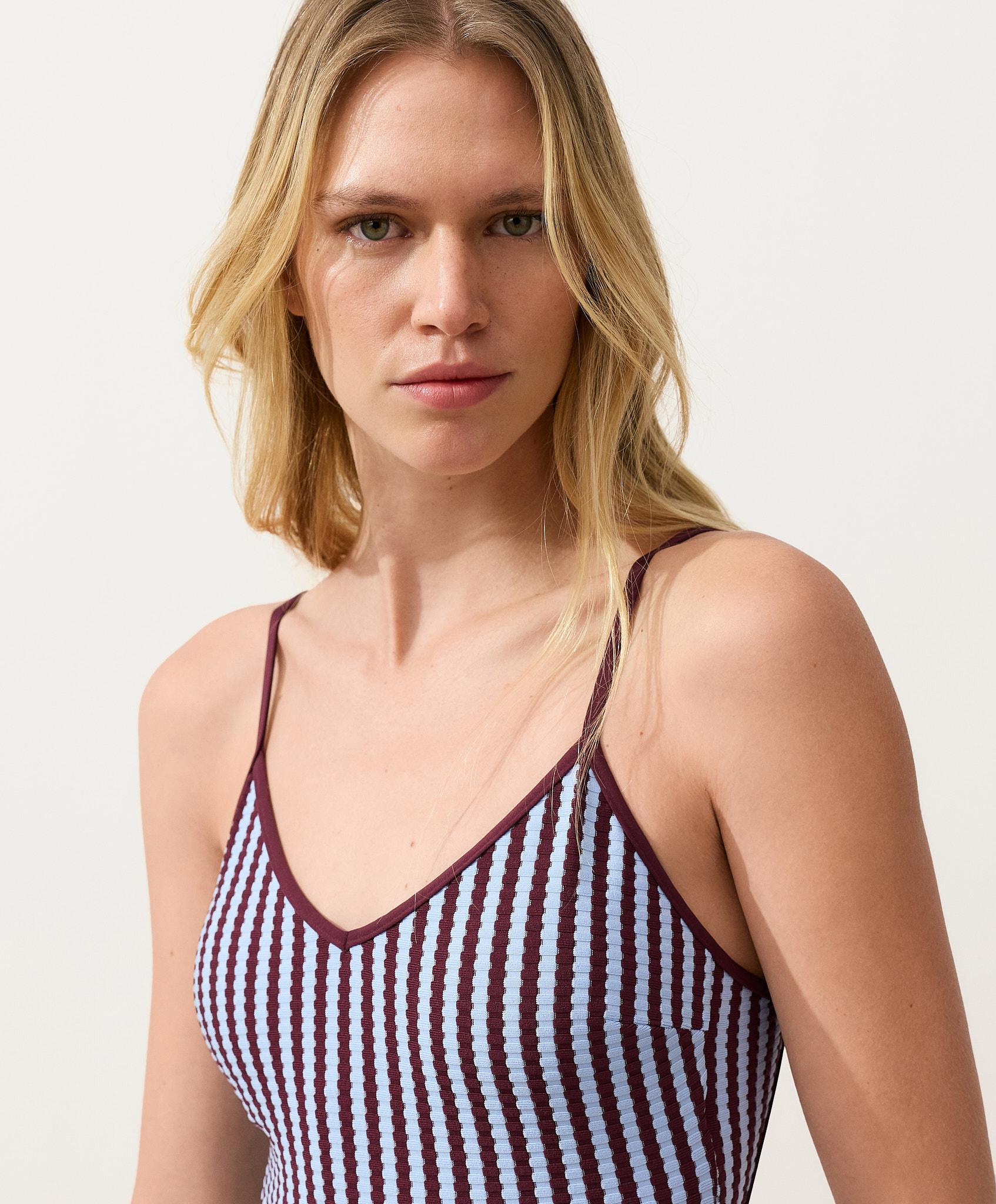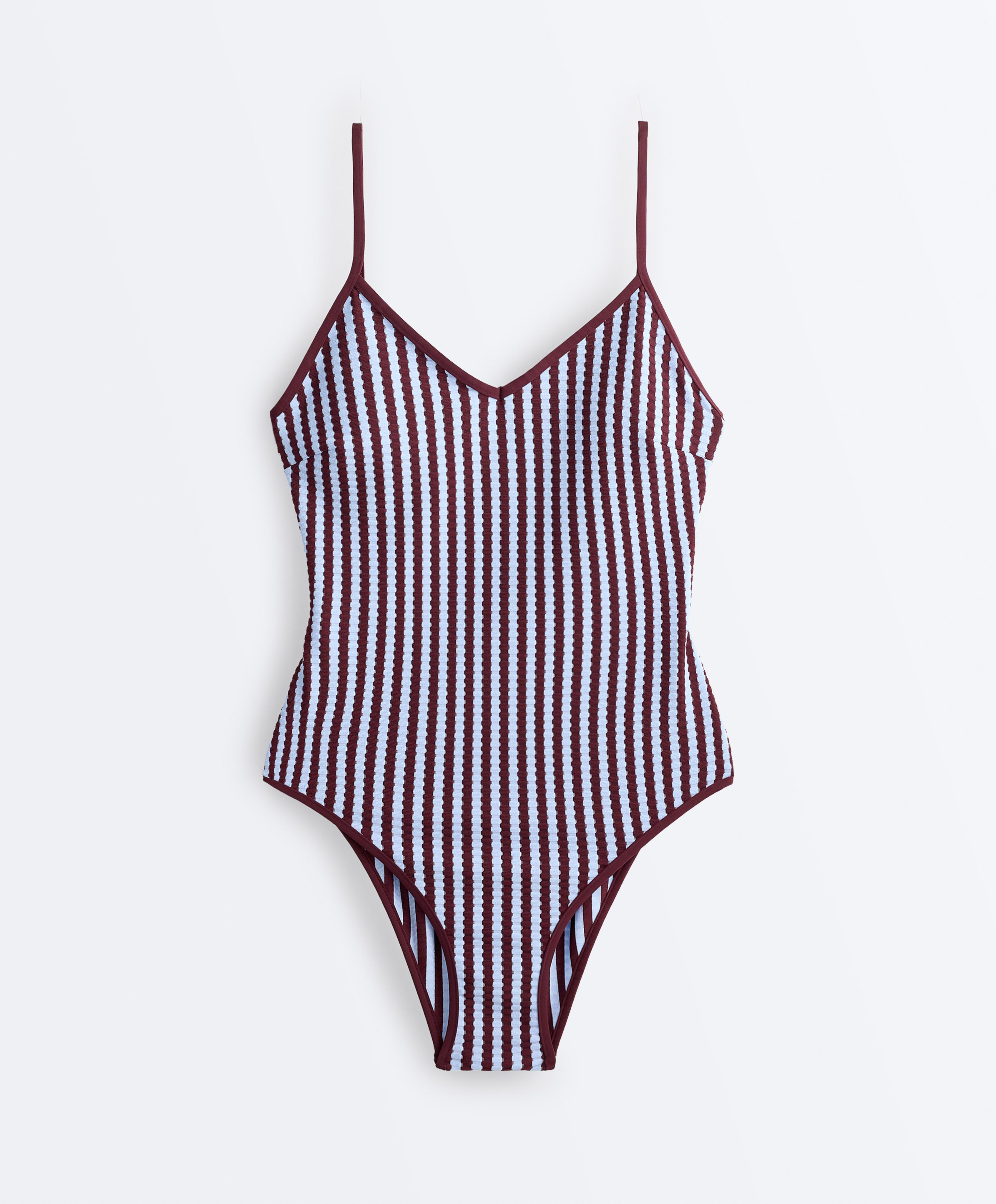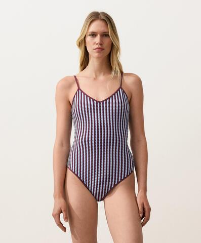 Купальник с V-образным вырезом и регулируемой застежкой на спине. Съемные чашечки, без косточек, средней степени закрытости. Текстурированная ткань с двухцветным полосатым узором.