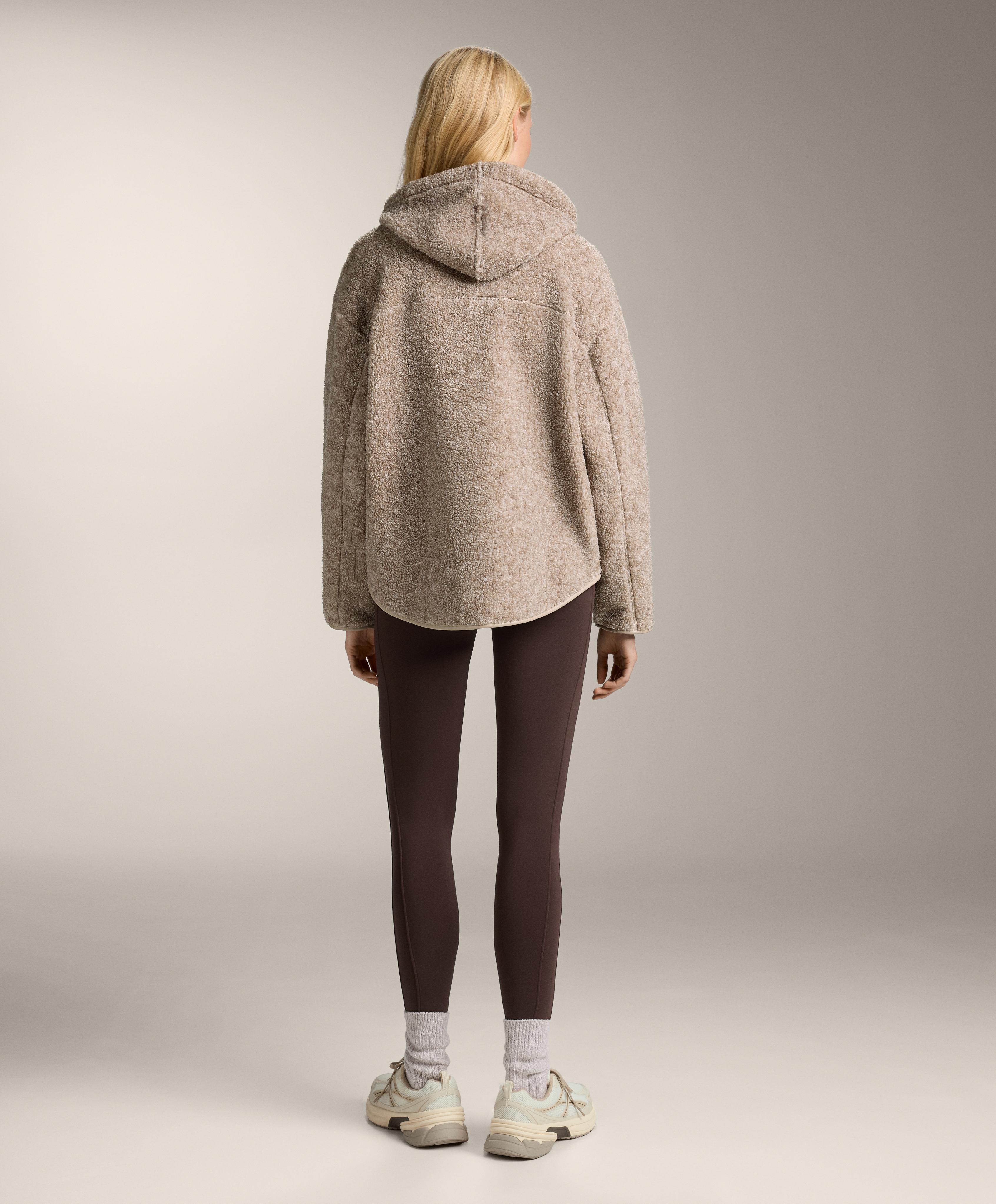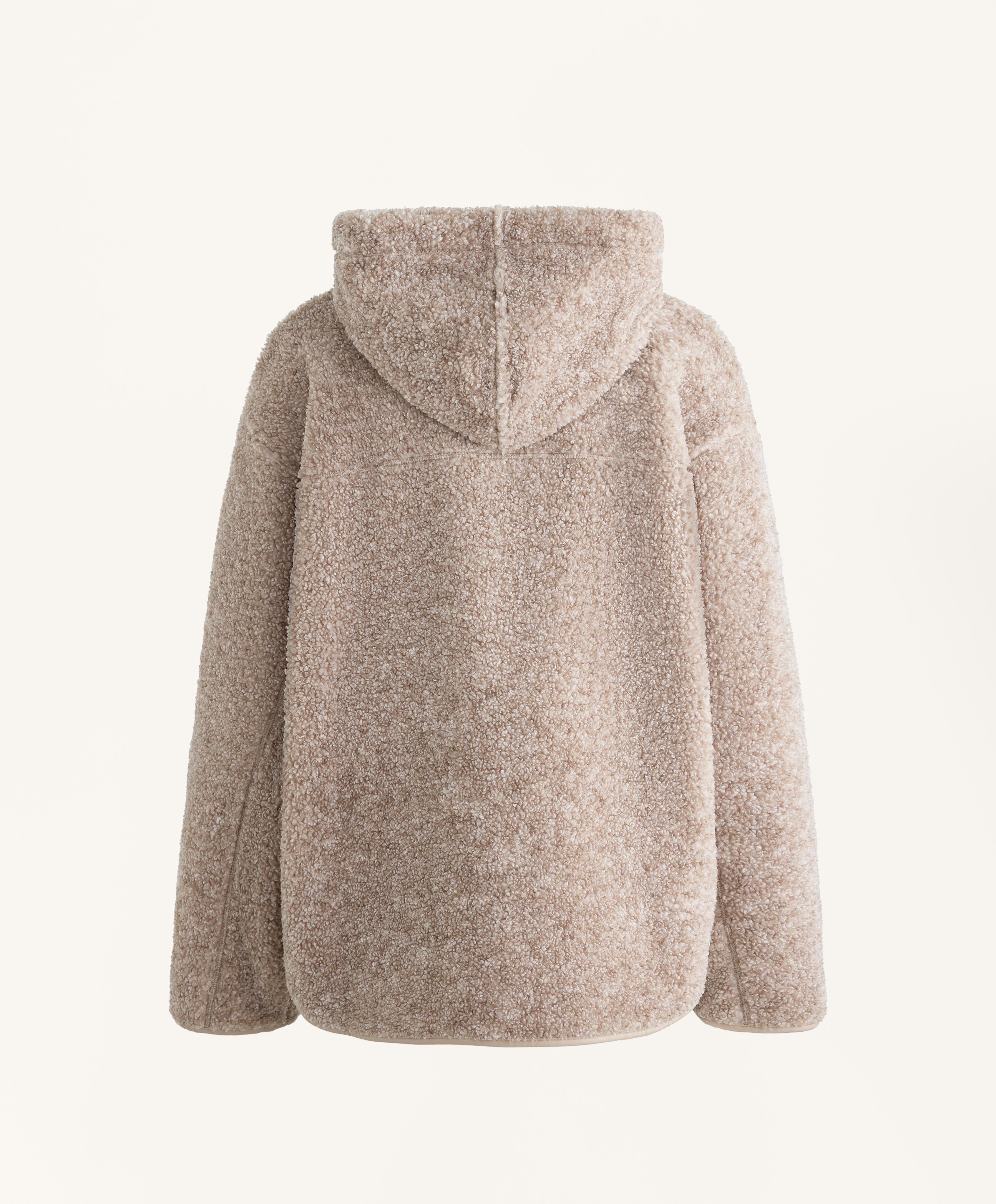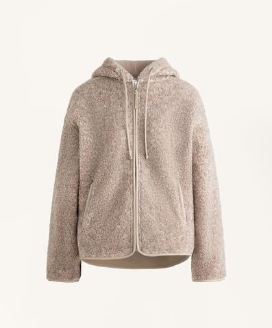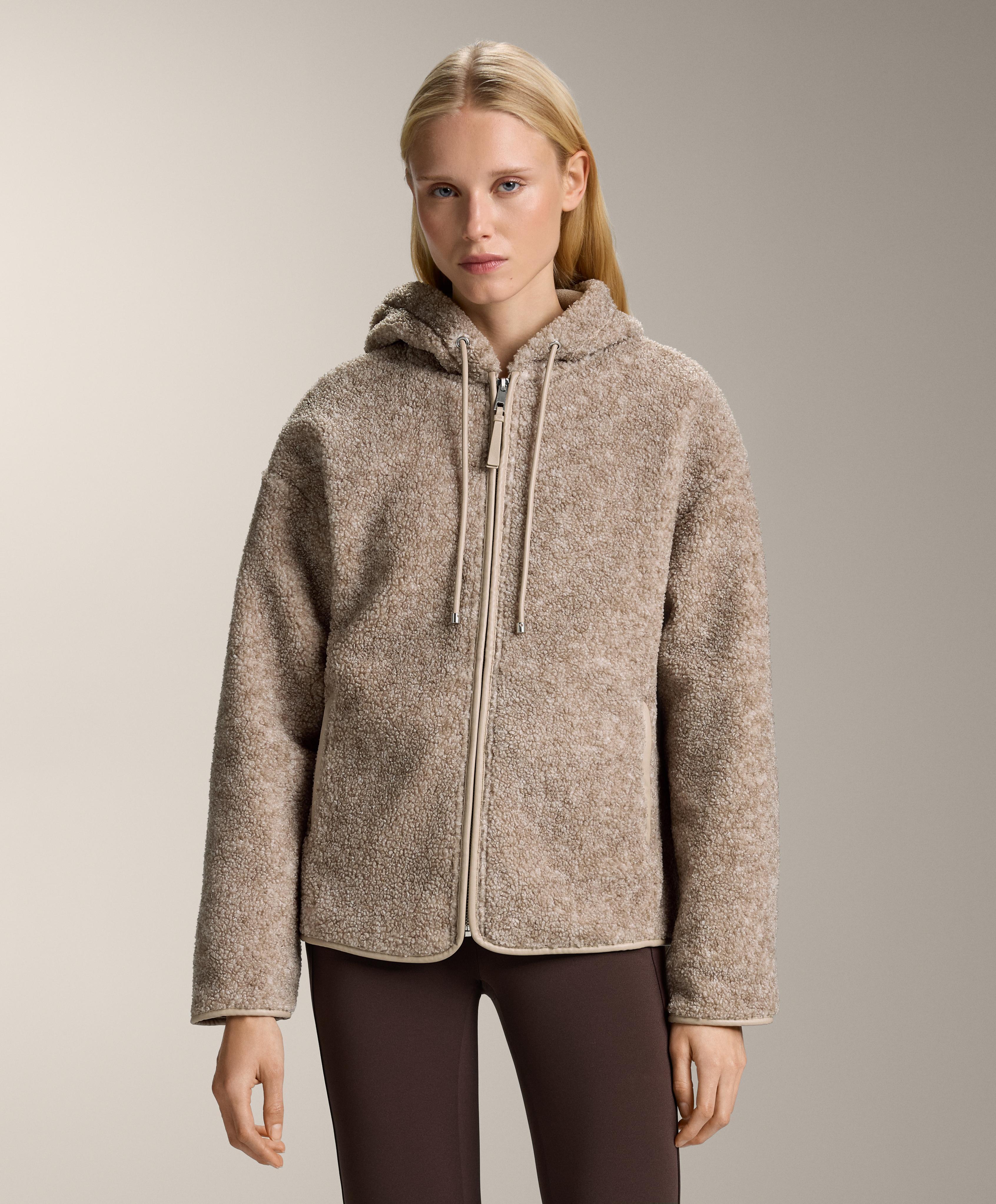 Куртка из искусственной овчины с капюшоном, регулируемым шнурком, и застежкой-молнией спереди. Передние карманы на молнии и начес с внутренней стороны. Дышащая и износостойкая ткань.