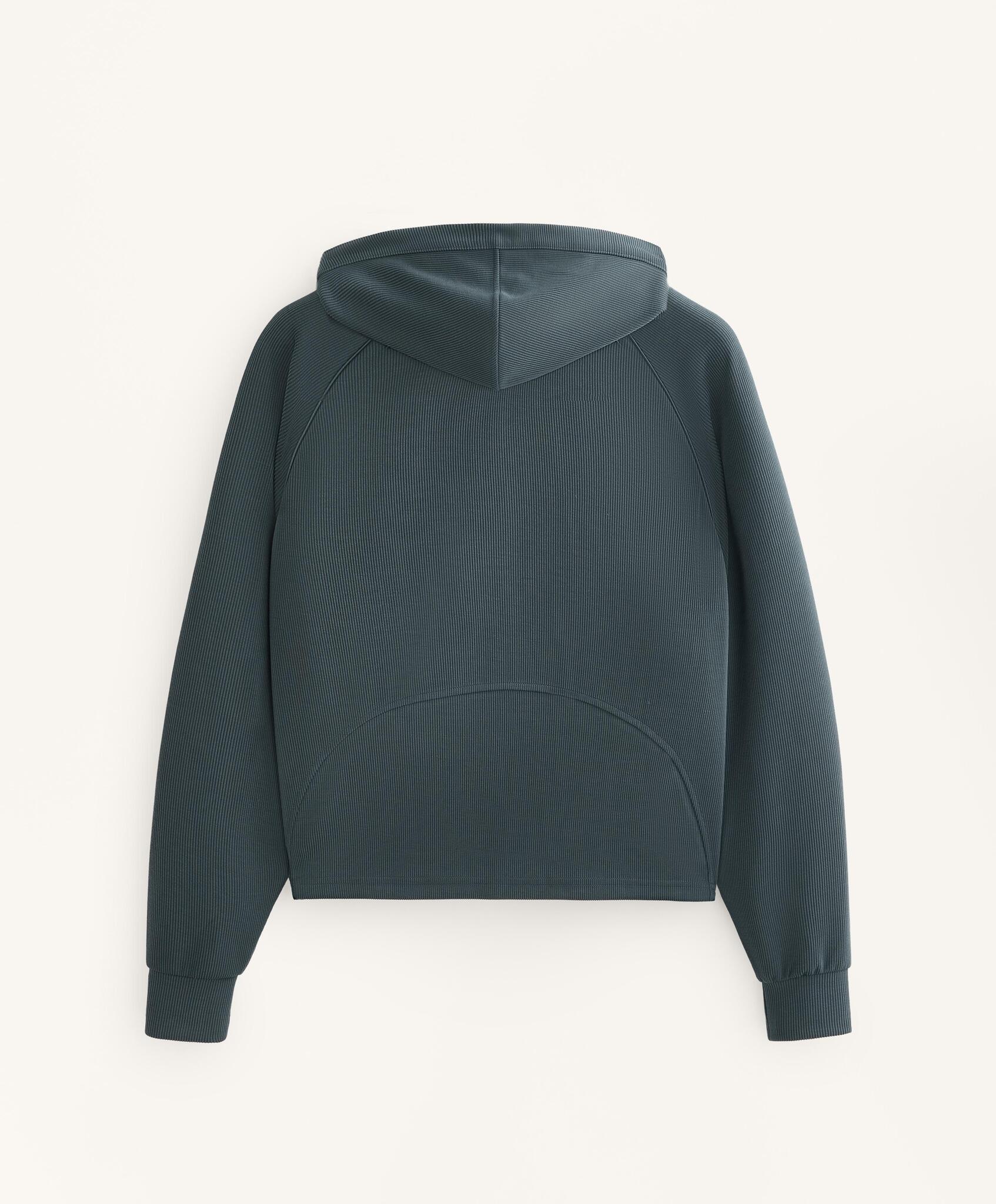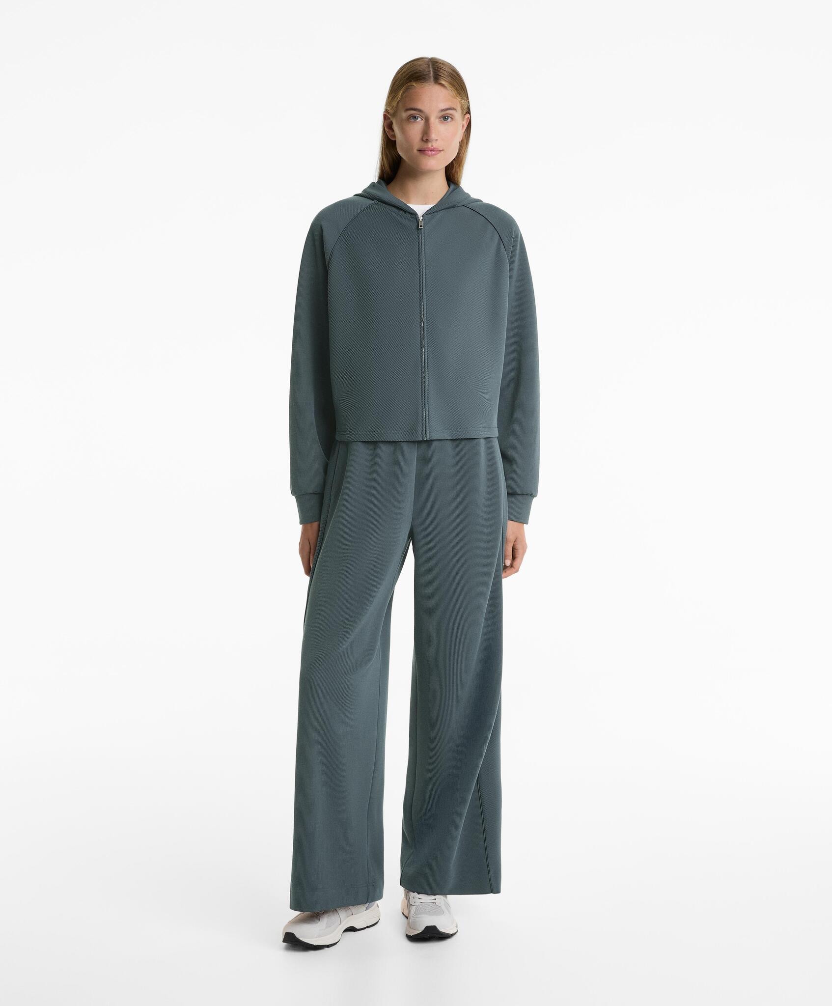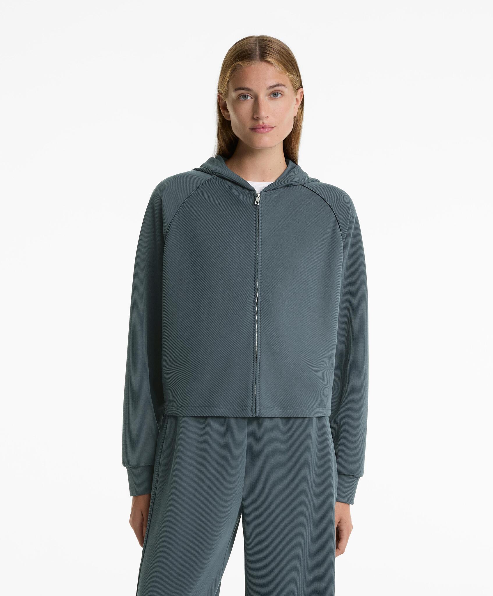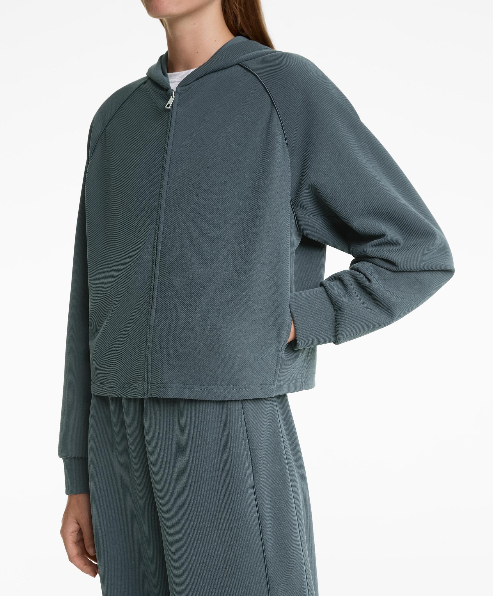 Куртка с длинным рукавом, капюшоном и молнией спереди. С кантом и передними карманами. Ткань в рубчик с содержанием модала 29 %.