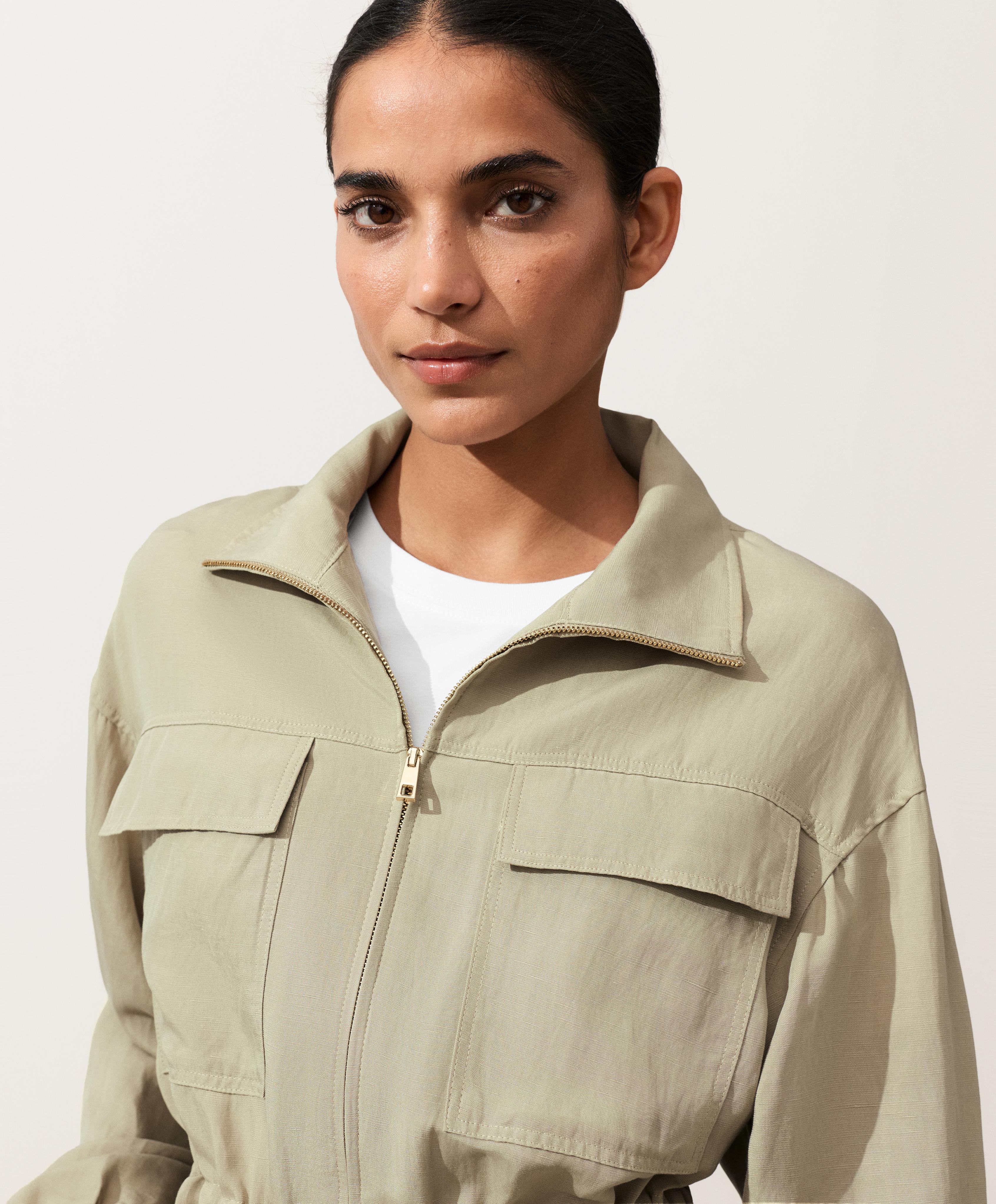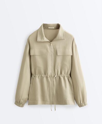 Куртка с высоким воротником и застежкой-молнией спереди. Присборенная талия регулируется шнурком. Ткань: смесь лиоцелла и 24% льна.