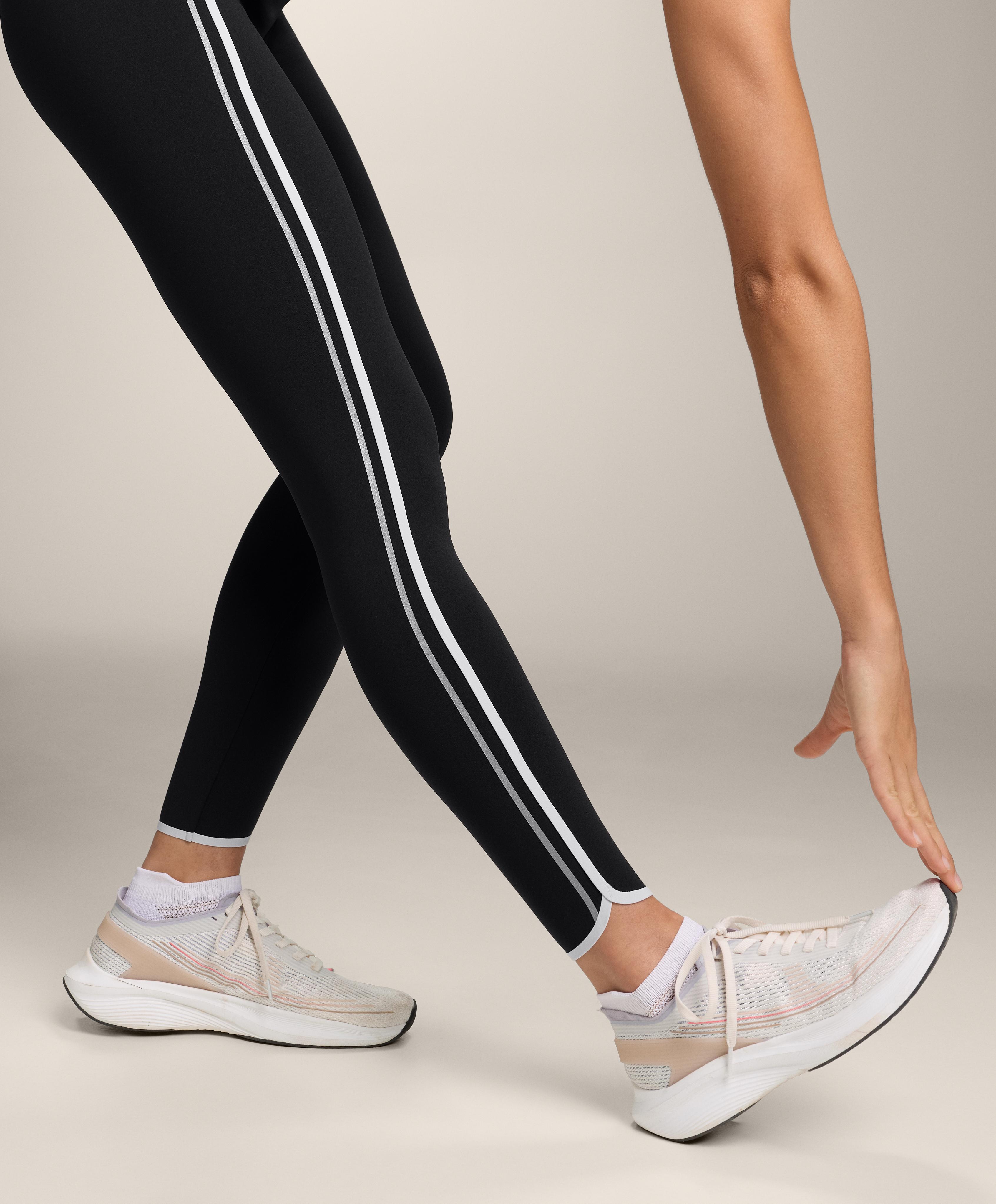 Компрессионные леггинсы с высокой талией и длиной до щиколотки, обеспечивающие поддержку и утягивание во время самых интенсивных тренировок. Широкий силиконизированный пояс без бесшовной передней части. Утягивающая ткань формирует фигуру и придает ей форму, не стесняя движений. Декоративная окантовка и светоотражающая линия по бокам. Внутренний задний карман. Дышащая, высокоэластичная ткань.