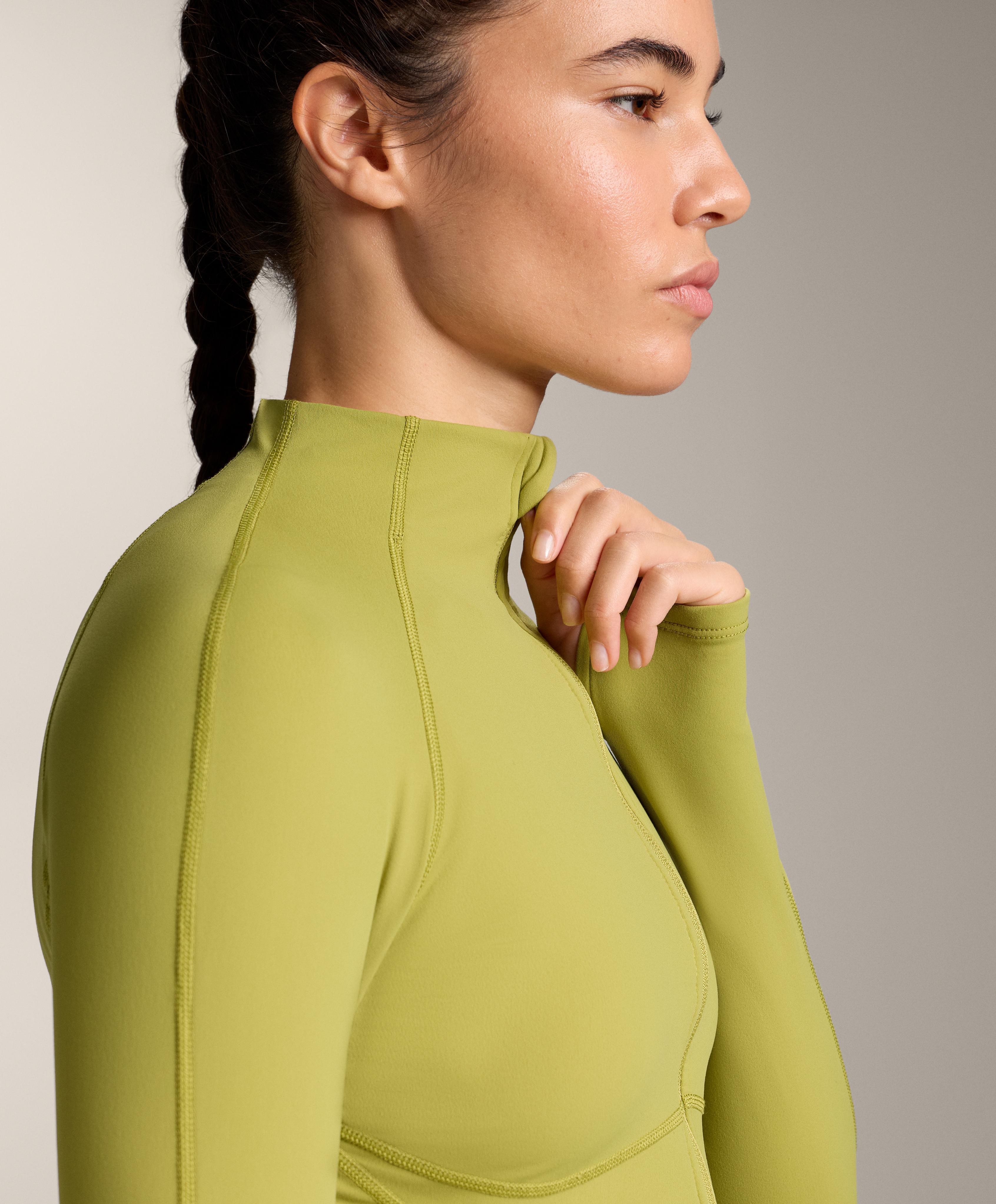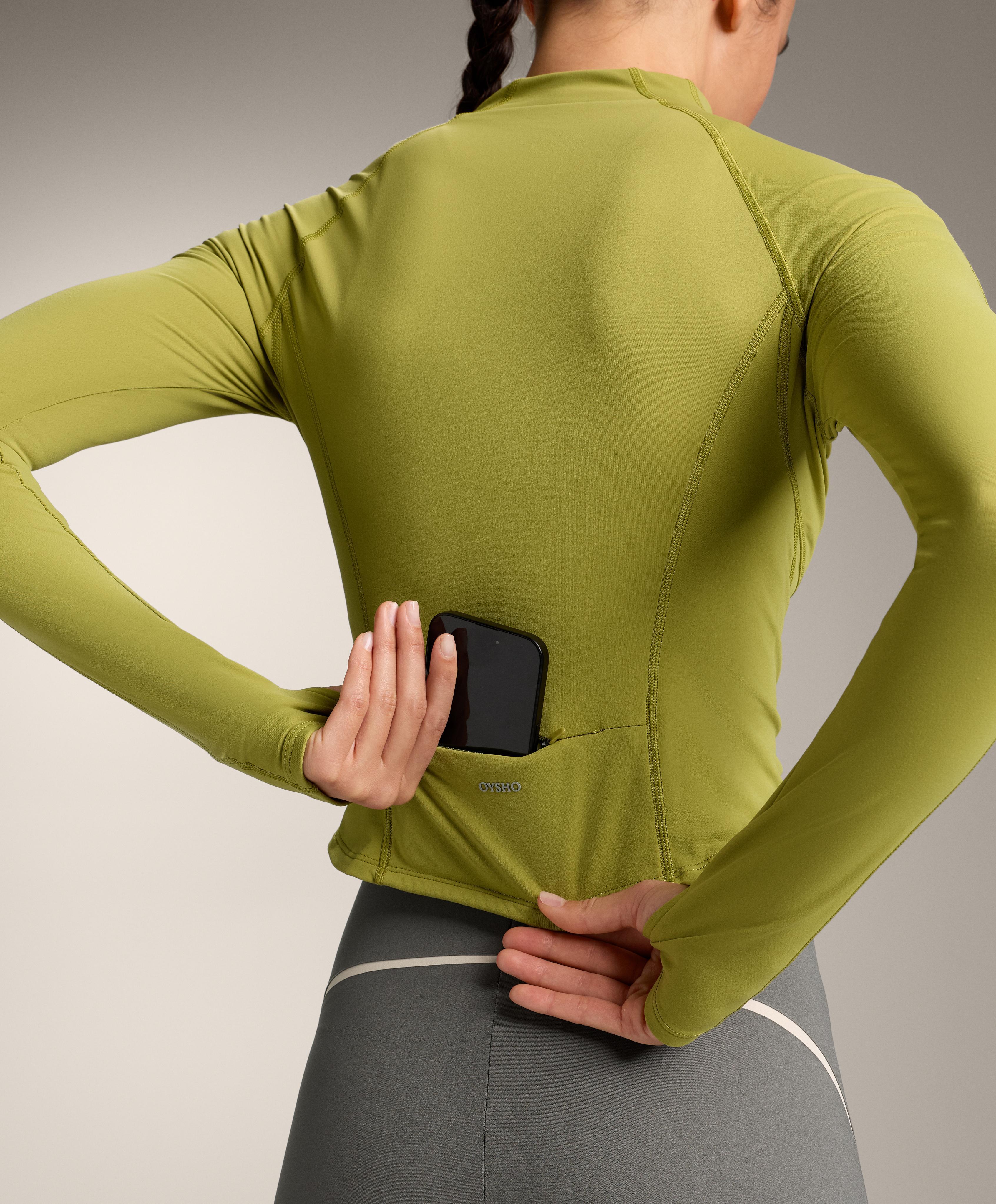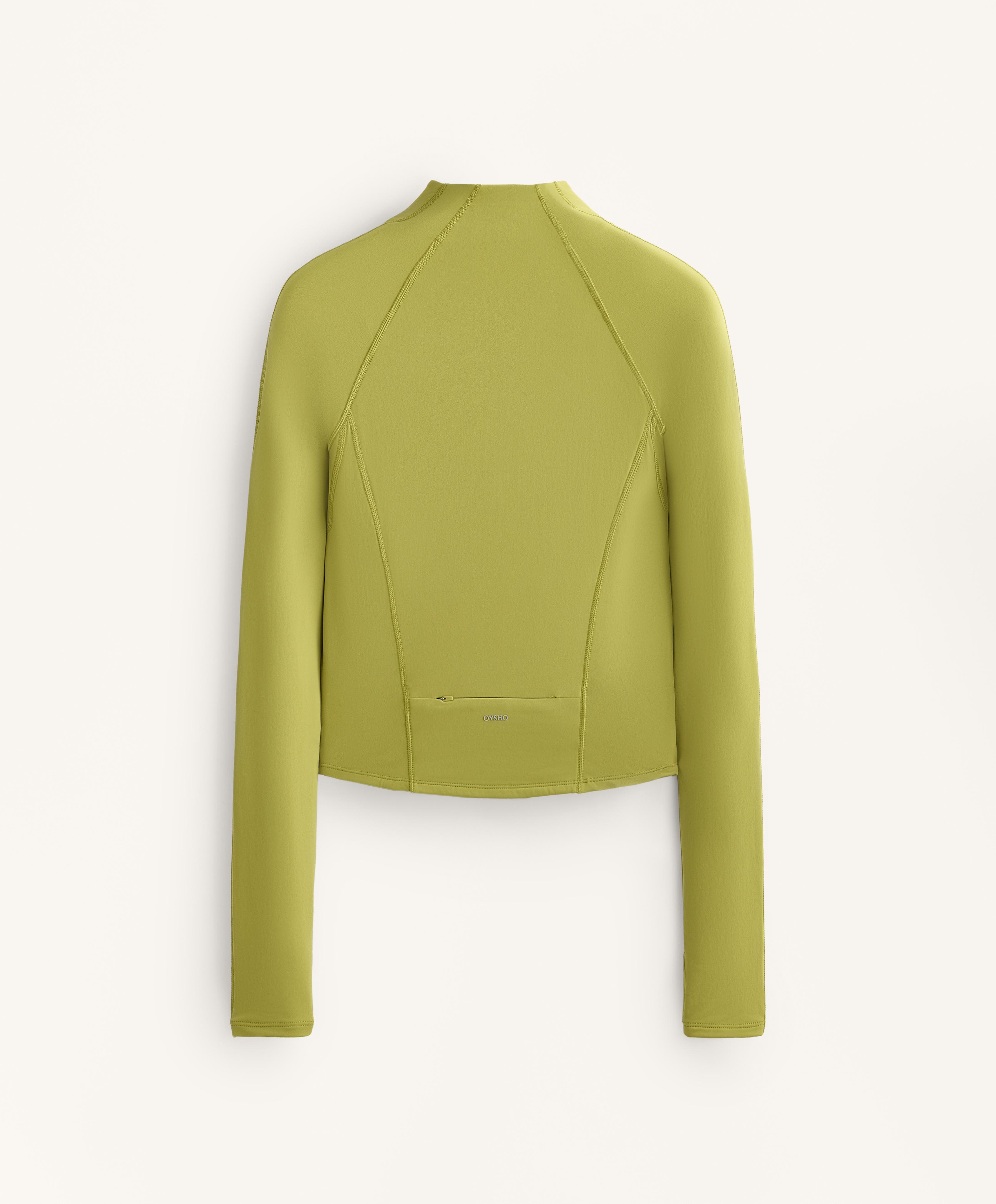 Высокотехнологичная куртка из мягкой ткани с длинными рукавами и застежкой-молнией. Карман на молнии сзади, декоративные швы в тон. В манжетах предусмотрено отверстие для большого пальца, обеспечивающее удобство при движении. Воздухопроницаемая ткань с дезодорирующими свойствами и высокой степенью защиты от ультрафиолетовых лучей UPF 40+. Изделие защищает от холода во время движения при температуре от +16º до -1º (подтверждено испытаниями в лабораторных условиях).