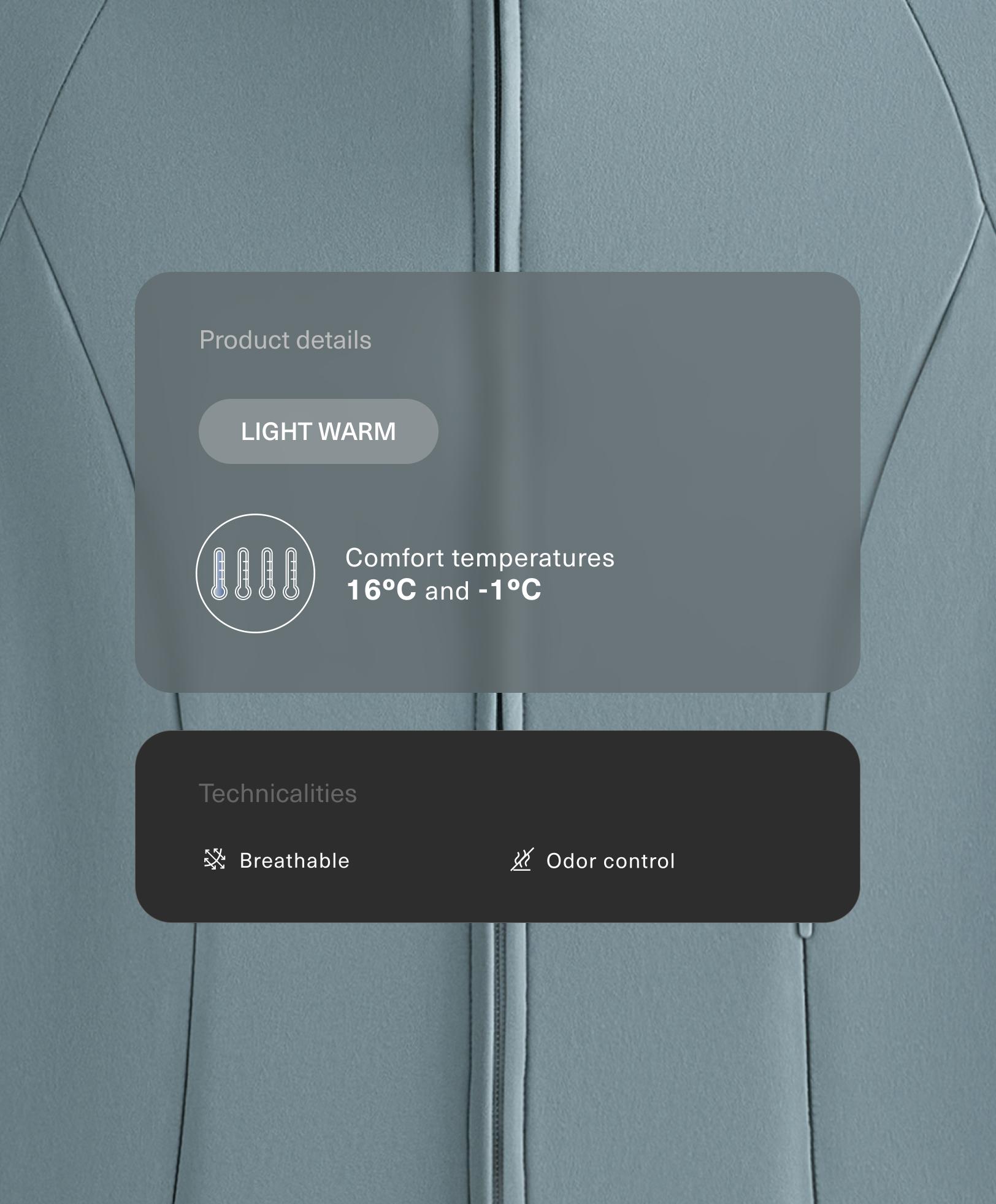 Легкая и теплая высокотехнологичная куртка с застежкой на молнии и боковыми карманами на молнии. Стратегическое отверстие в манжете рукава, позволяющее просунуть большой палец для большей подвижности. Деталь перекрещивающихся боковых швов. Воздухопроницаемая ткань с контролем запаха. Это изделие сертифицировано для ношения при температуре +16°C при низкой активности и -1°C при умеренной активности, что было подтверждено стандартным испытанием с имитацией ветра 0,4 м/с при ношении футболки с длинными рукавами и высоким воротником, брюк, нижнего белья, носков, обуви, перчаток и вязаной шапки.