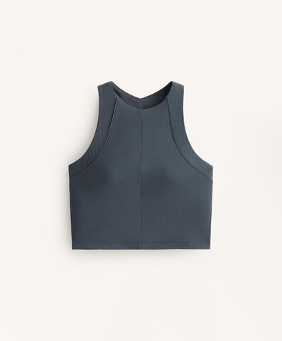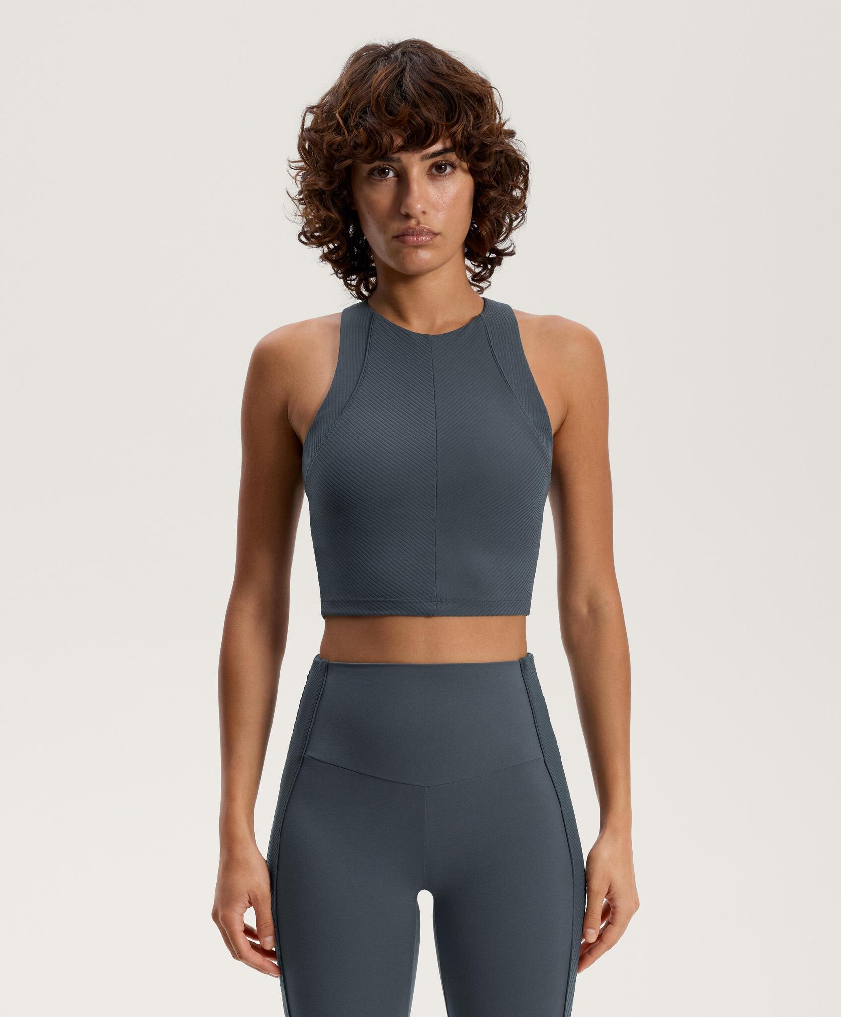 Майка Comfortlux в рубчик со встроенным бюстгальтером и съемными чашками с мягкой подкладкой. V-образный вырез на спине. Дышащая, высокопрочная, быстросохнущая ткань.