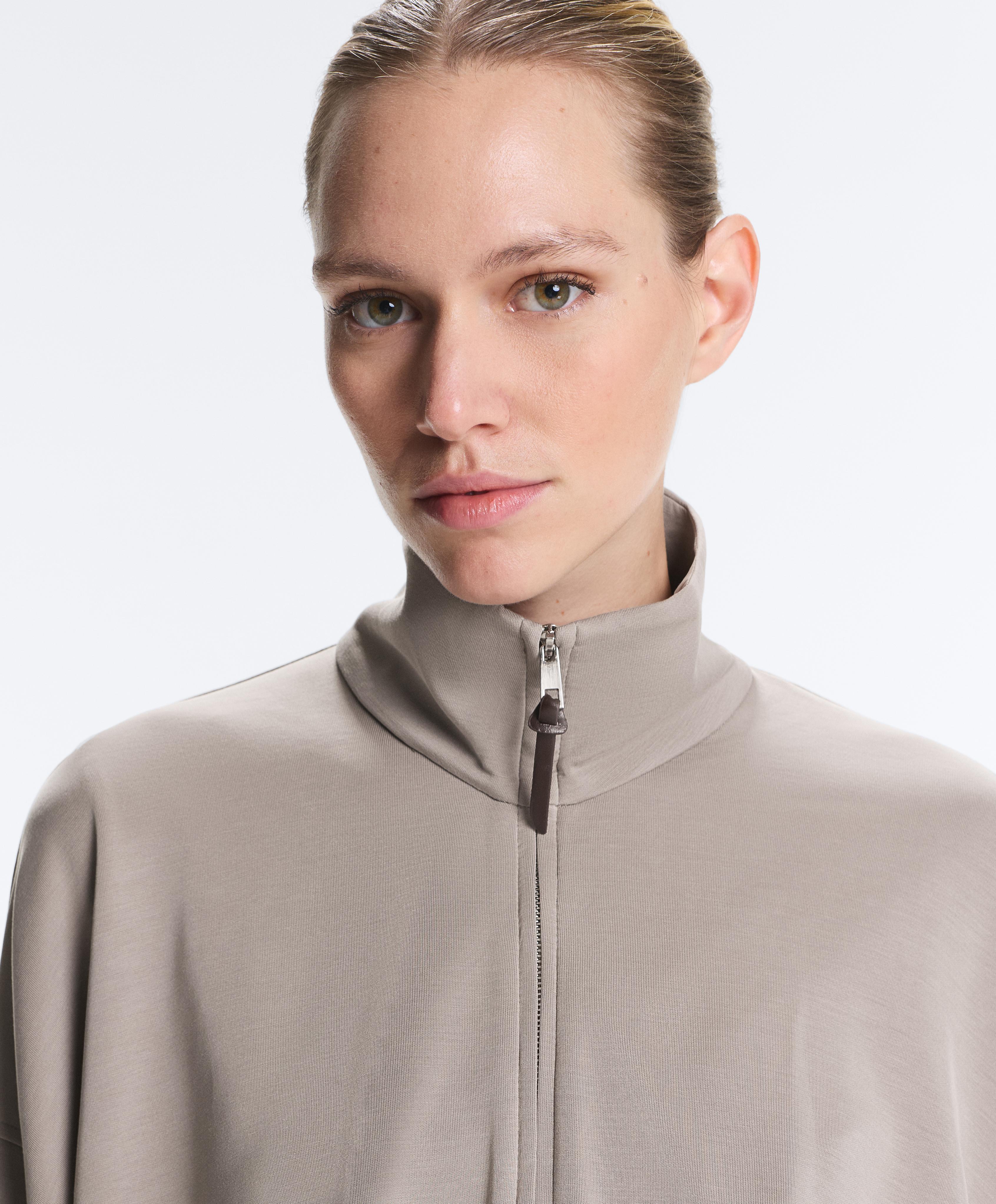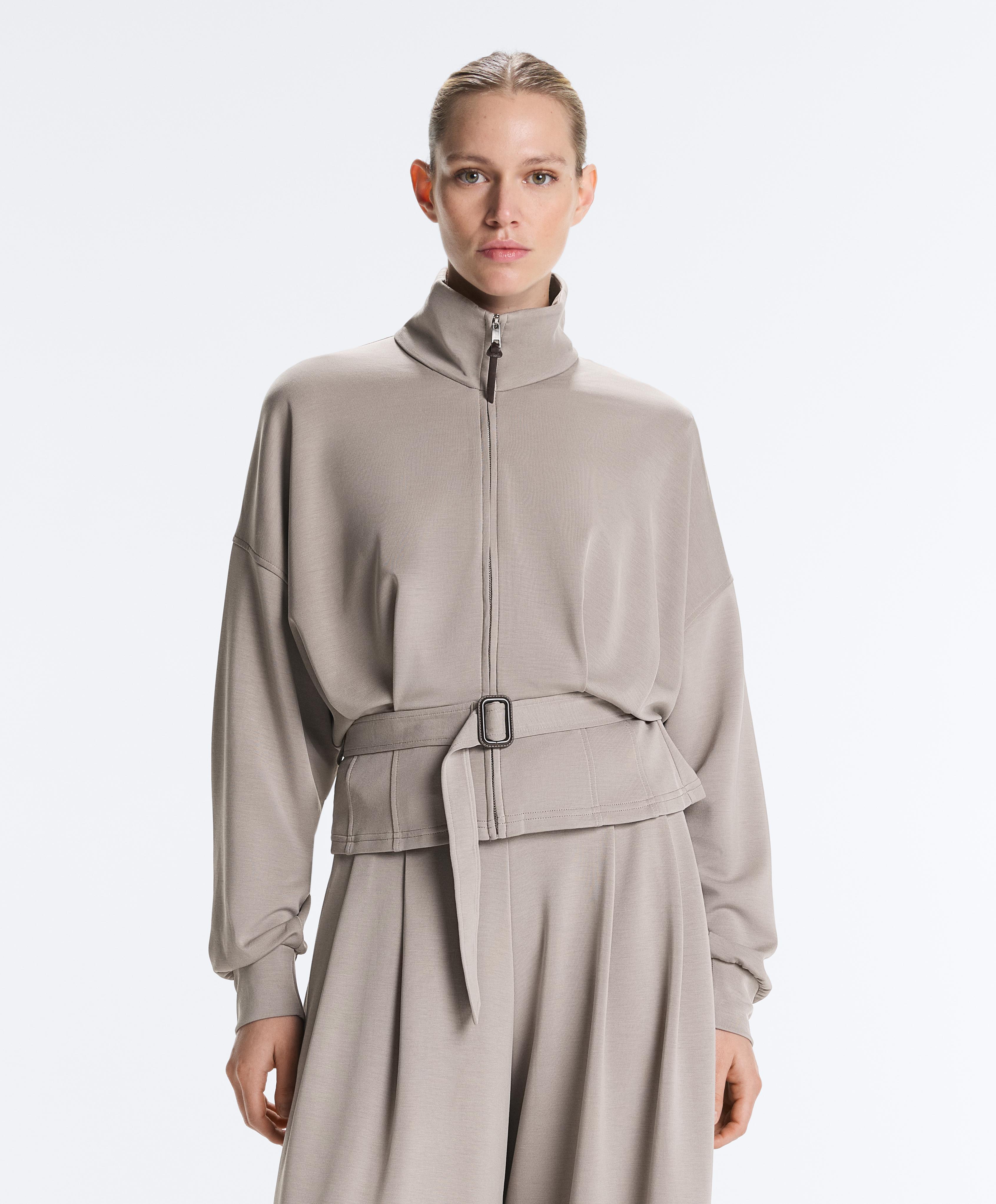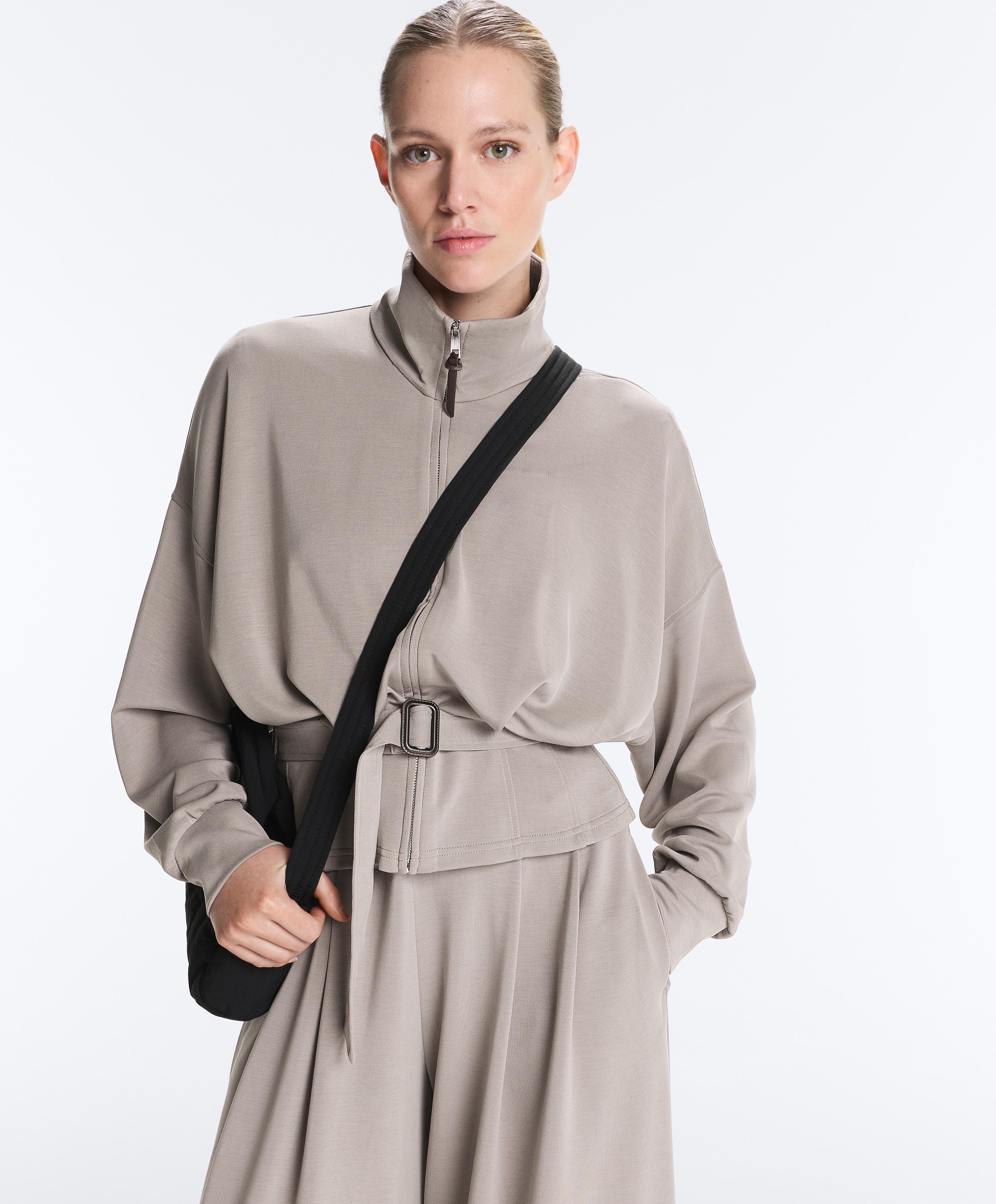 Куртка с корсетной отделкой, облегающая талию. С высоким воротником и застежкой-молнией спереди. Регулируемый пояс. Дышащая ткань из модала, очень мягкая на ощупь.