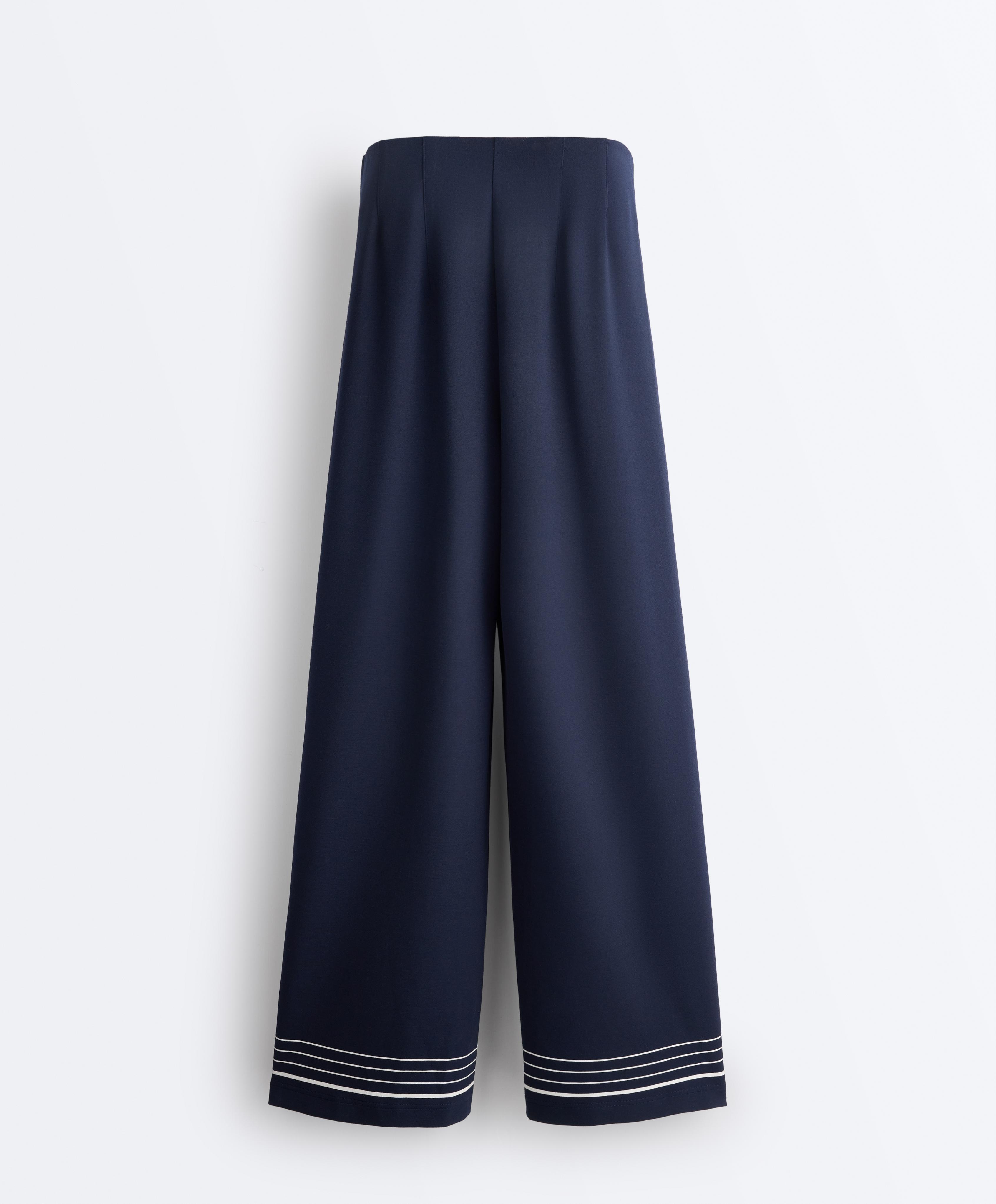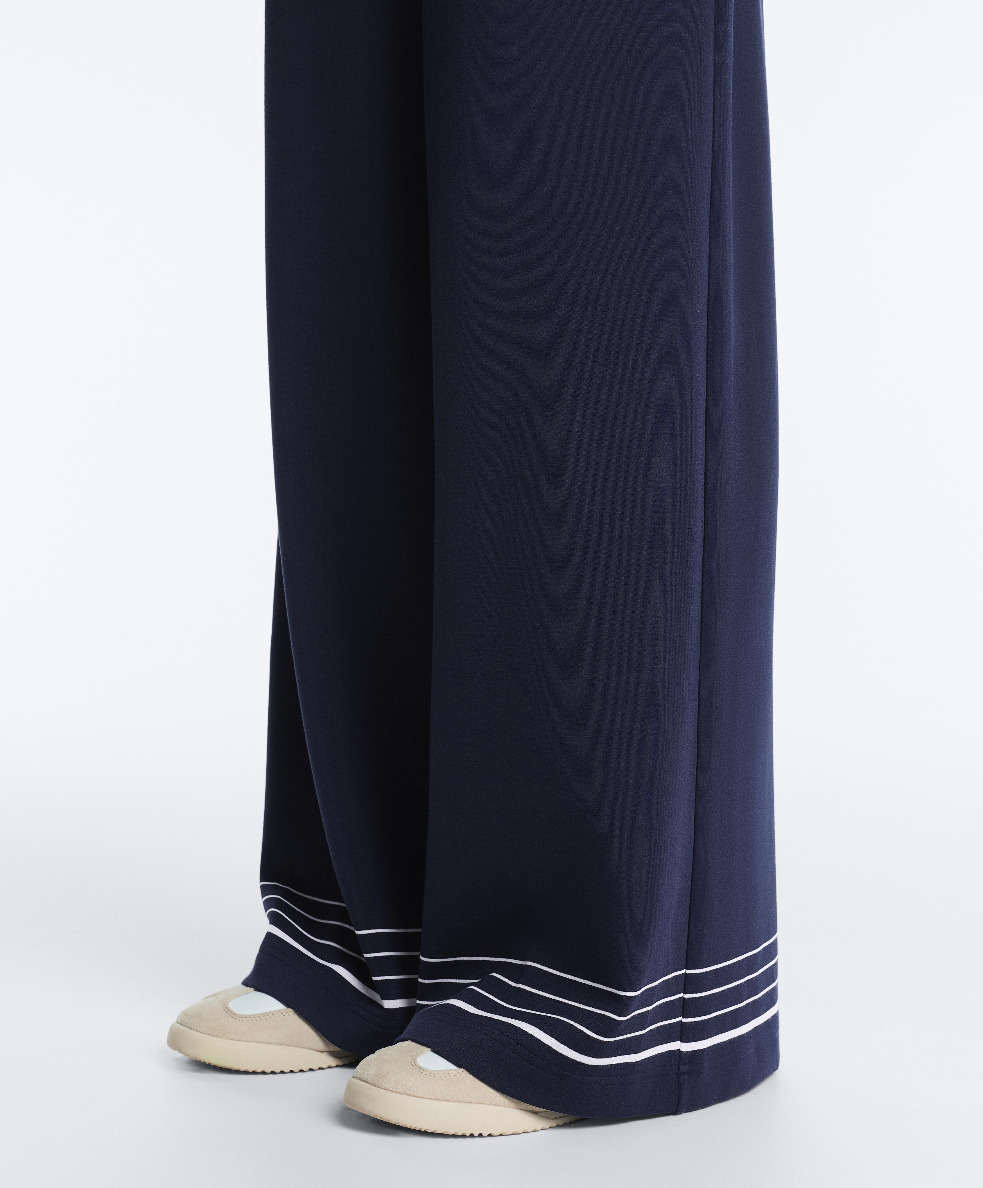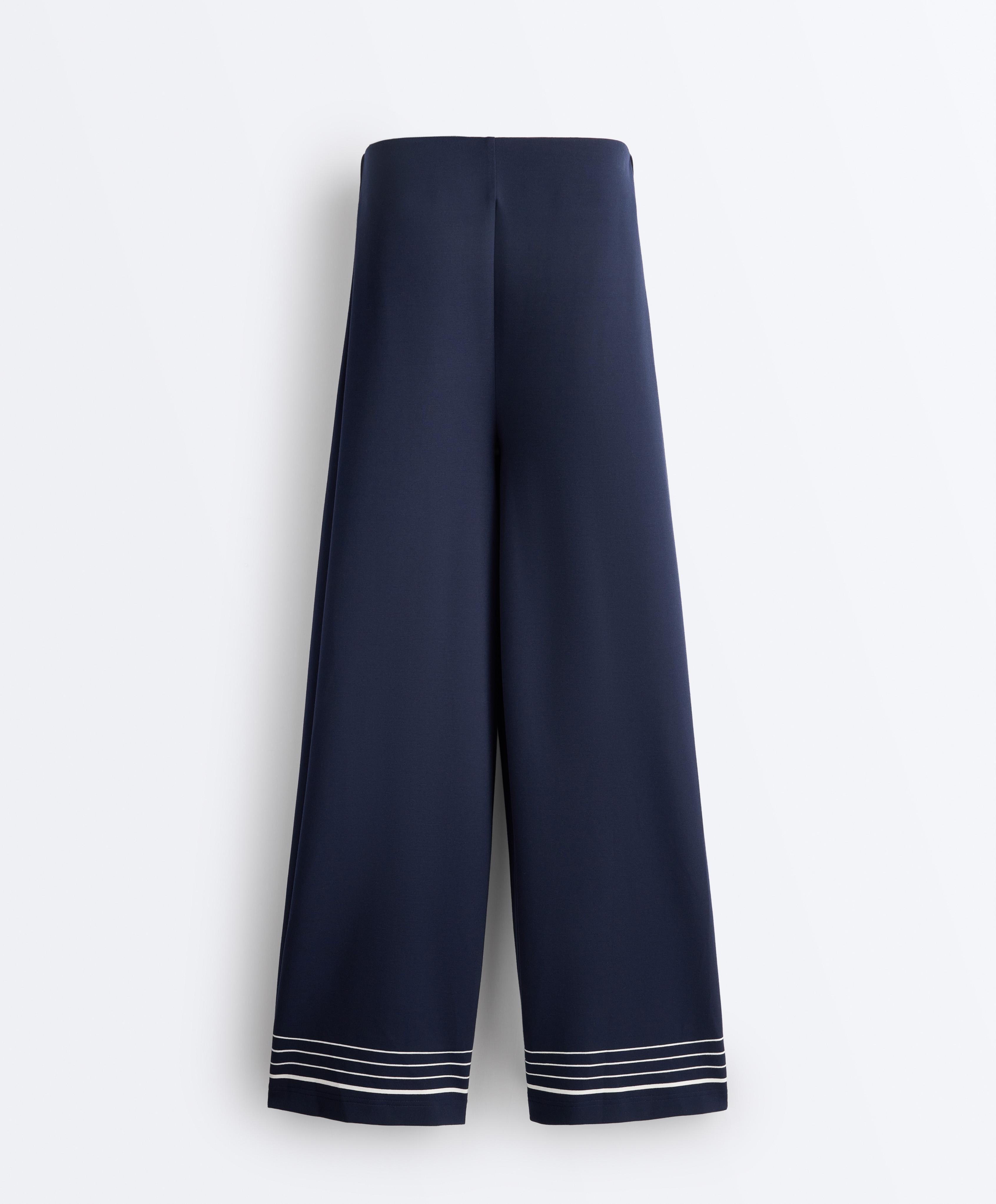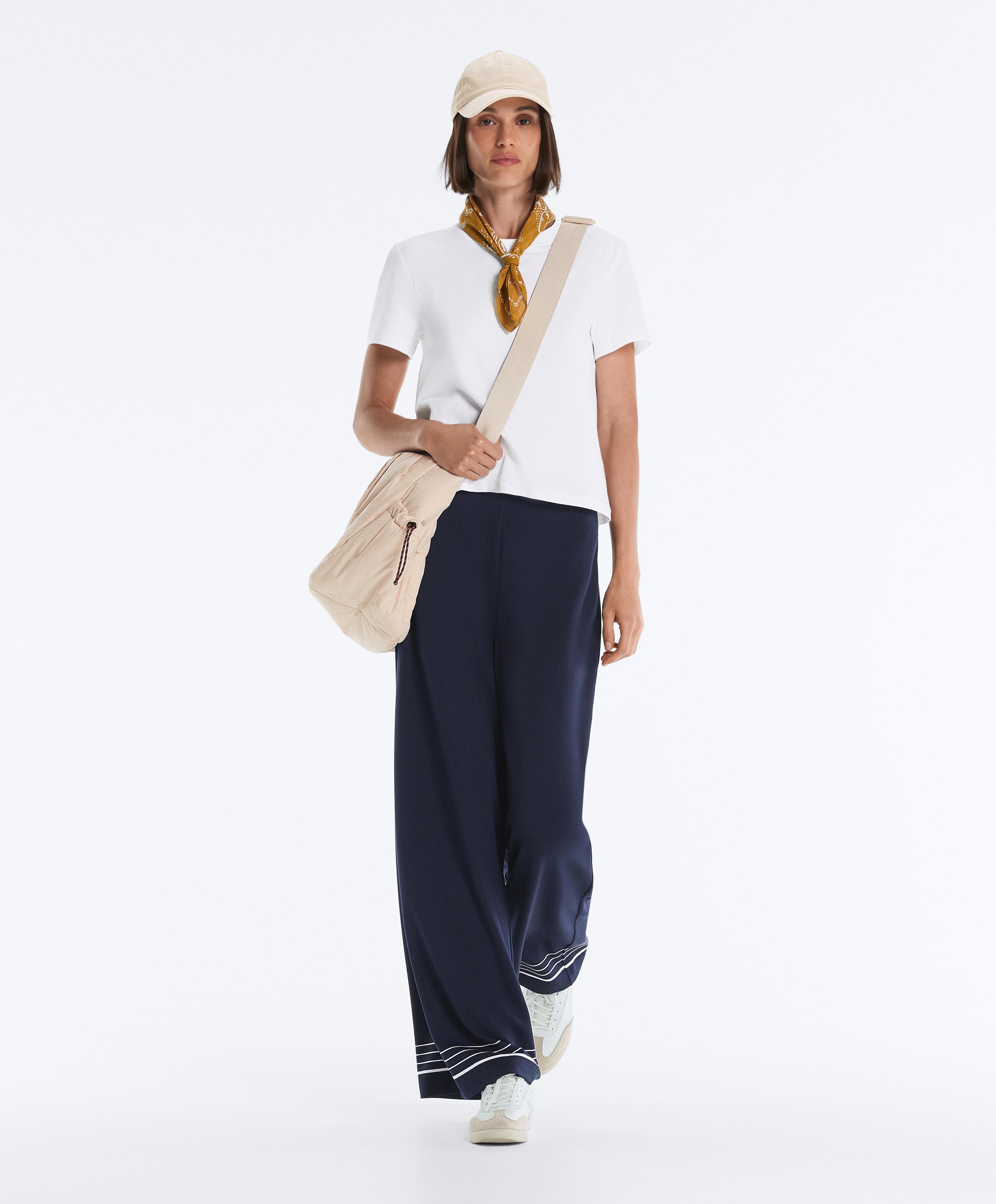 Длинные прямые брюки с высокой посадкой, регулируемым эластичным поясом и передними карманами. Детали в морскую полоску внизу штанин. Дышащая ткань из модала, очень мягкая на ощупь.