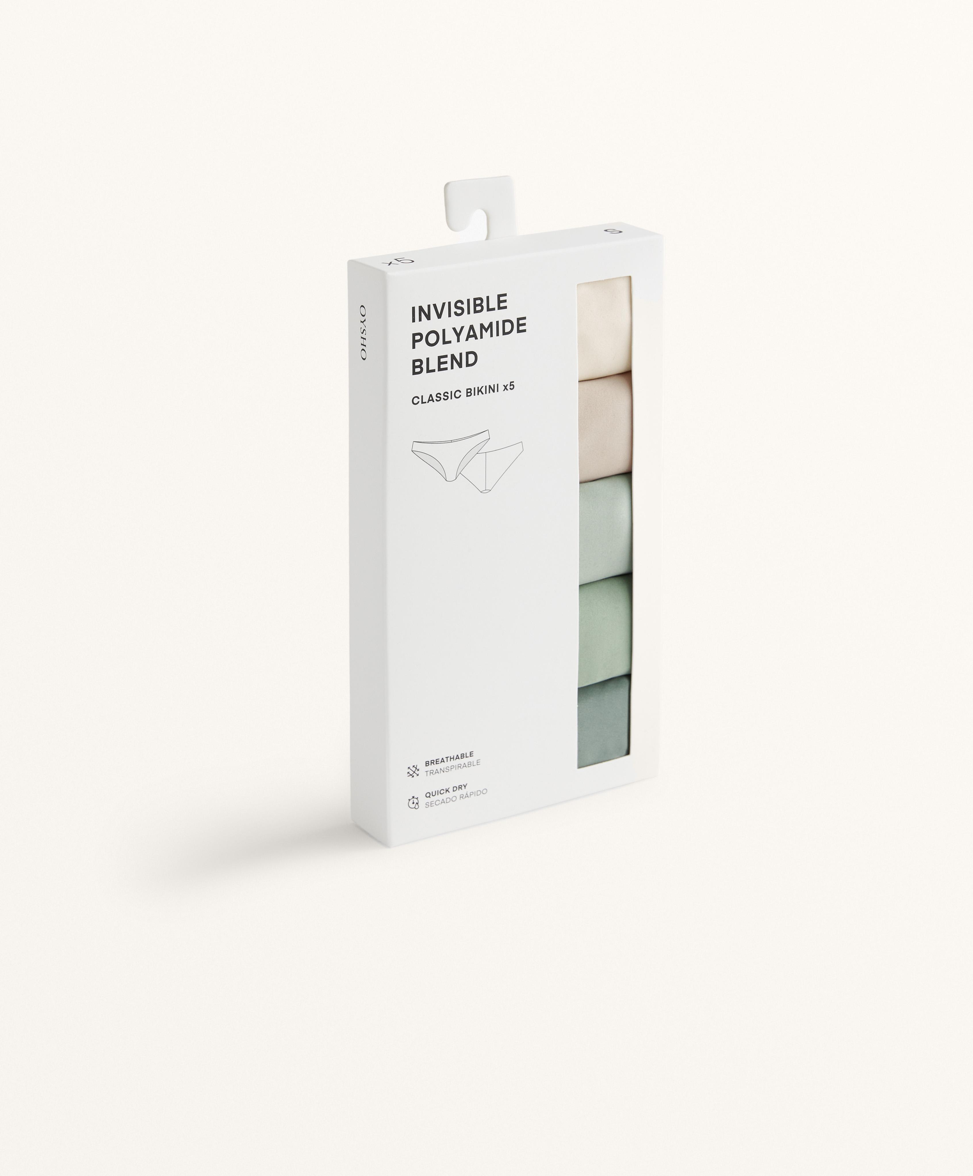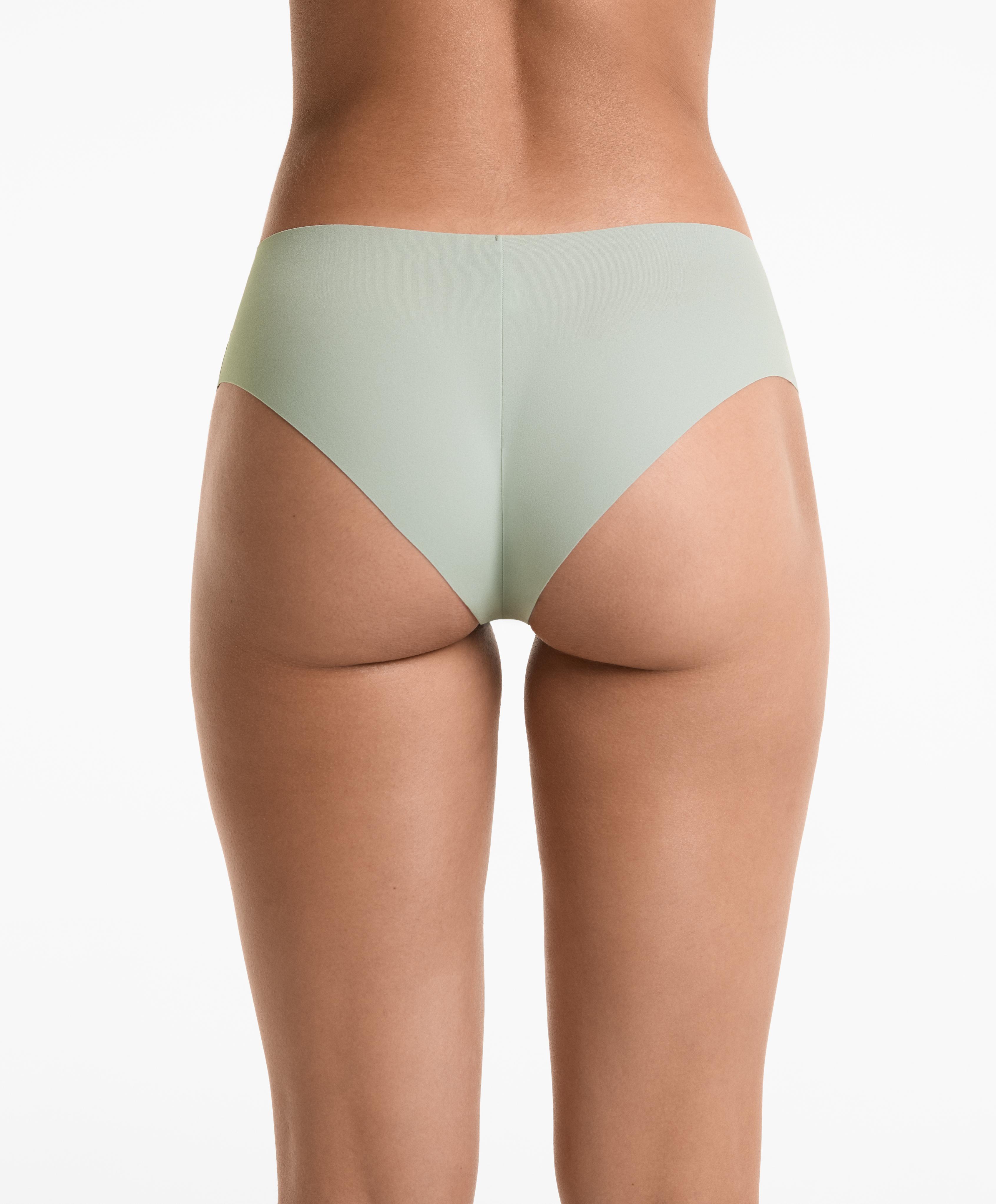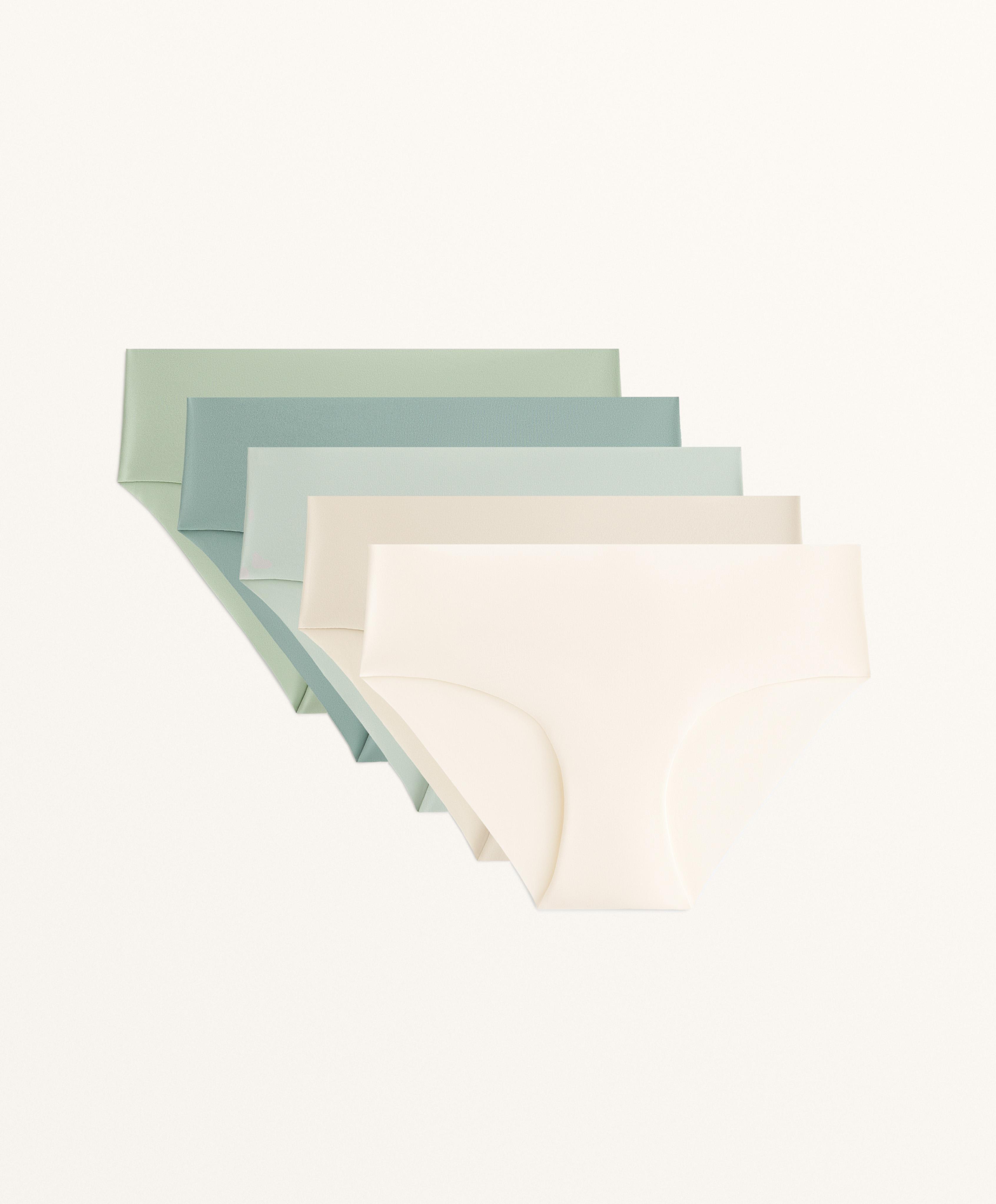 Упаковка из пяти трусиков-хипстеров разных цветов из бесшовного полиамидного смесового материала с лазерной обработкой краев. Быстросохнущая, дышащая ткань.