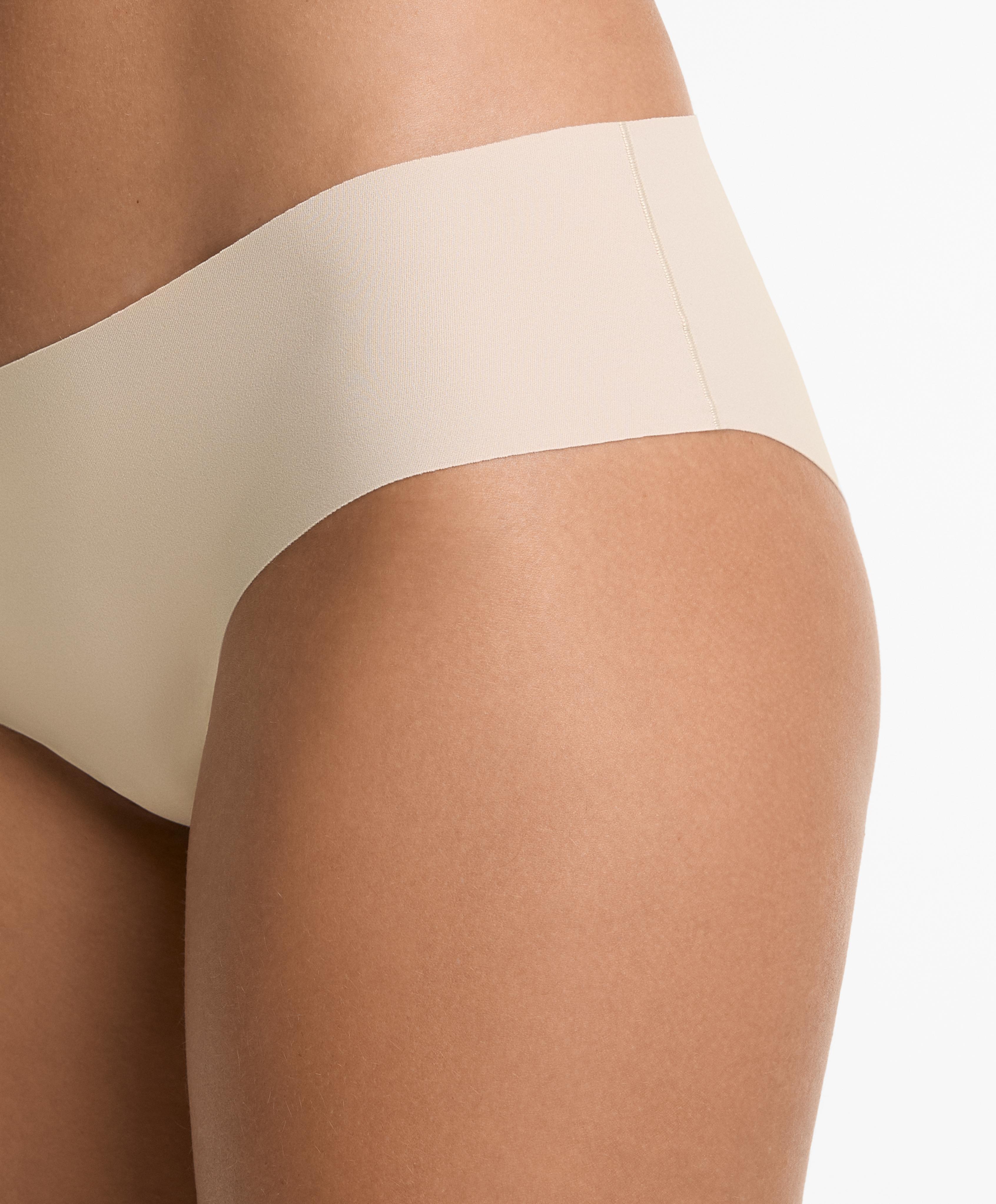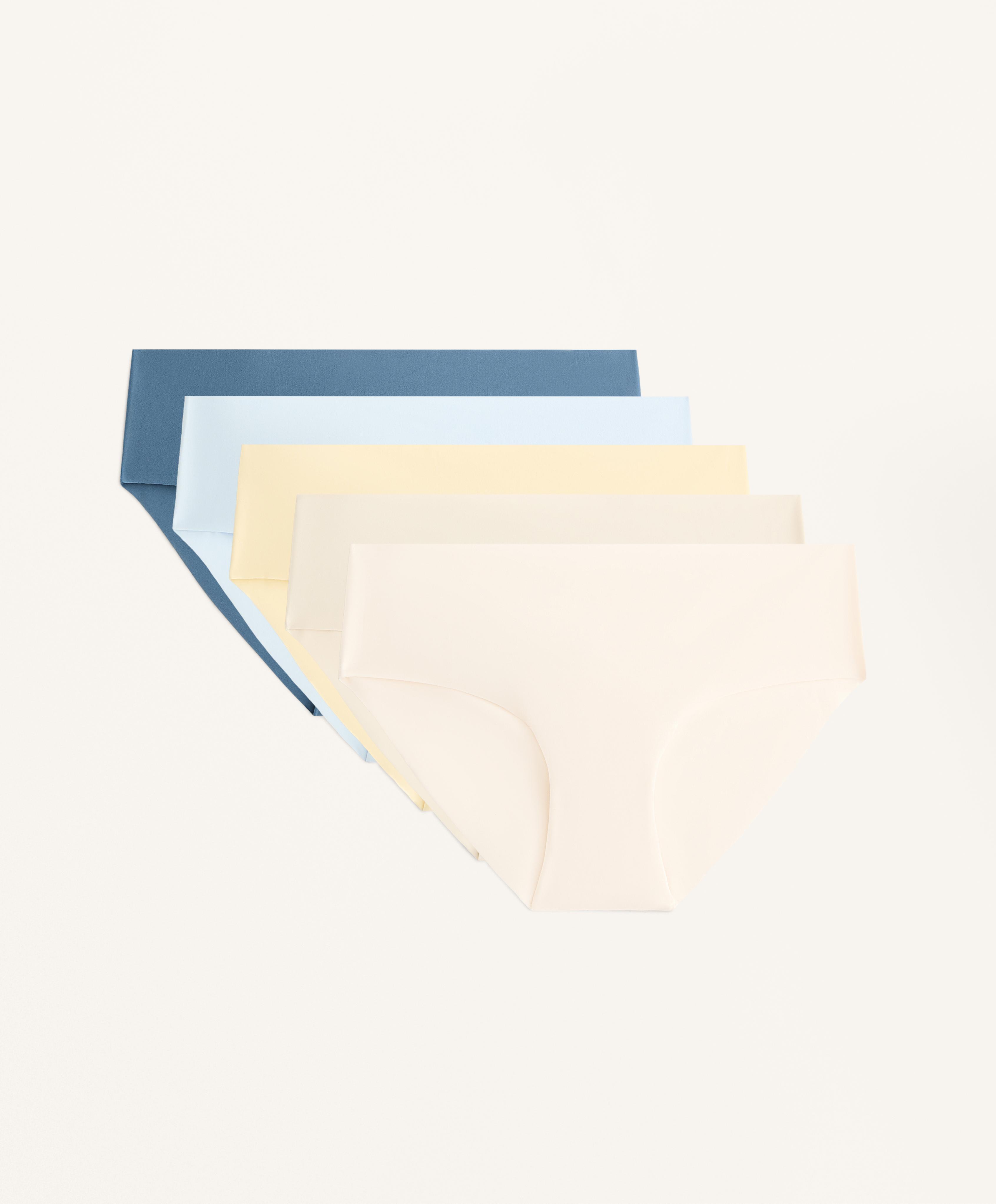 Упаковка из пяти трусиков-хипстеров разных цветов из бесшовного полиамидного смесового материала с лазерной обработкой краев. Быстросохнущая, дышащая ткань.