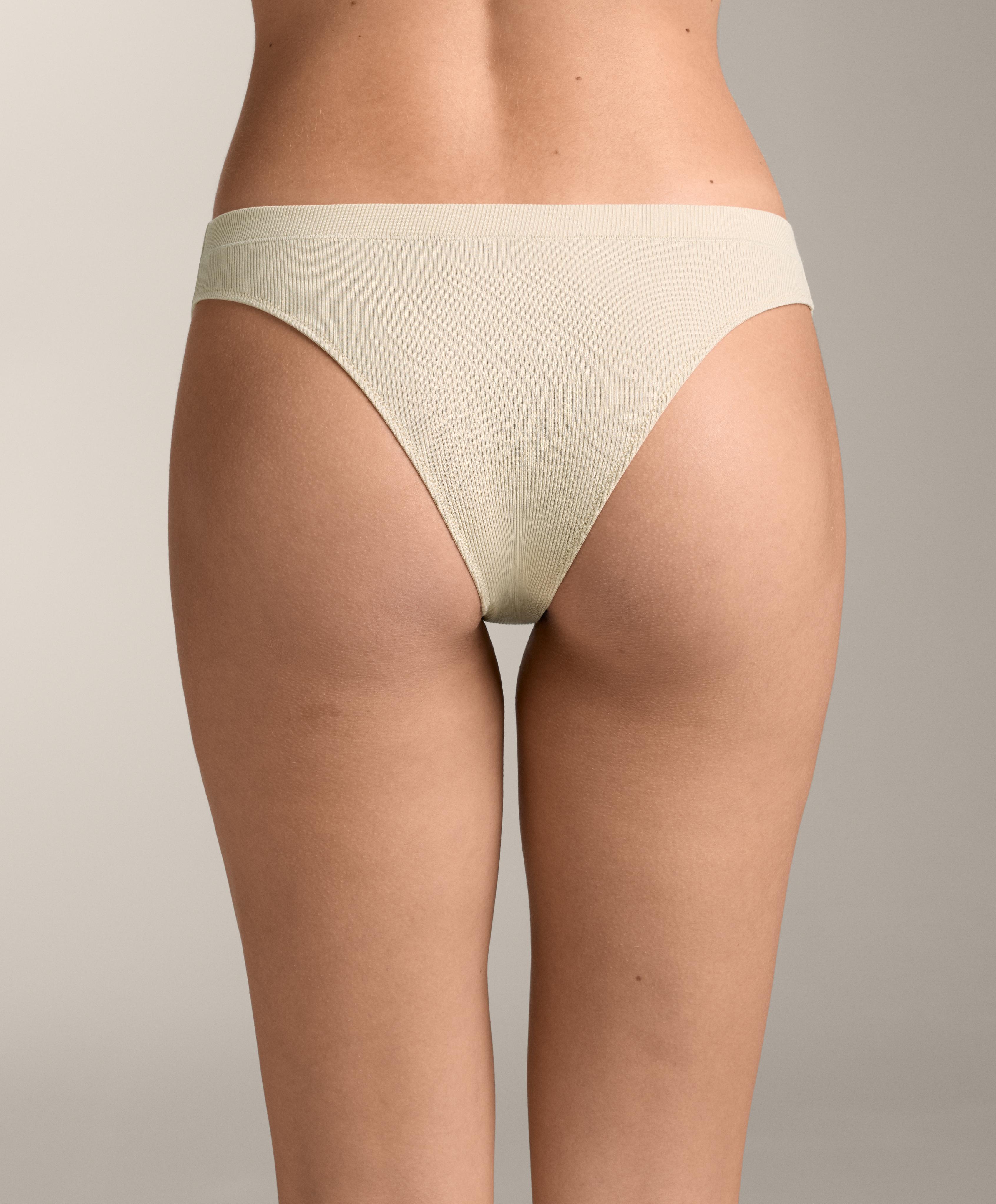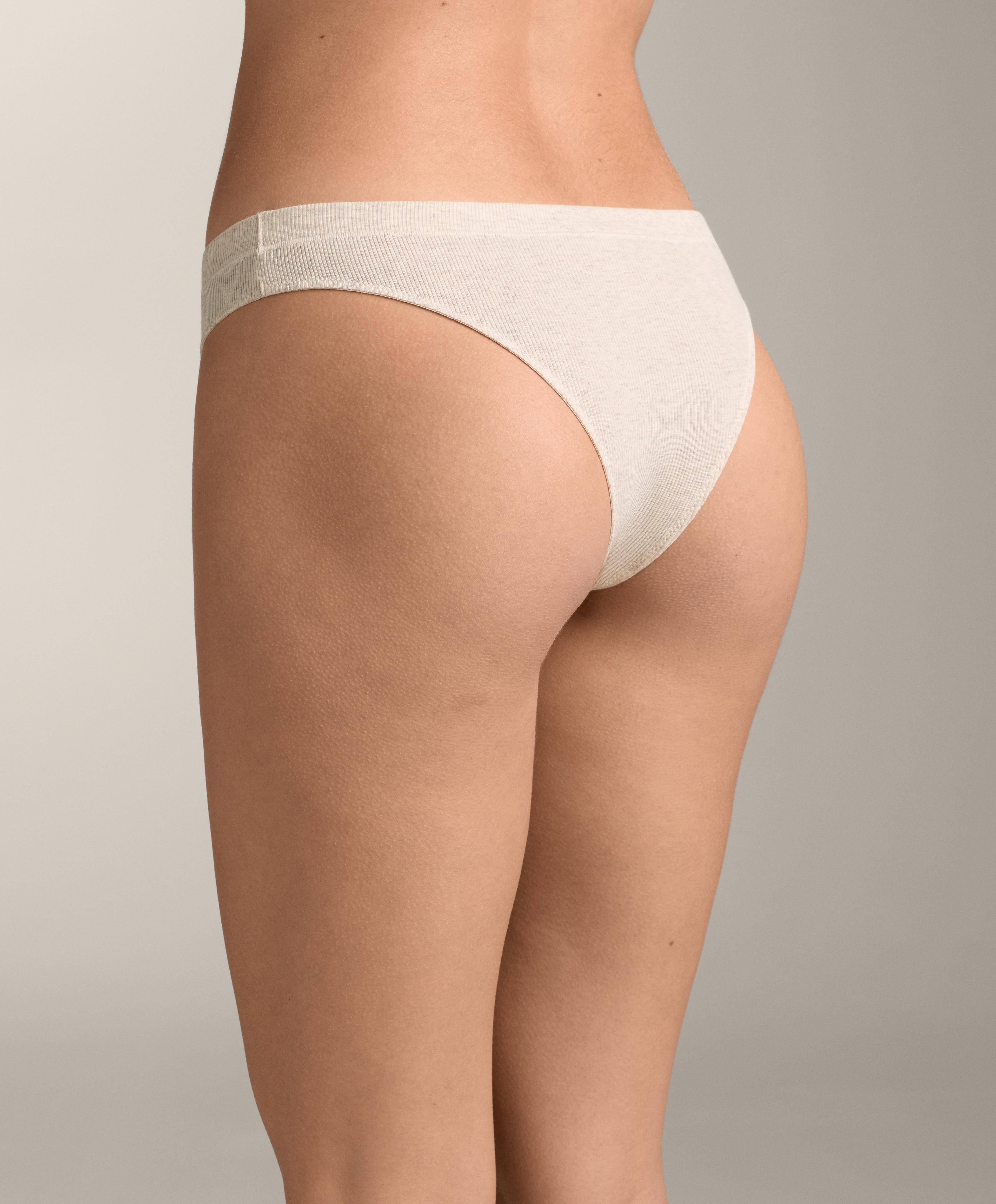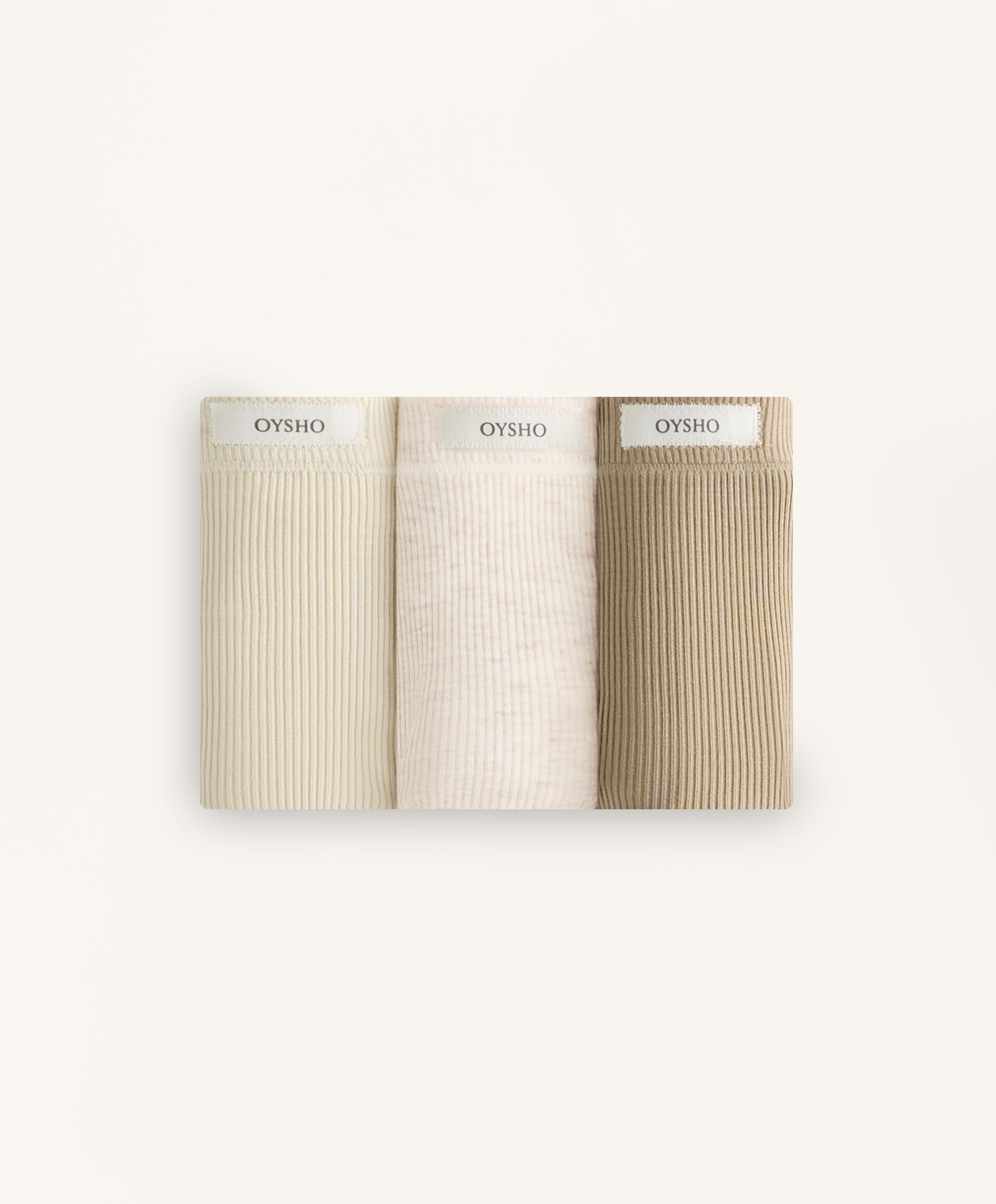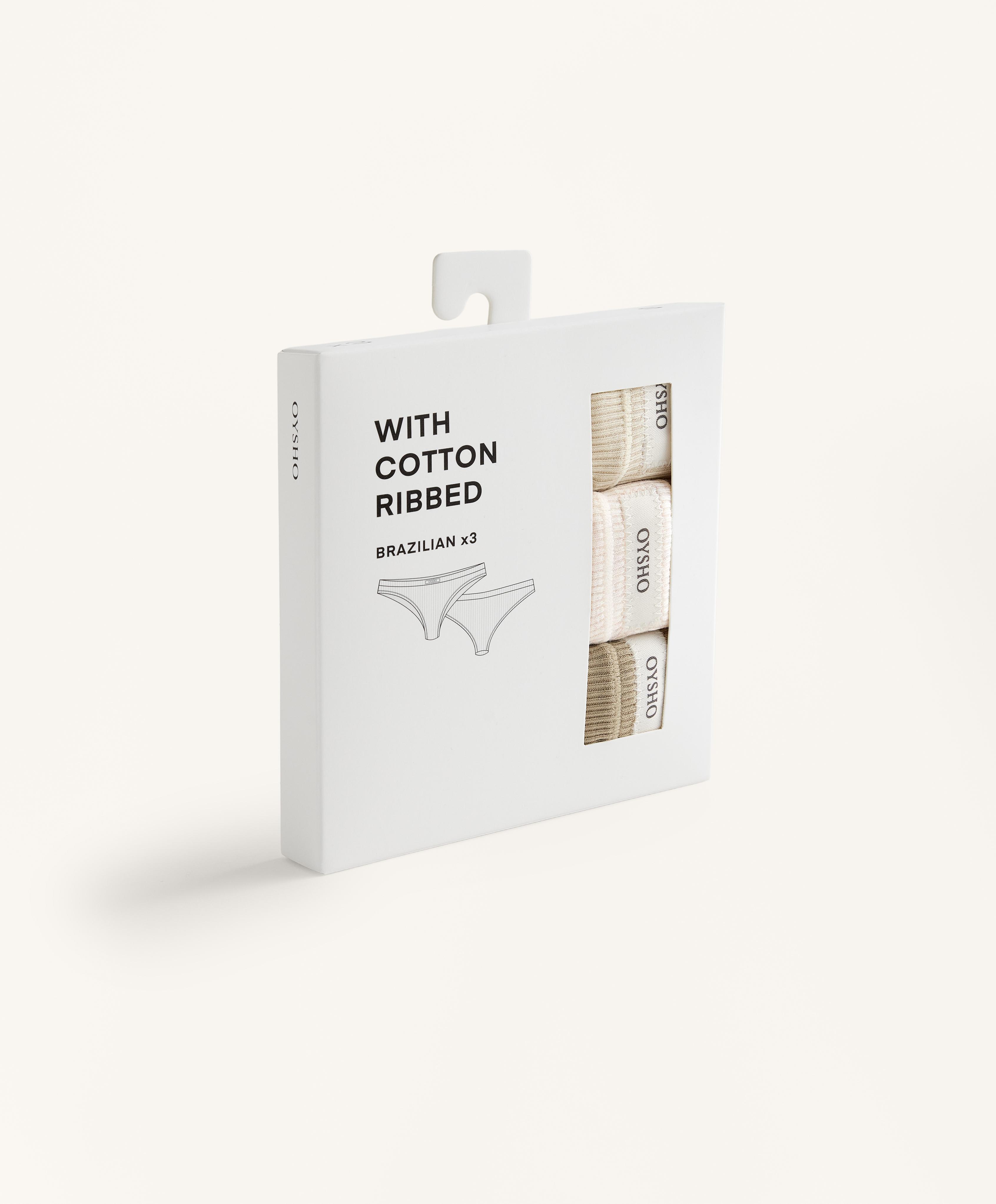 Набор из трех стрингов из хлопчатобумажной ребристой ткани разных однотонных цветов. Эластичный пояс и логотип.