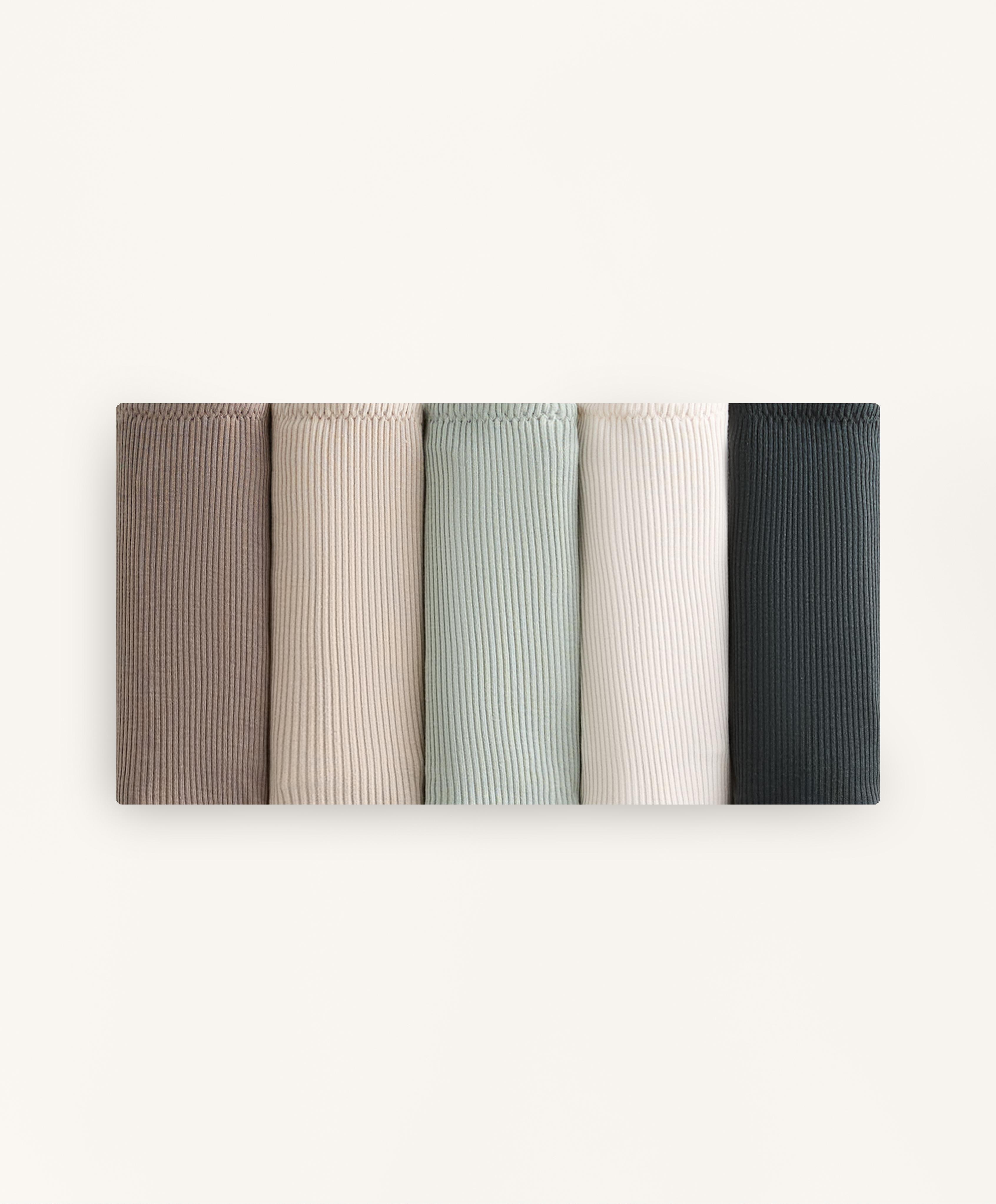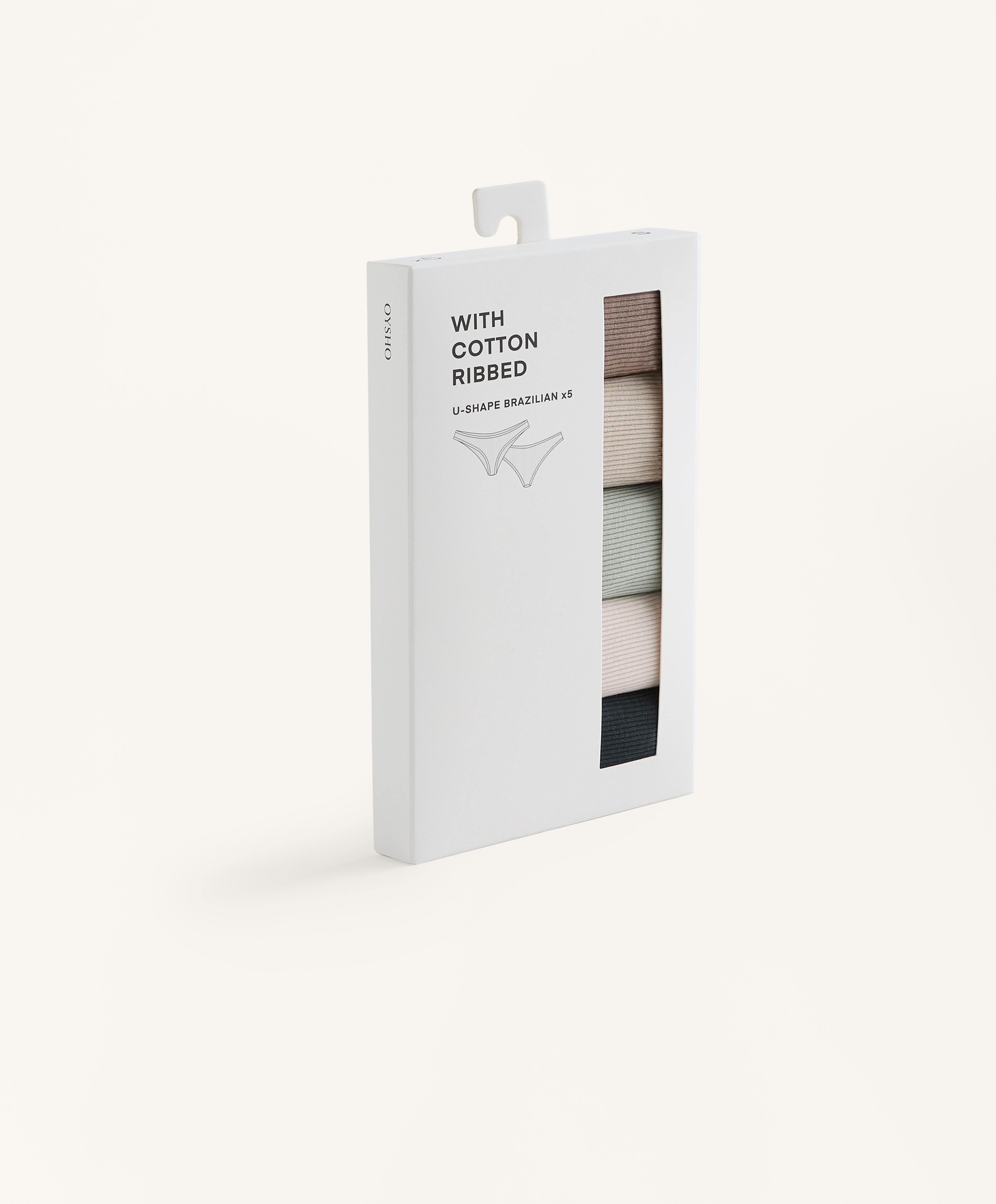 Комплект из 5 трусиков-бриджей бразильского кроя из хлопковой ребристой ткани разных однотонных цветов с U-образным вырезом. Эластичный пояс.