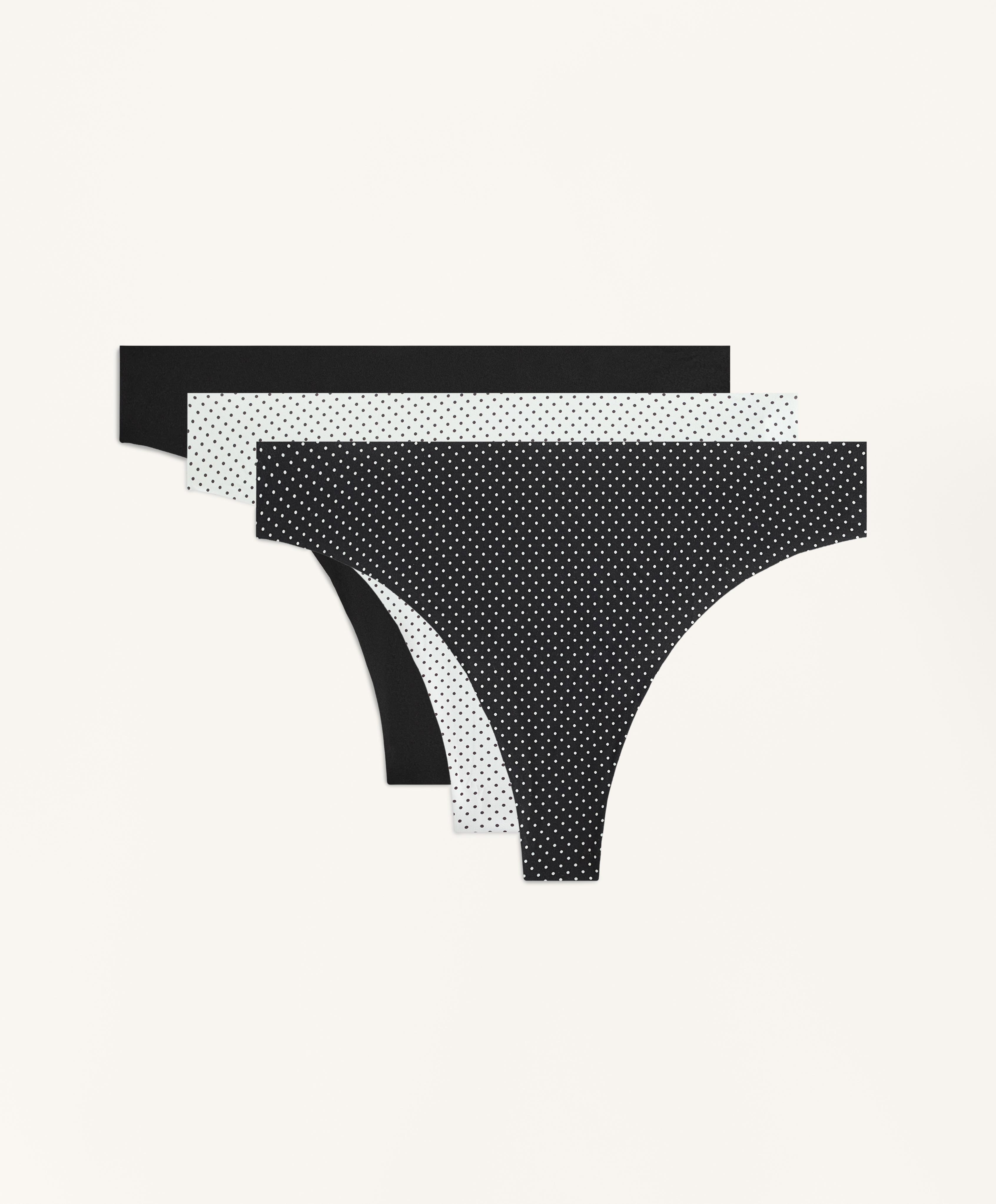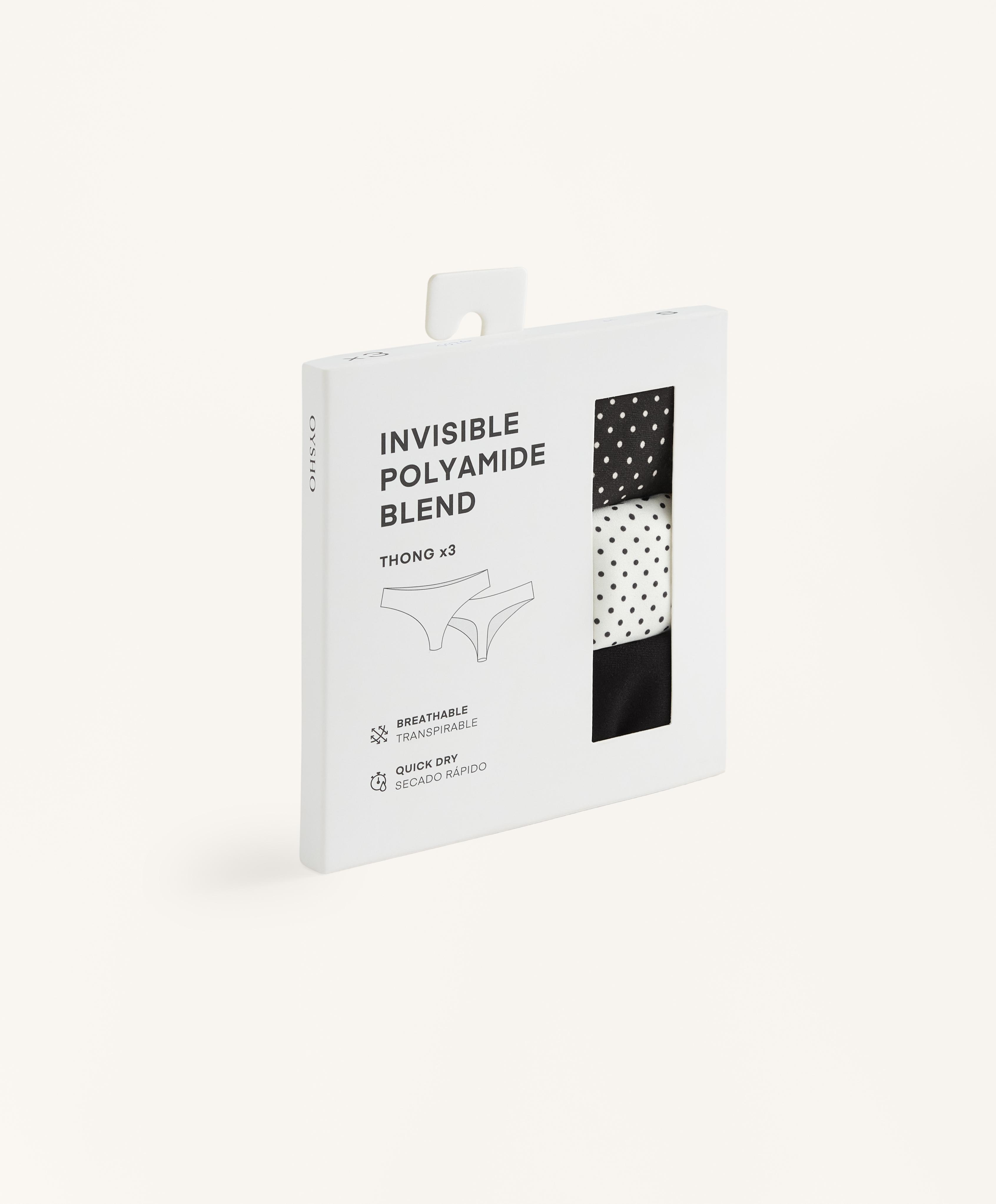 Набор из трех трусиков-стрингов с принтом. Изготовлены из бесшовной, быстросохнущей, дышащей ткани из полиамидной смеси. Идеально подходят для ношения в качестве незаметного нижнего белья во время занятий спортом.