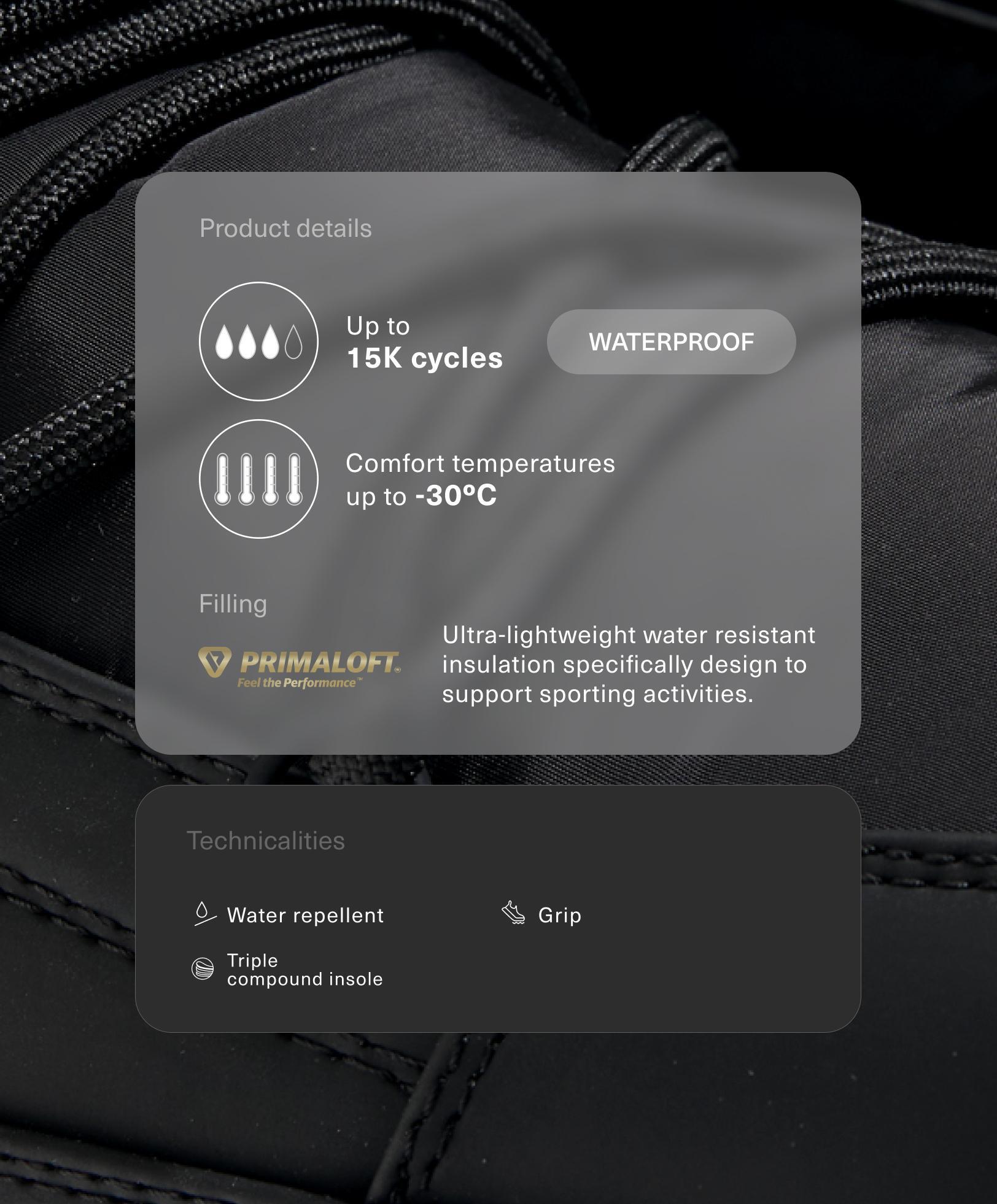 Ботинки разработаны для холодной и влажной погоды, с термоизоляцией, протестированной при температуре до -30 °C. Технический наполнитель Primaloft® – сверхлёгкий, мягкий и водостойкий – обеспечивает максимальный комфорт в экстремальных климатических условиях. Водонепроницаемая конструкция сертифицирована на 15 000 циклов сгибания в воде, сохраняя внутреннюю поверхность сухой. Материалы с водоотталкивающей пропиткой устойчивы к поверхностной влаге. Трехслойная стелька, объединяющая различные материалы в единой структуре, обеспечивает комфорт и амортизацию. Технологичная подошва с высоким сцеплением обеспечивает оптимальное сцепление и устойчивость на скользких поверхностях. Высота подошвы: 3 см.
