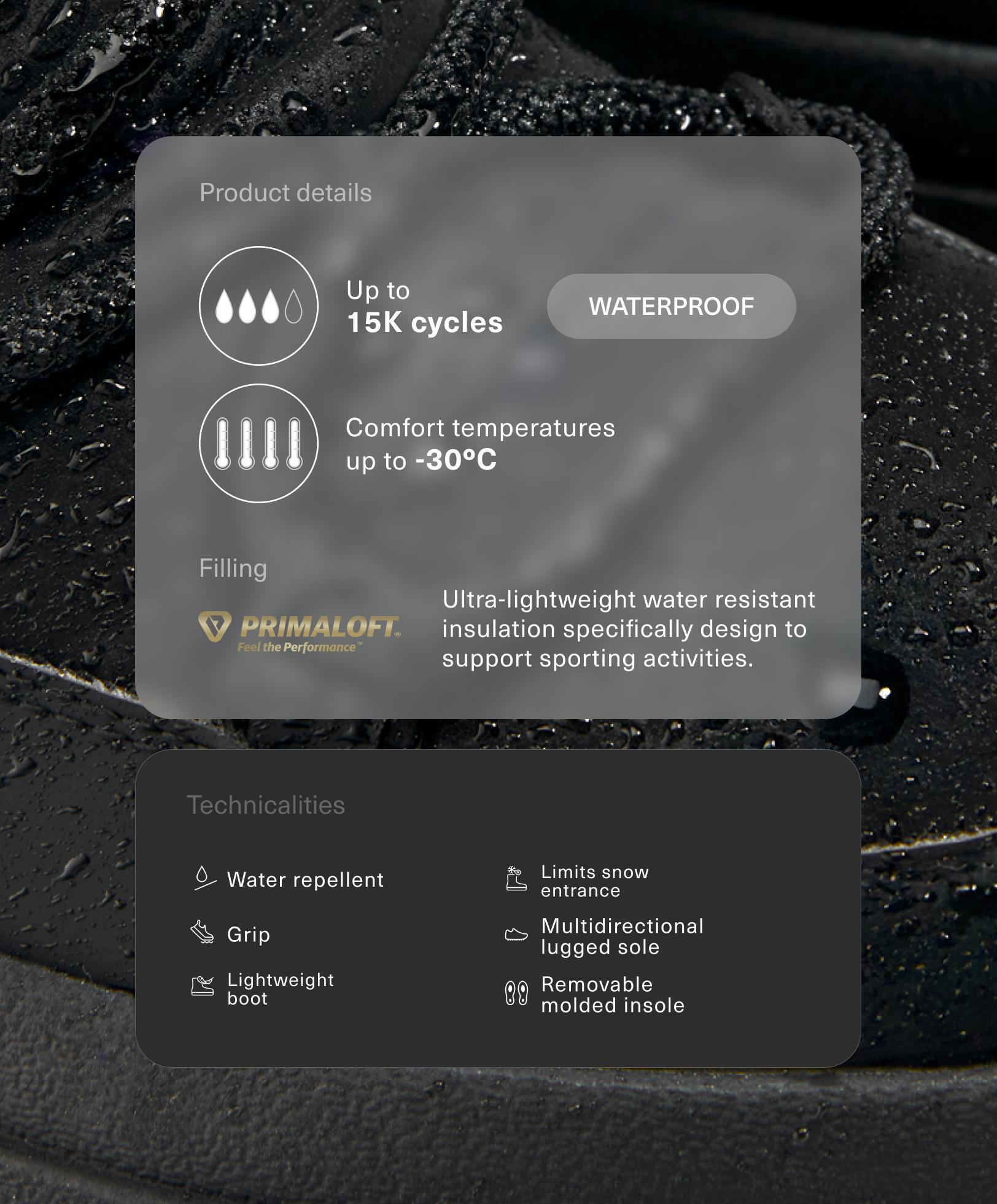 Технический ботинок с утеплителем. Ботинок разработан для экстремально низких температур, утеплитель протестирован до -30ºC. Изготовлен с использованием технического наполнителя Primaloft®. Технология Primaloft® заключается в использовании синтетических микроволокон, обеспечивающих теплоизоляцию. Даже во влажном состоянии он сохраняет свои теплоизоляционные свойства и лёгкость, обеспечивая тепло и комфорт. Водонепроницаемая конструкция, сертифицированная на 15 000 циклов сгибания в воде, сохраняет внутреннюю часть сухой. Материалы с водоотталкивающей пропиткой, устойчивые к поверхностной влаге.