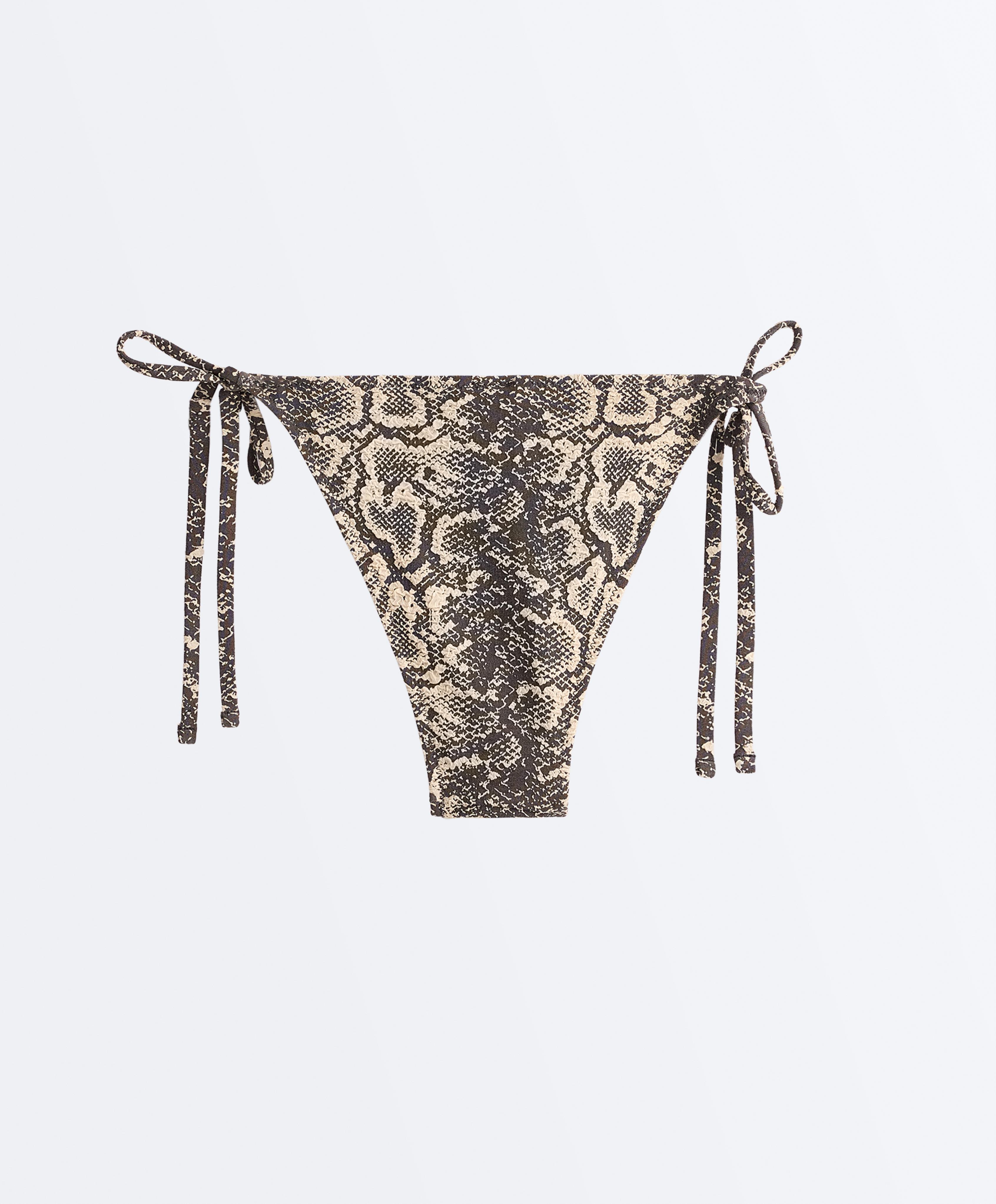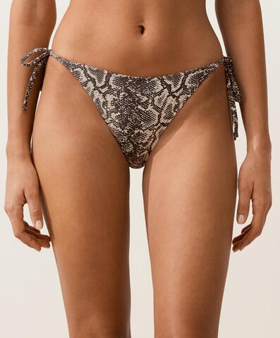 Полуоткрытые плавки бикини с завязками по бокам. Ткань со змеиным принтом.