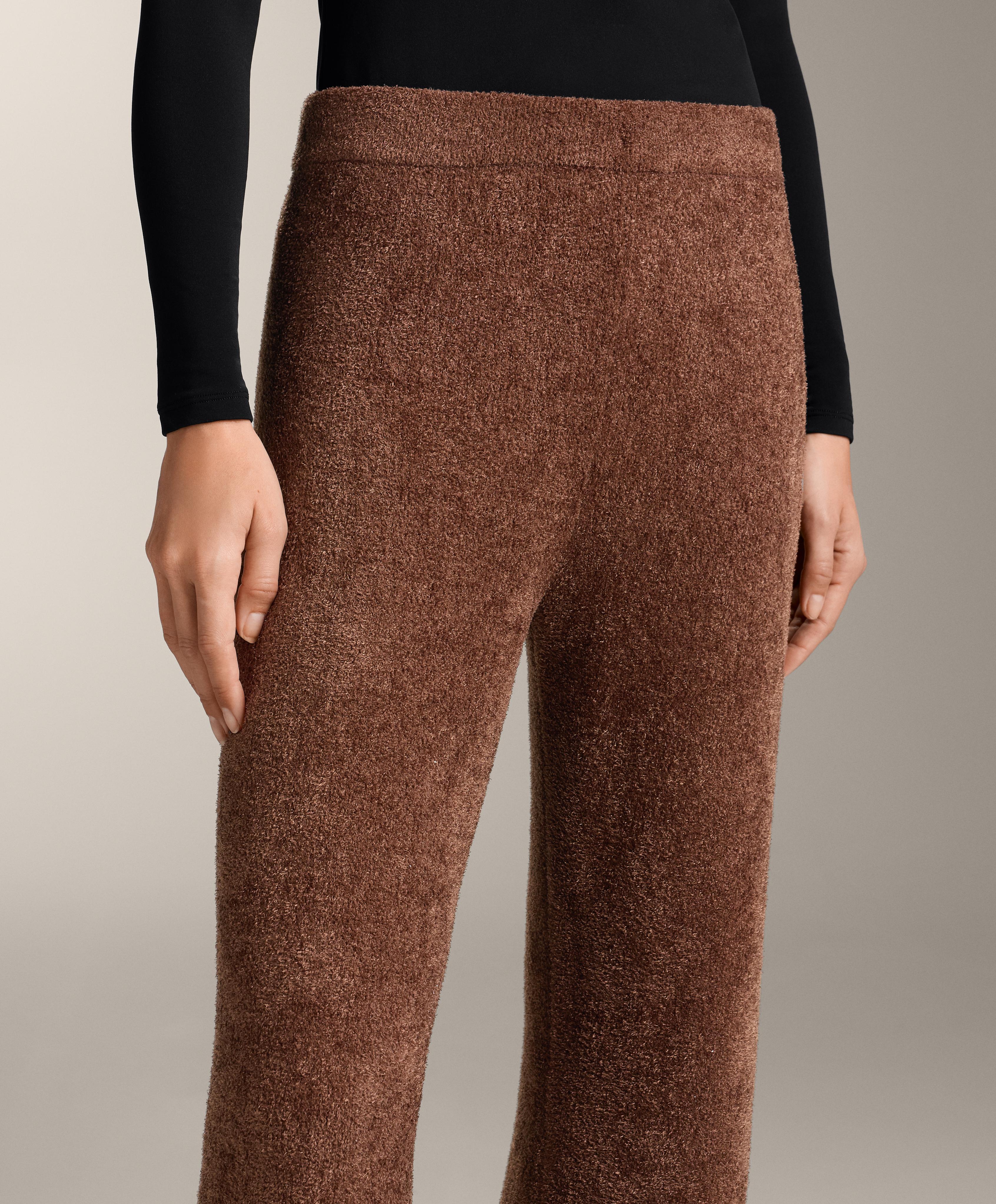 Длинные расклешенные брюки из плотной синели. С регулируемым эластичным поясом.