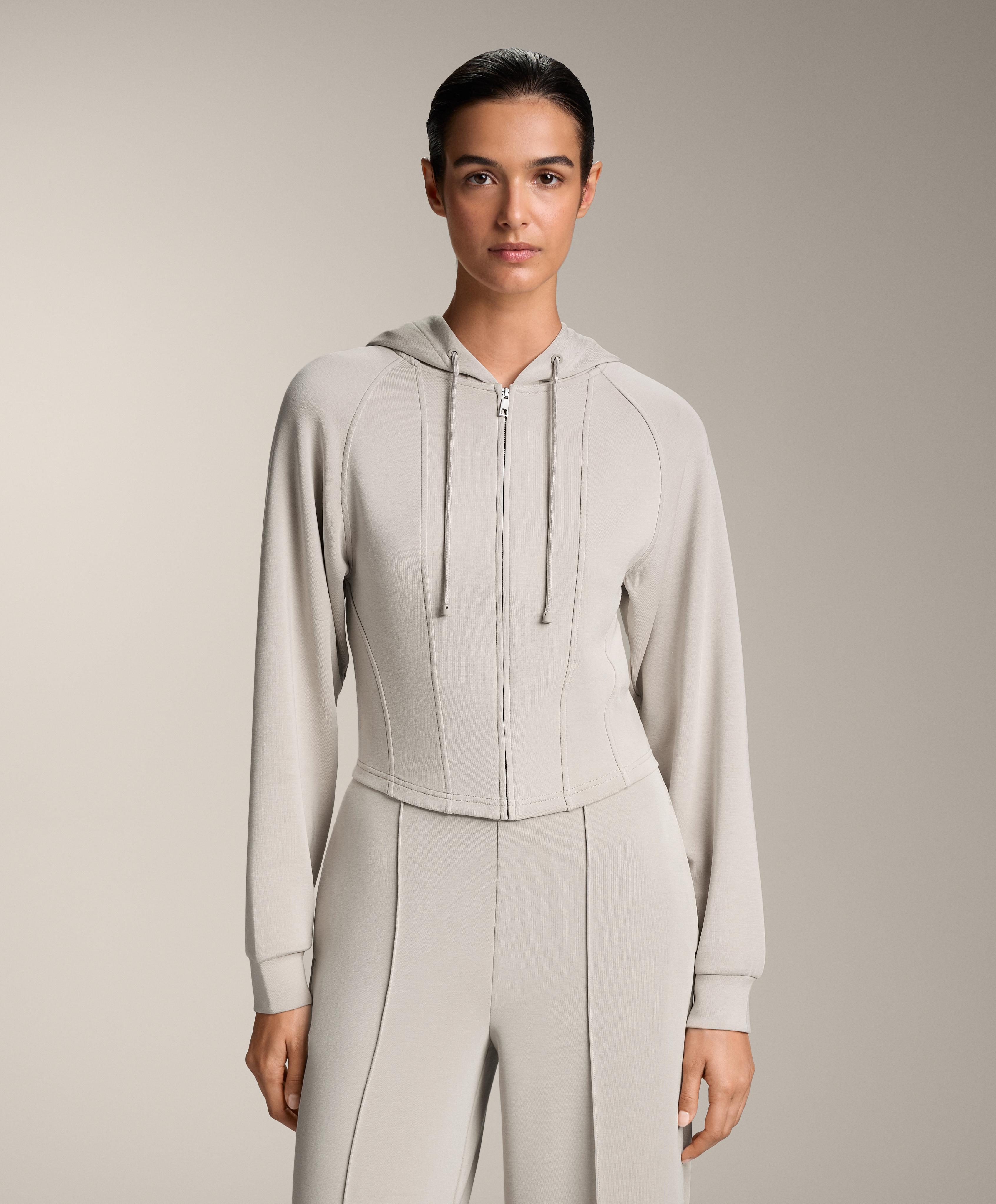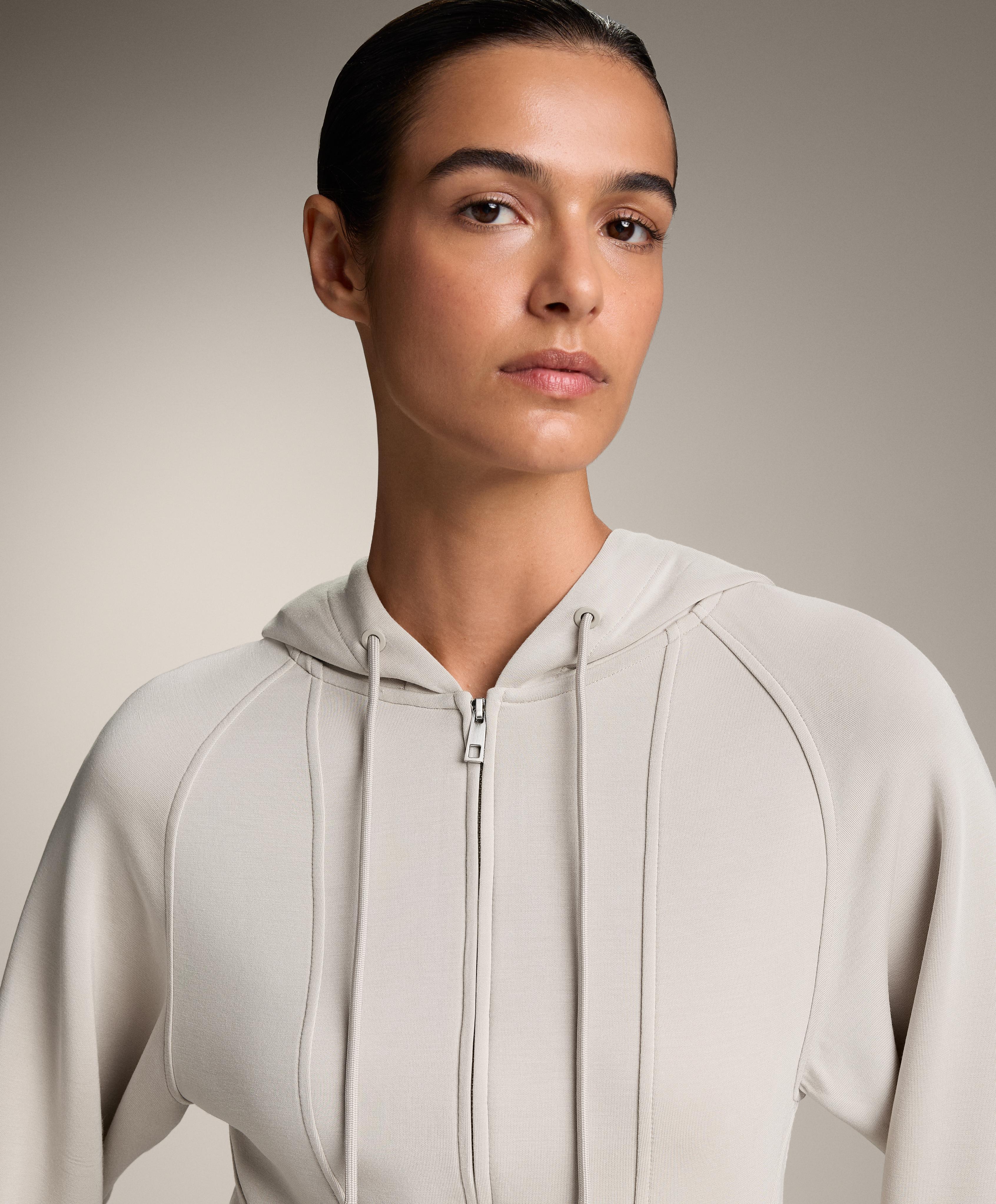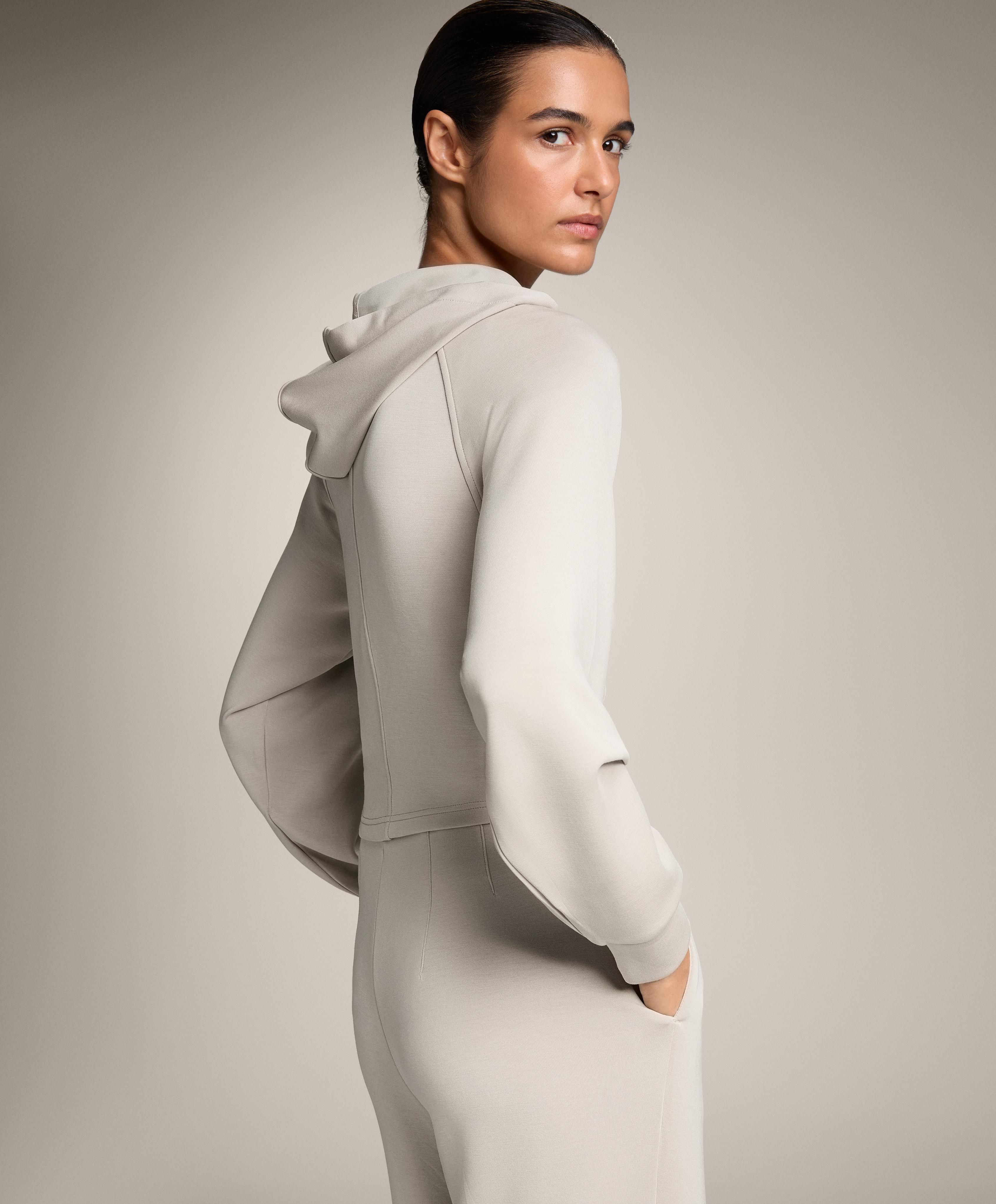Укороченная куртка приталенного кроя с застежкой-молнией спереди. Имеет регулируемый капюшон на шнурке и манжеты на рукавах. Дышащая ткань из модала, очень мягкая на ощупь.