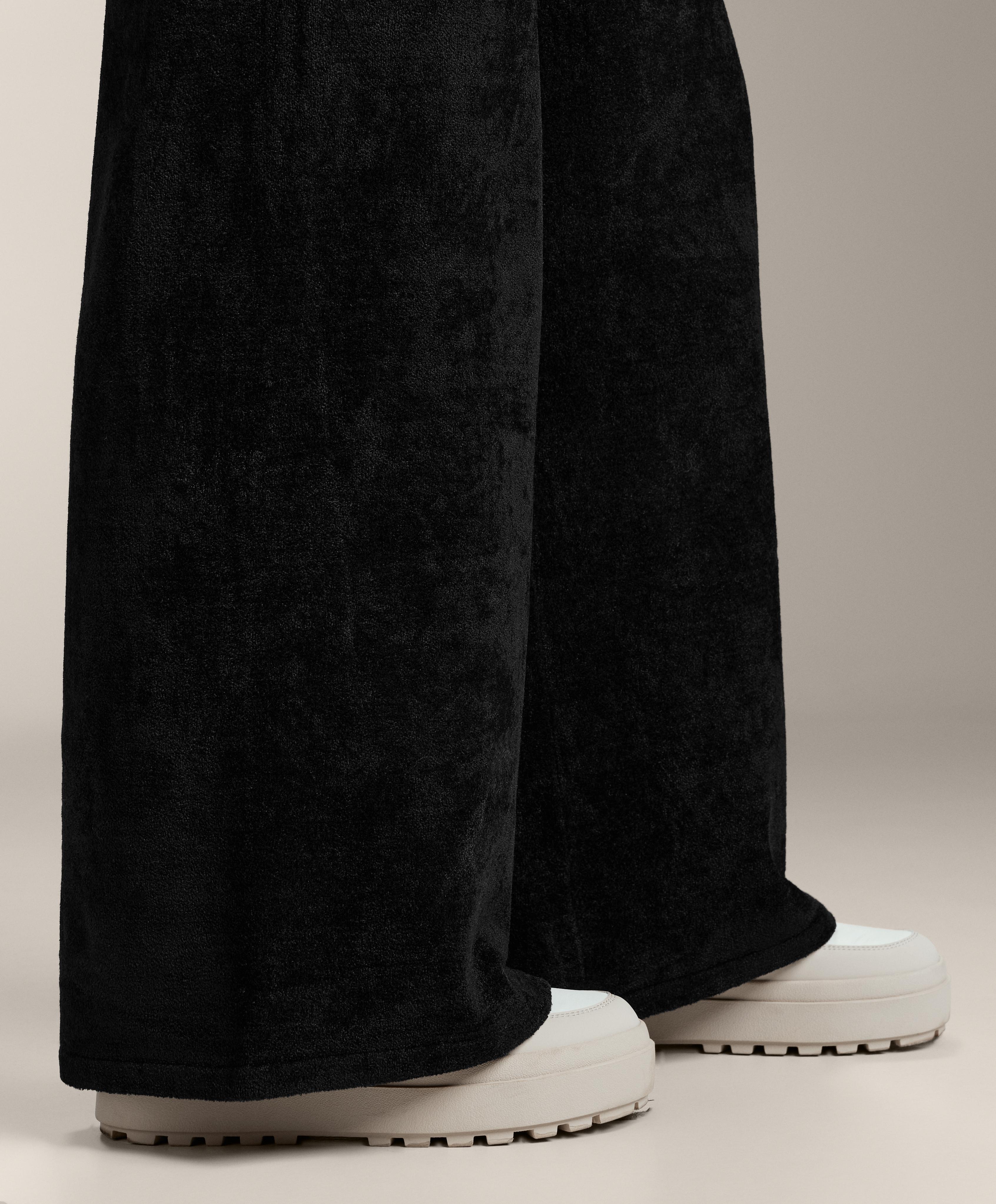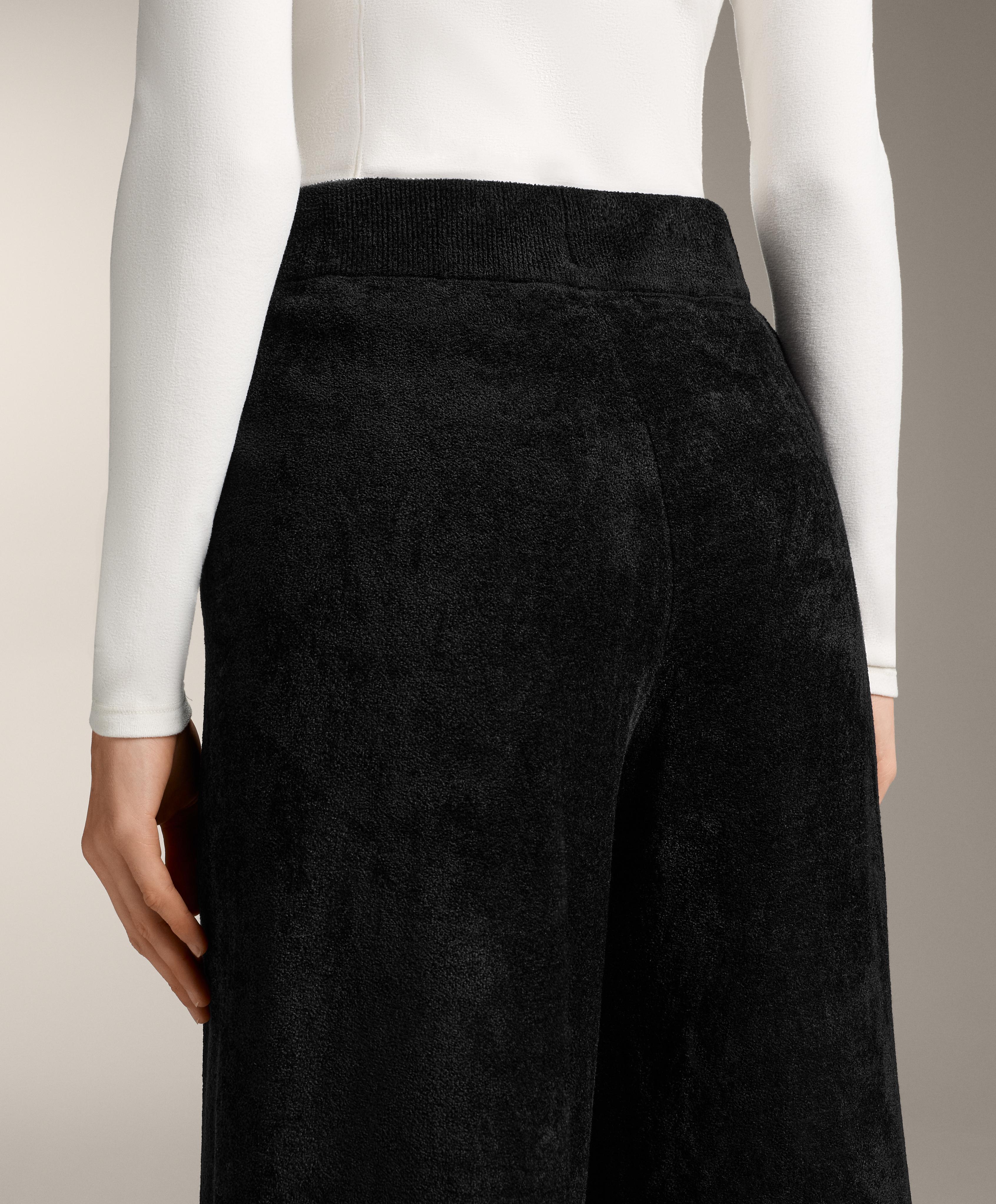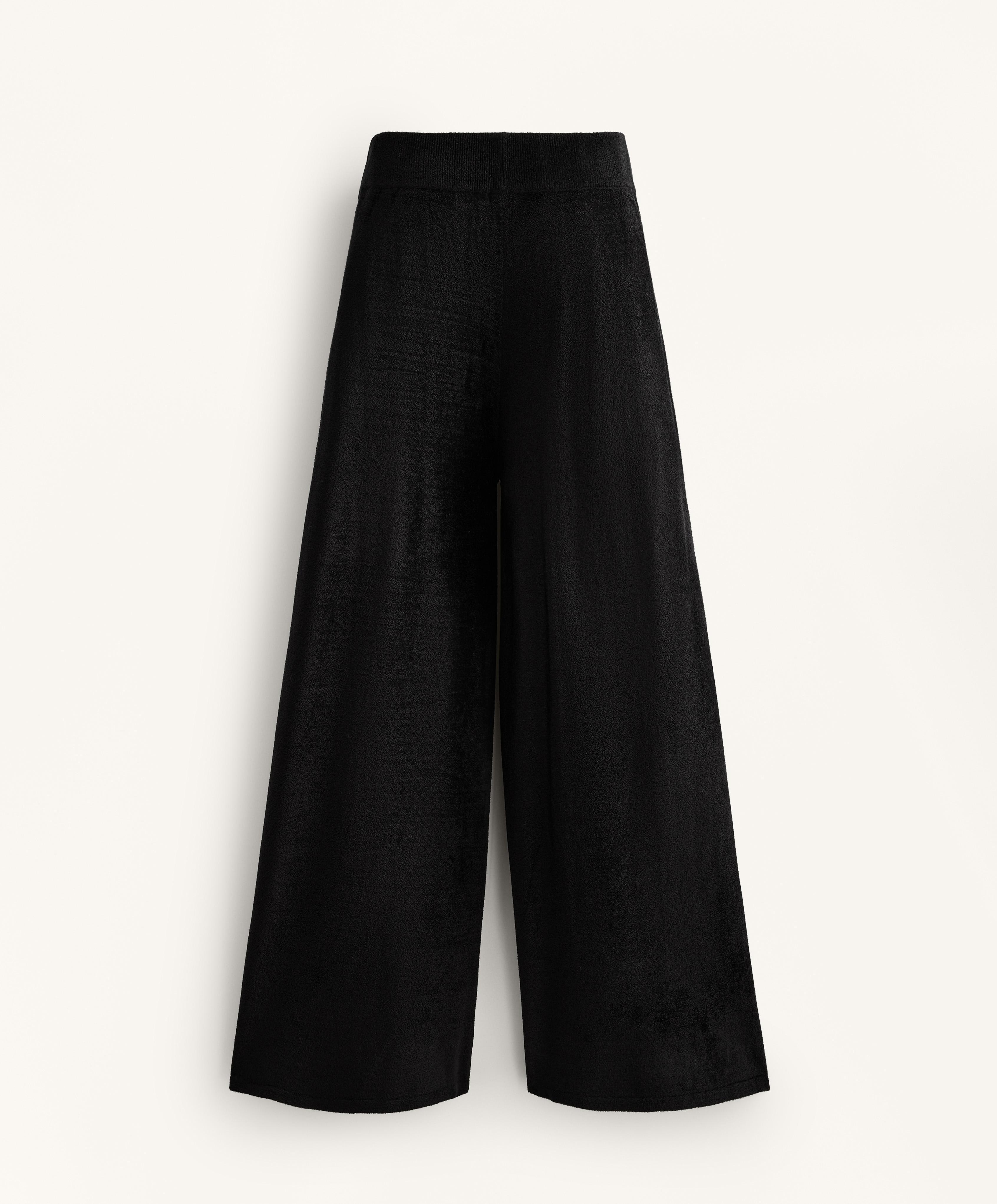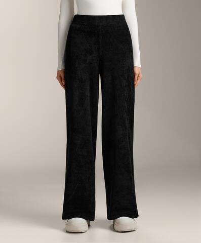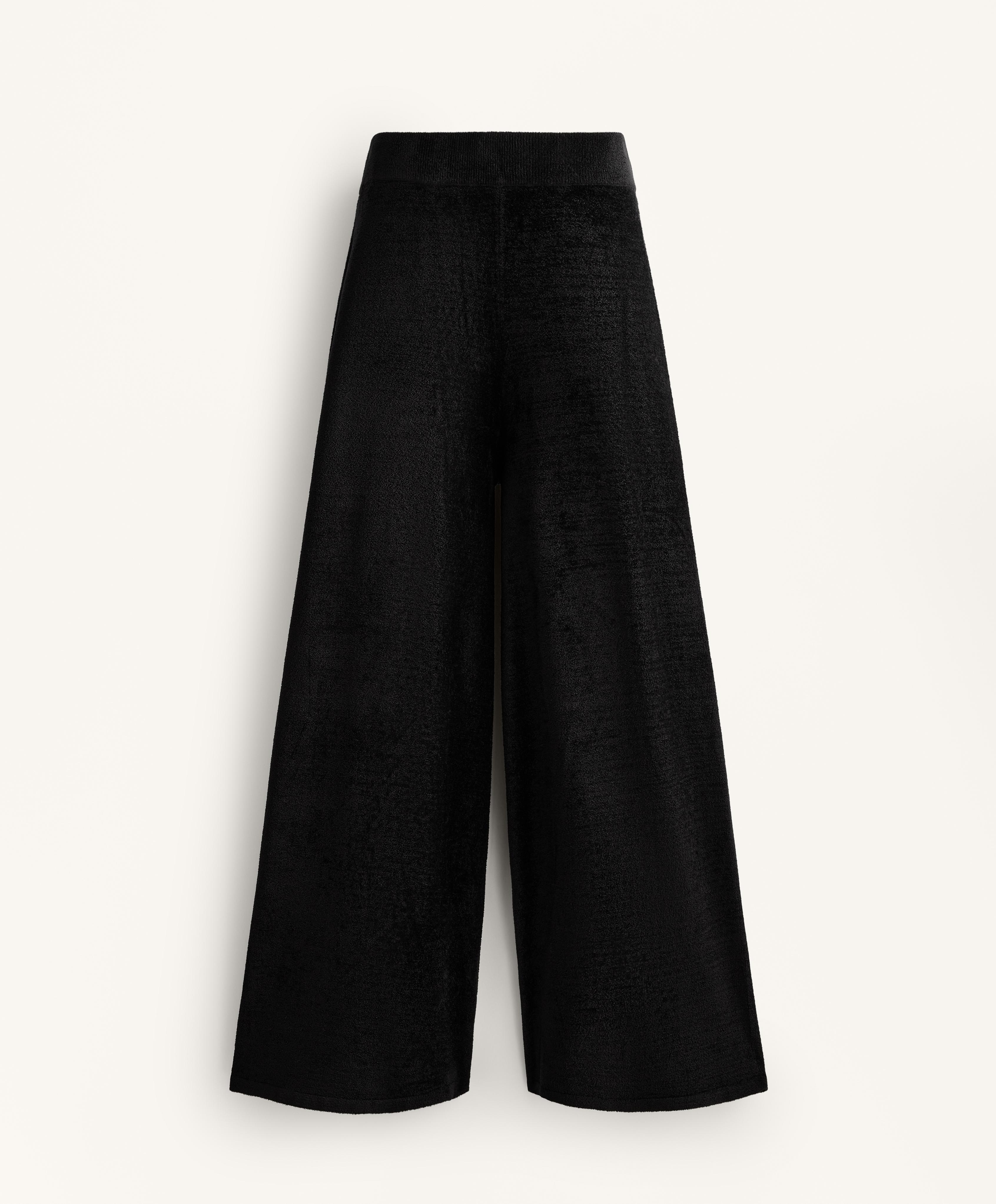 Тонкие синельные брюки прямого кроя. С регулируемым эластичным поясом.