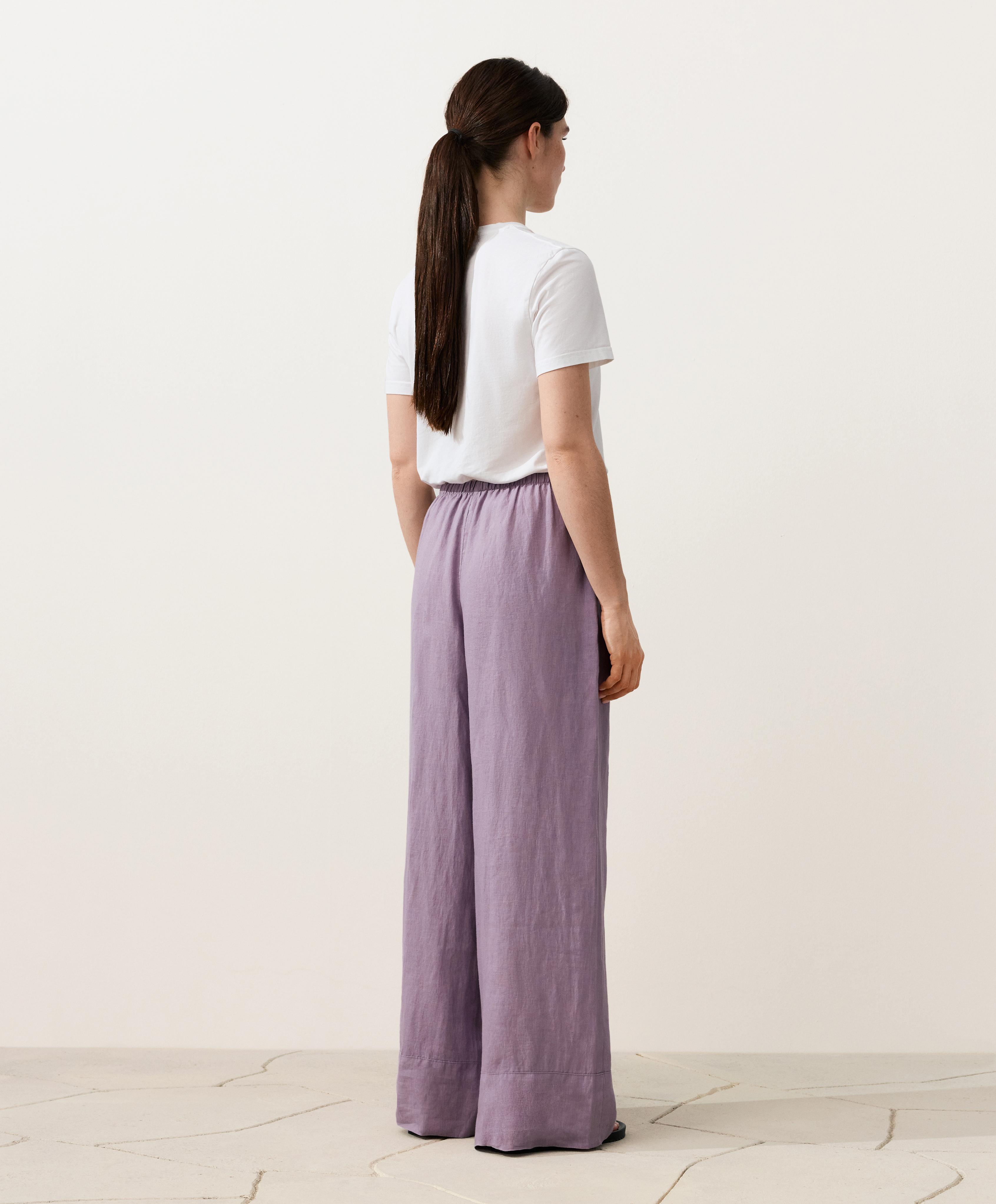 Длинные прямые брюки с едва заметным швом по нижнему краю штанин. Регулируемый эластичный пояс. Ткань: 100% лён.