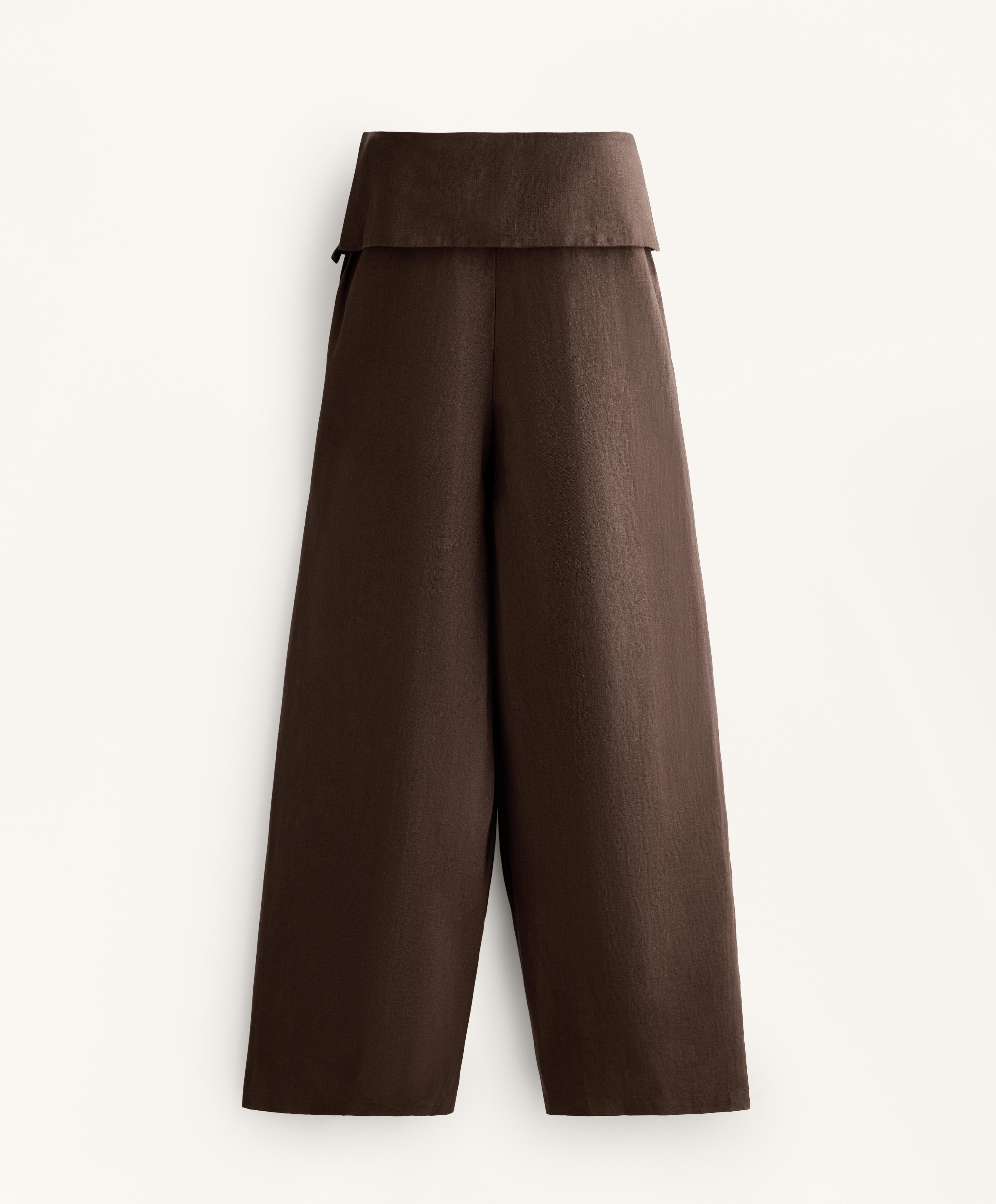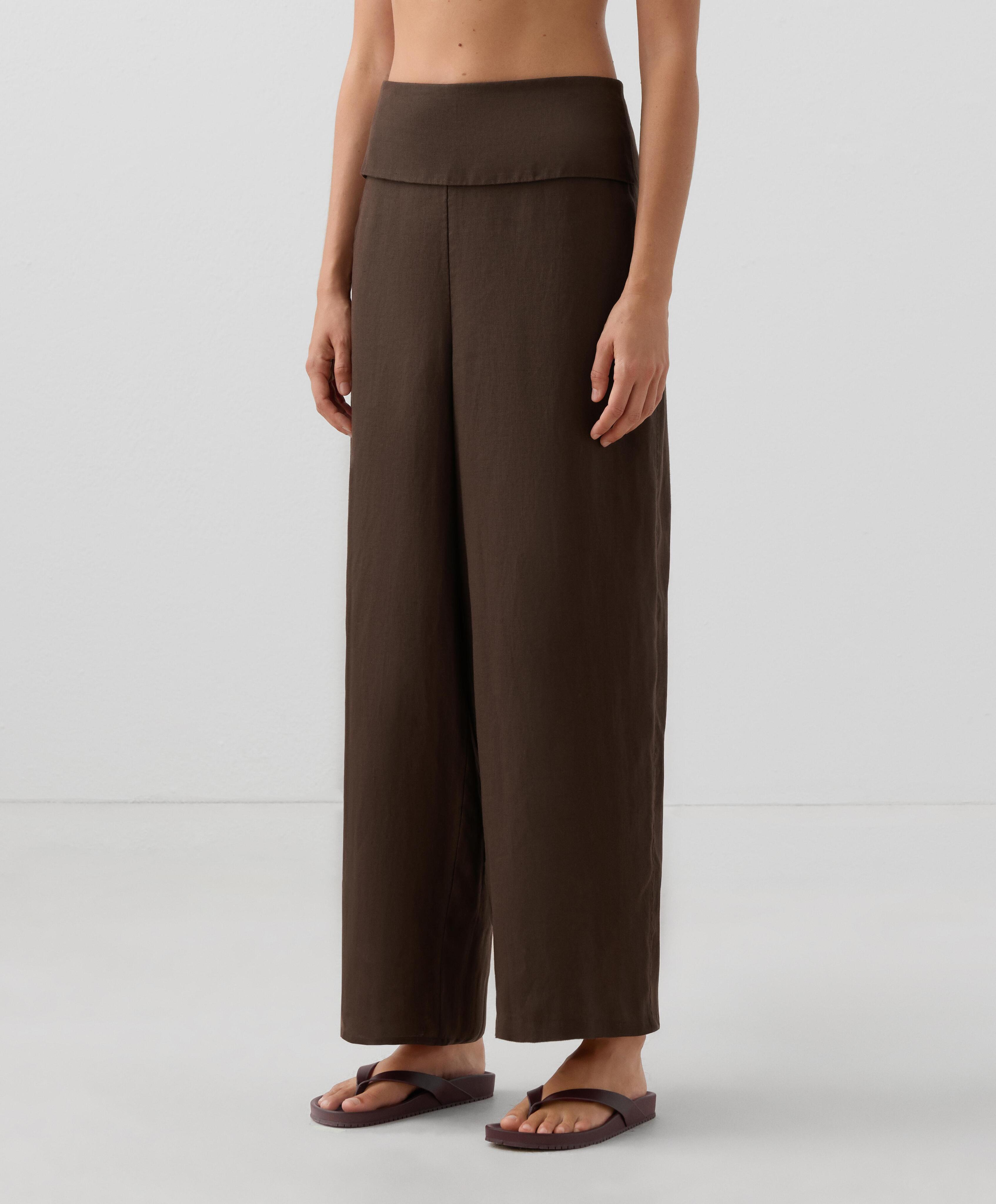 Брюки прямого кроя с подвернутым поясом. С боковыми карманами. Изготовлены из 100% льна.