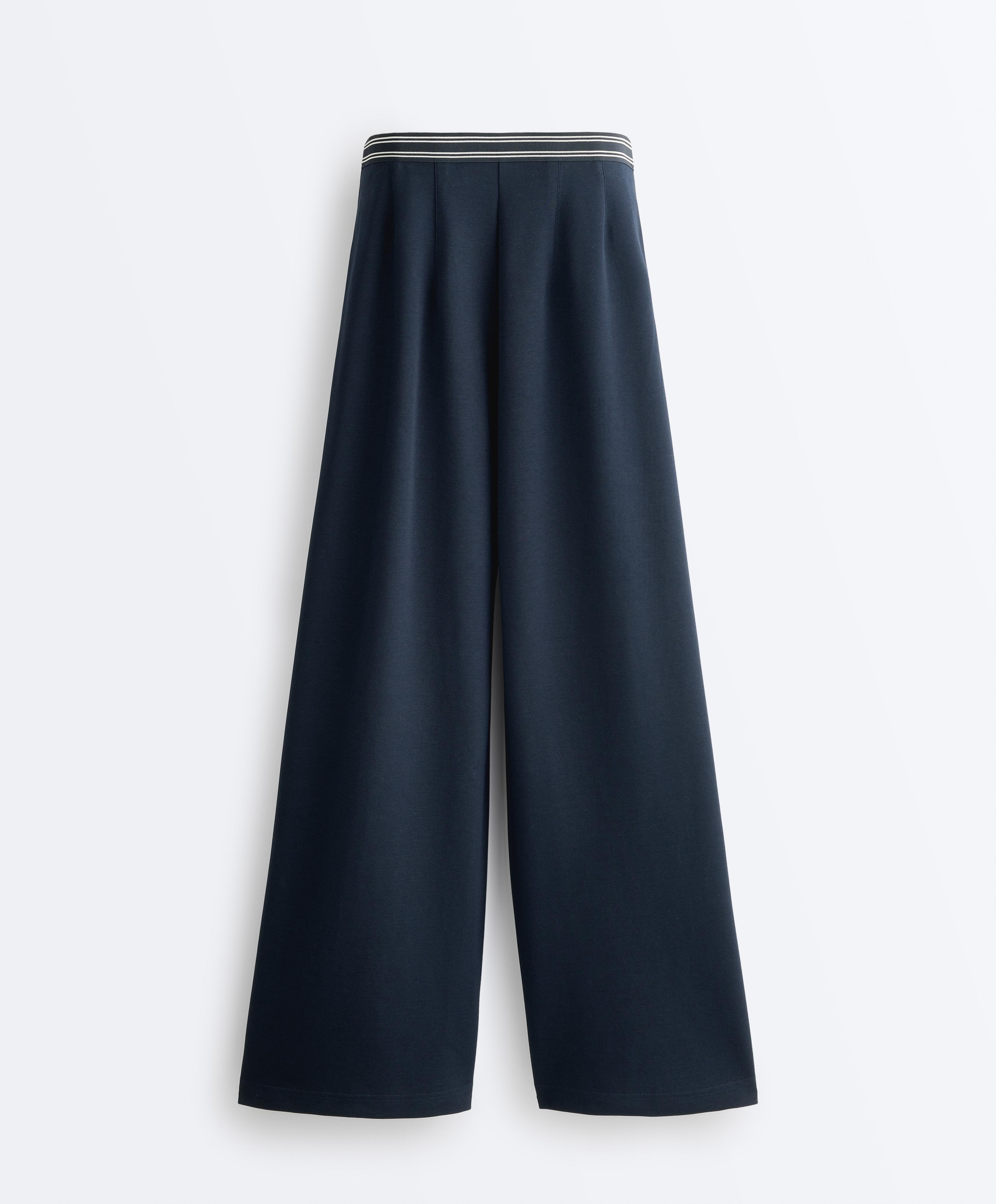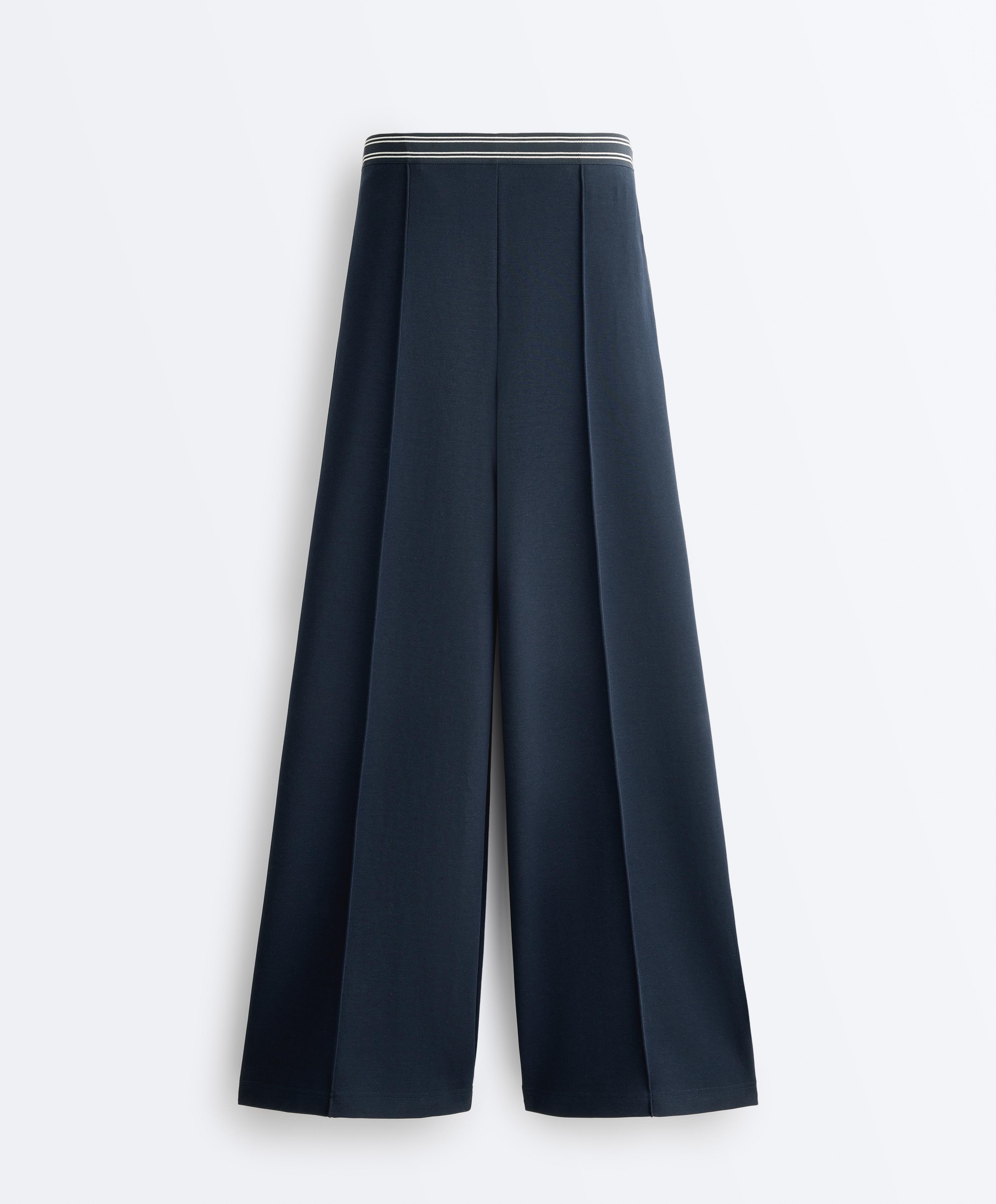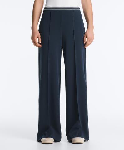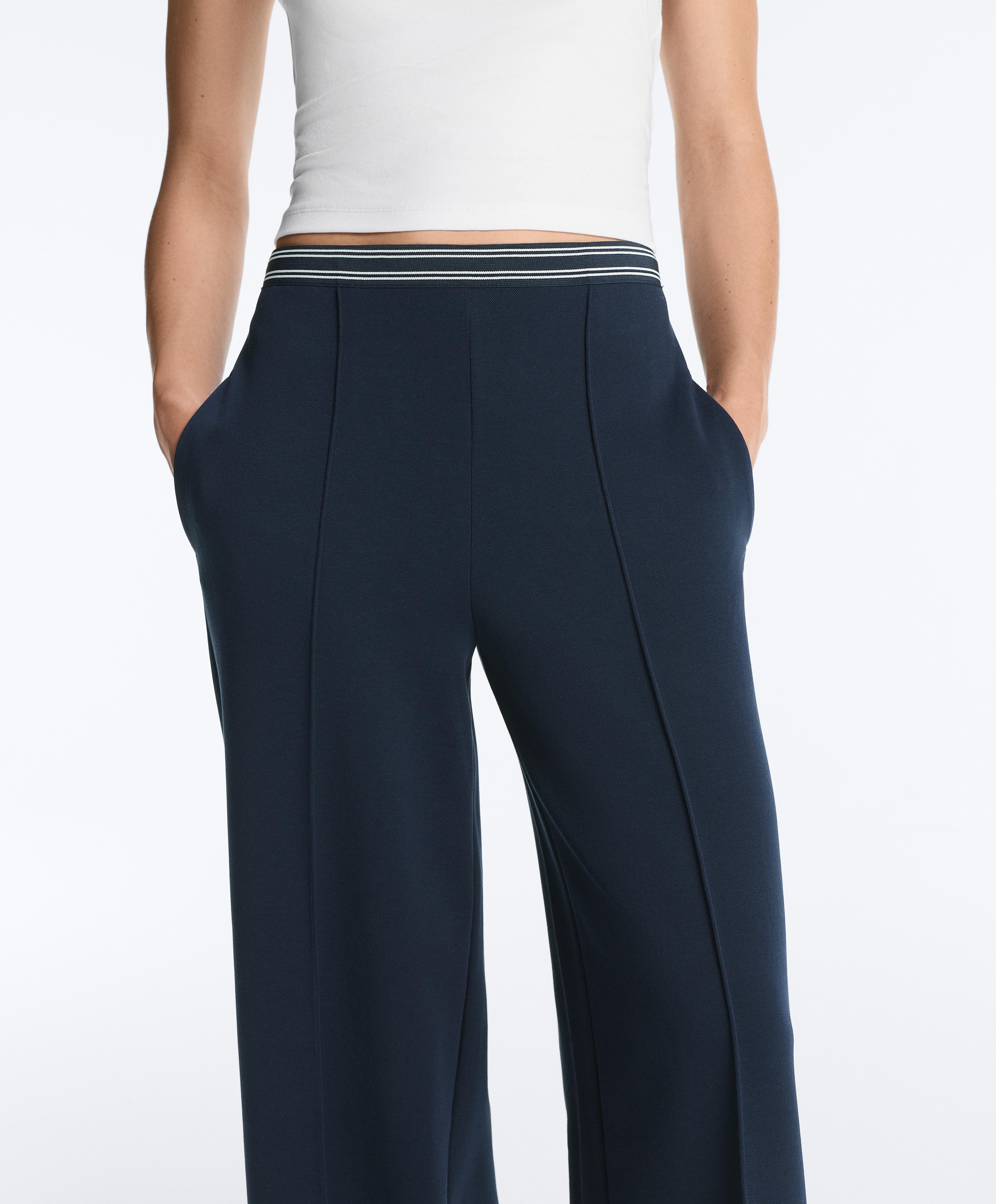 Длинные прямые брюки со сгибом по центру штанины. Регулируемый эластичный пояс с контрастной окантовкой. Ткань пике из хлопка.