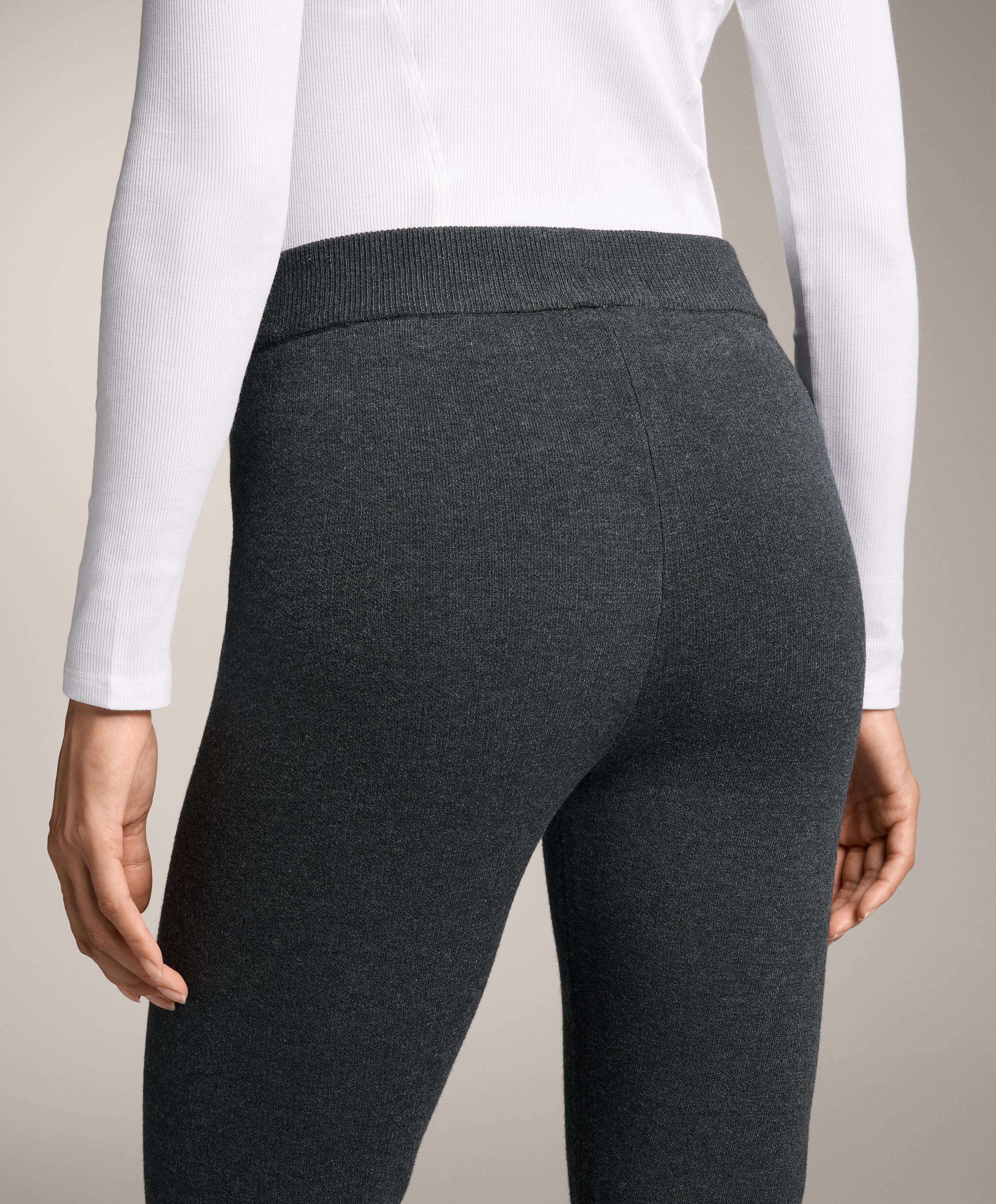 Расклешенные трикотажные брюки с регулируемым эластичным поясом. Талия отделана резинкой.