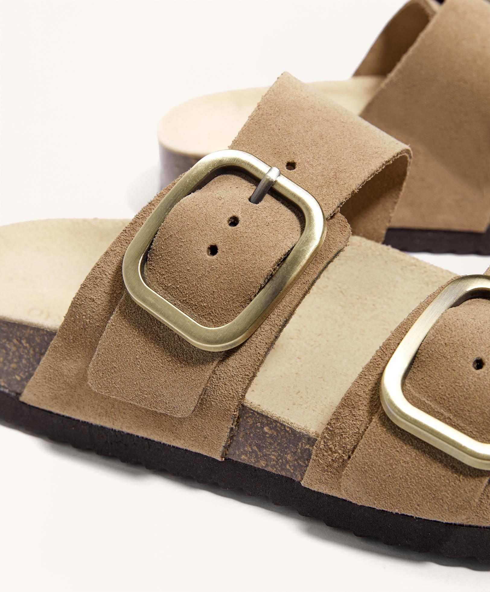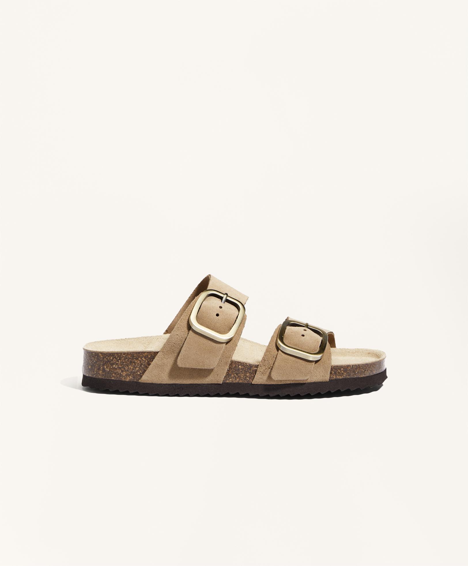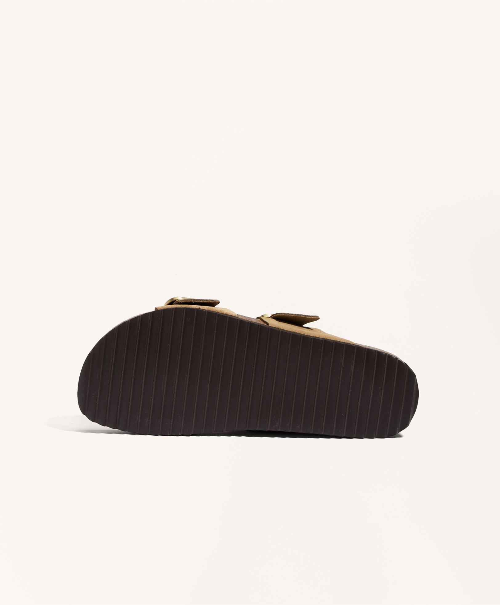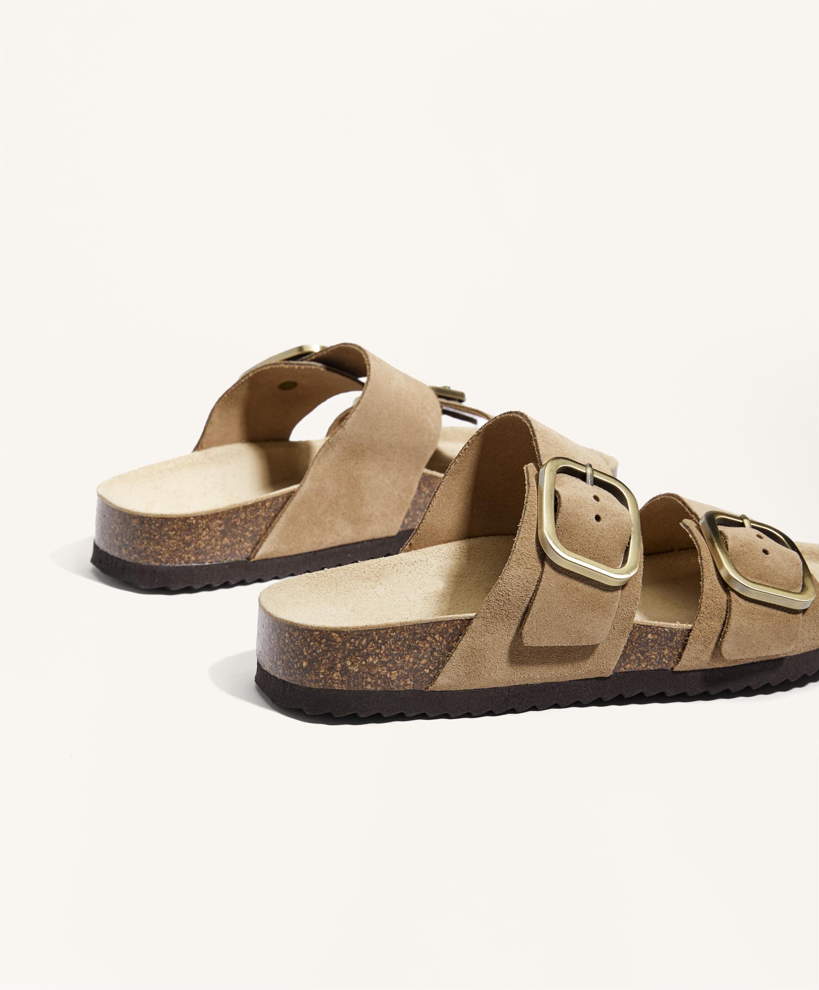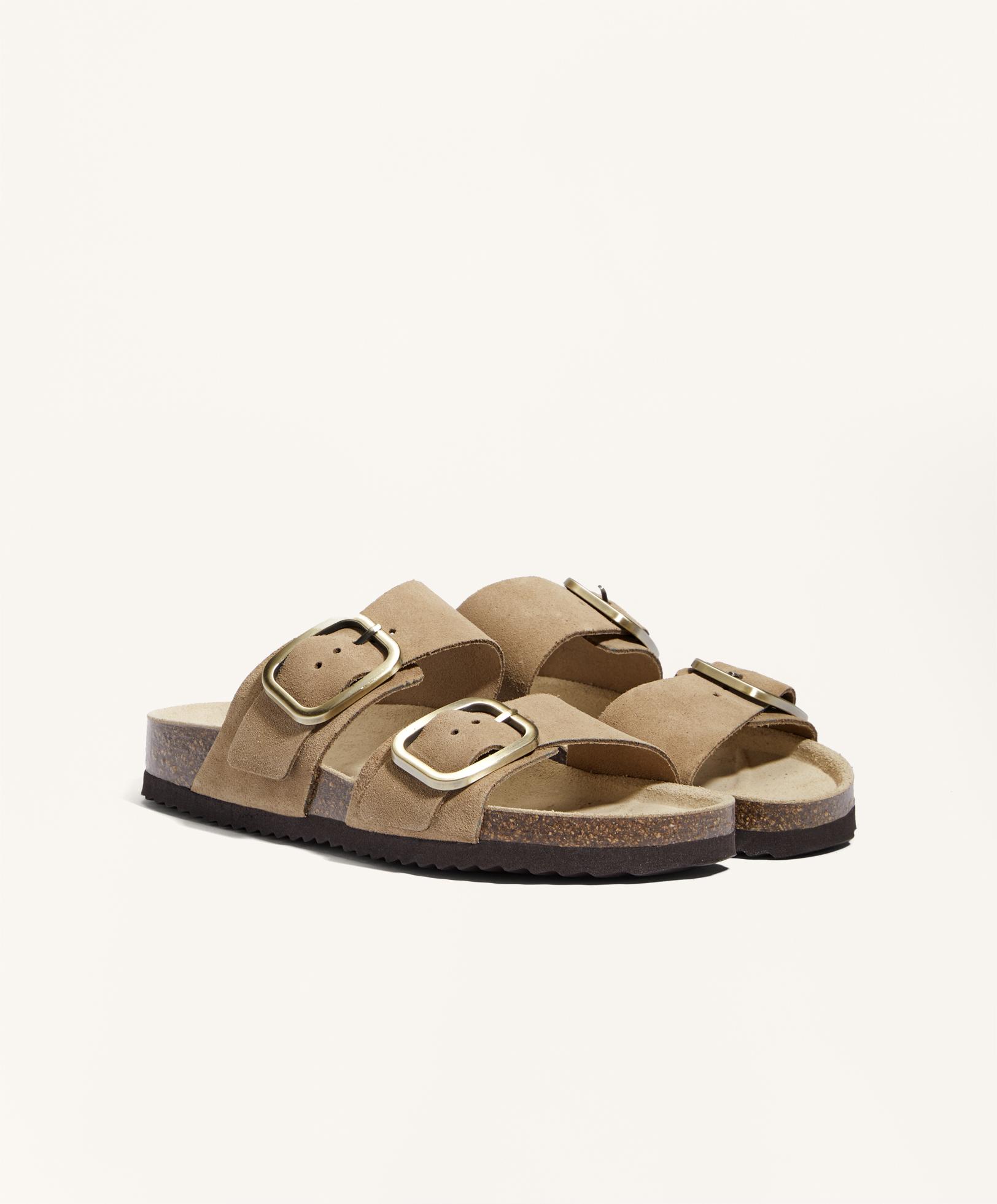 Сандалии на плоской подошве с двойными ремешками из 100% замши и пряжкой. Эргономичная подошва. Высота подошвы 2,5 см.