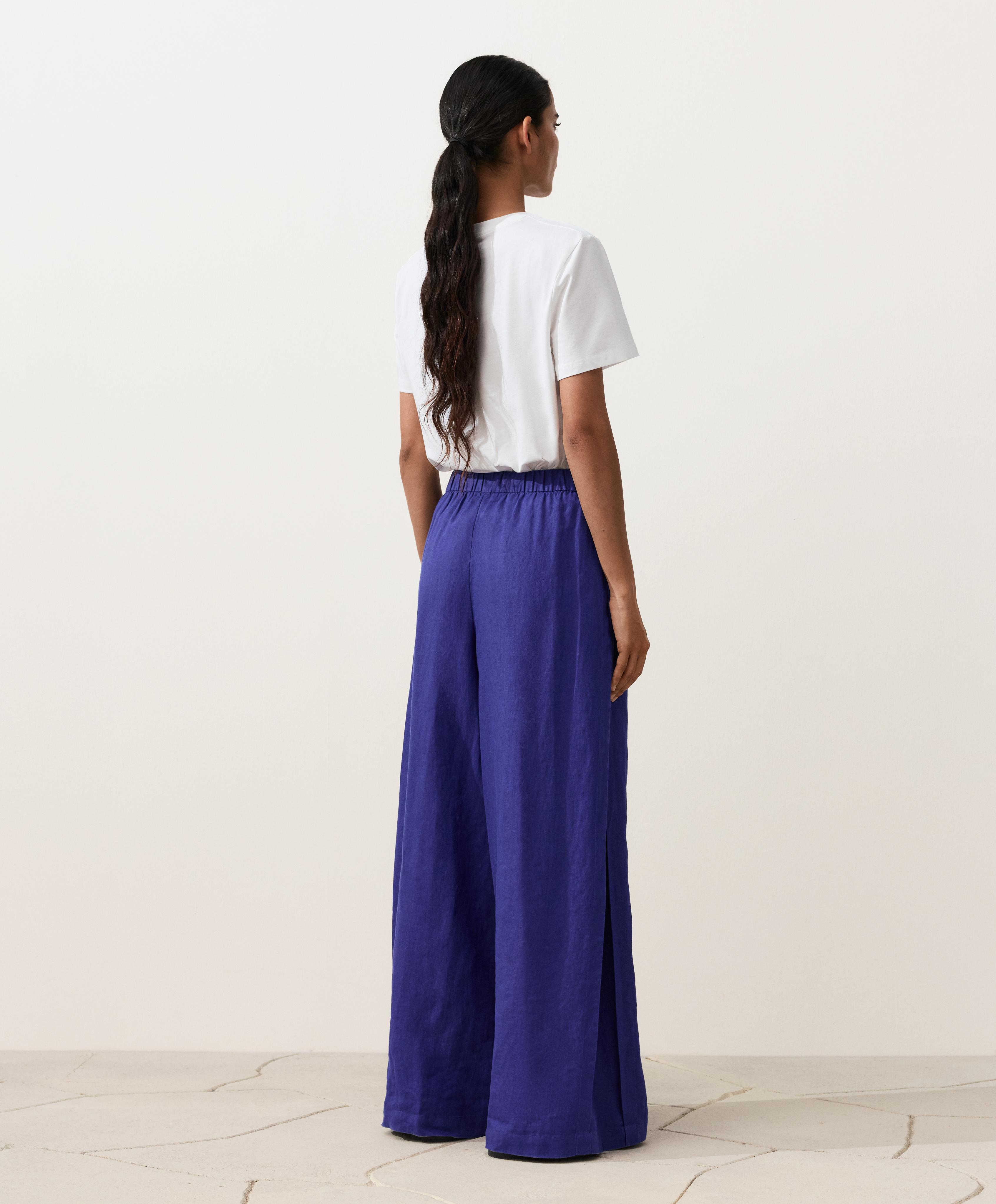 Длинные широкие брюки со складками по бокам штанин. Регулируемый эластичный пояс и передние карманы. Изготовлены из 100% льна.