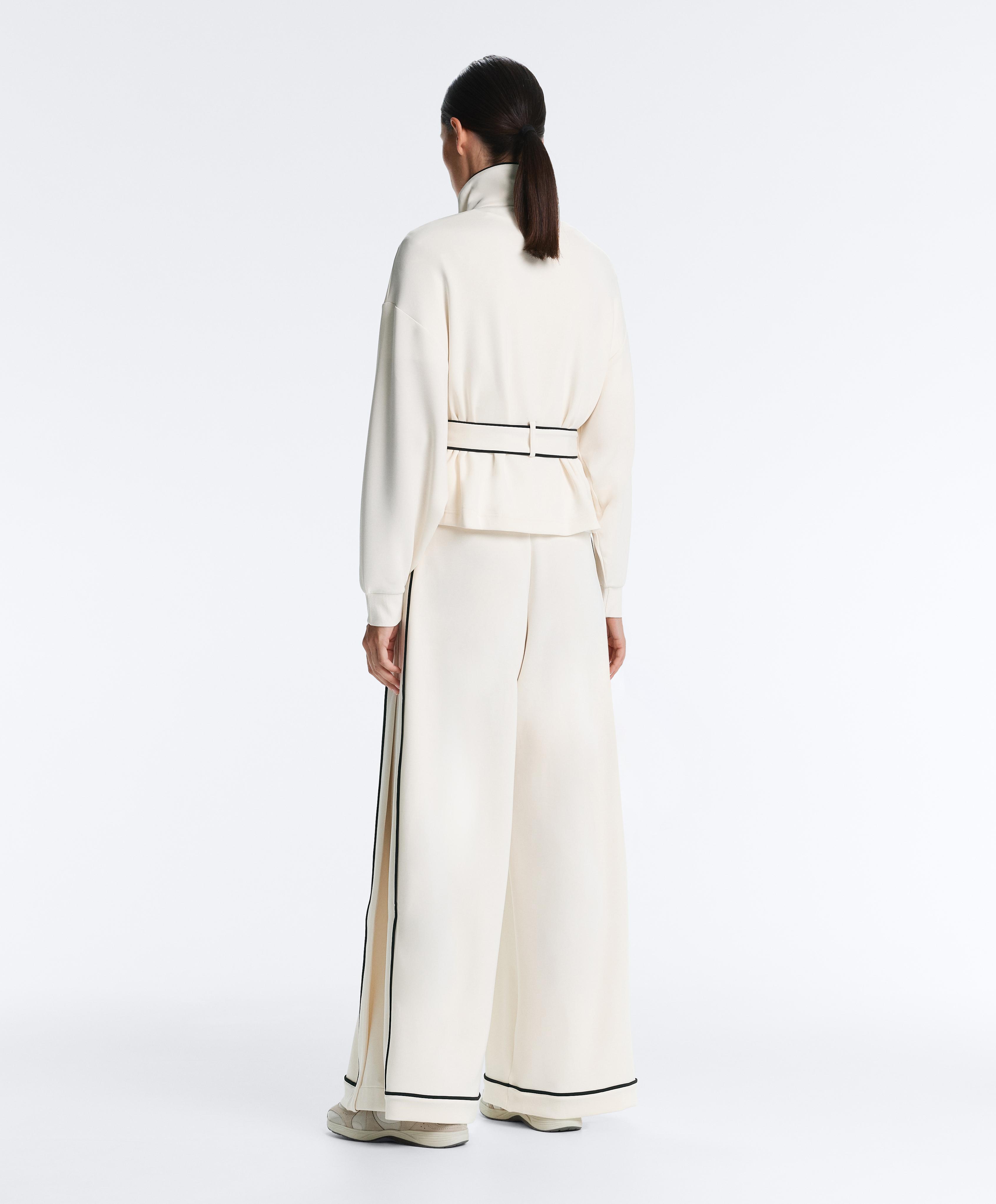Широкие брюки с регулируемым эластичным поясом и передними карманами. Украшены контрастной окантовкой по всей длине штанин. Ткань пиджака – дышащий модал, очень мягкий на ощупь.