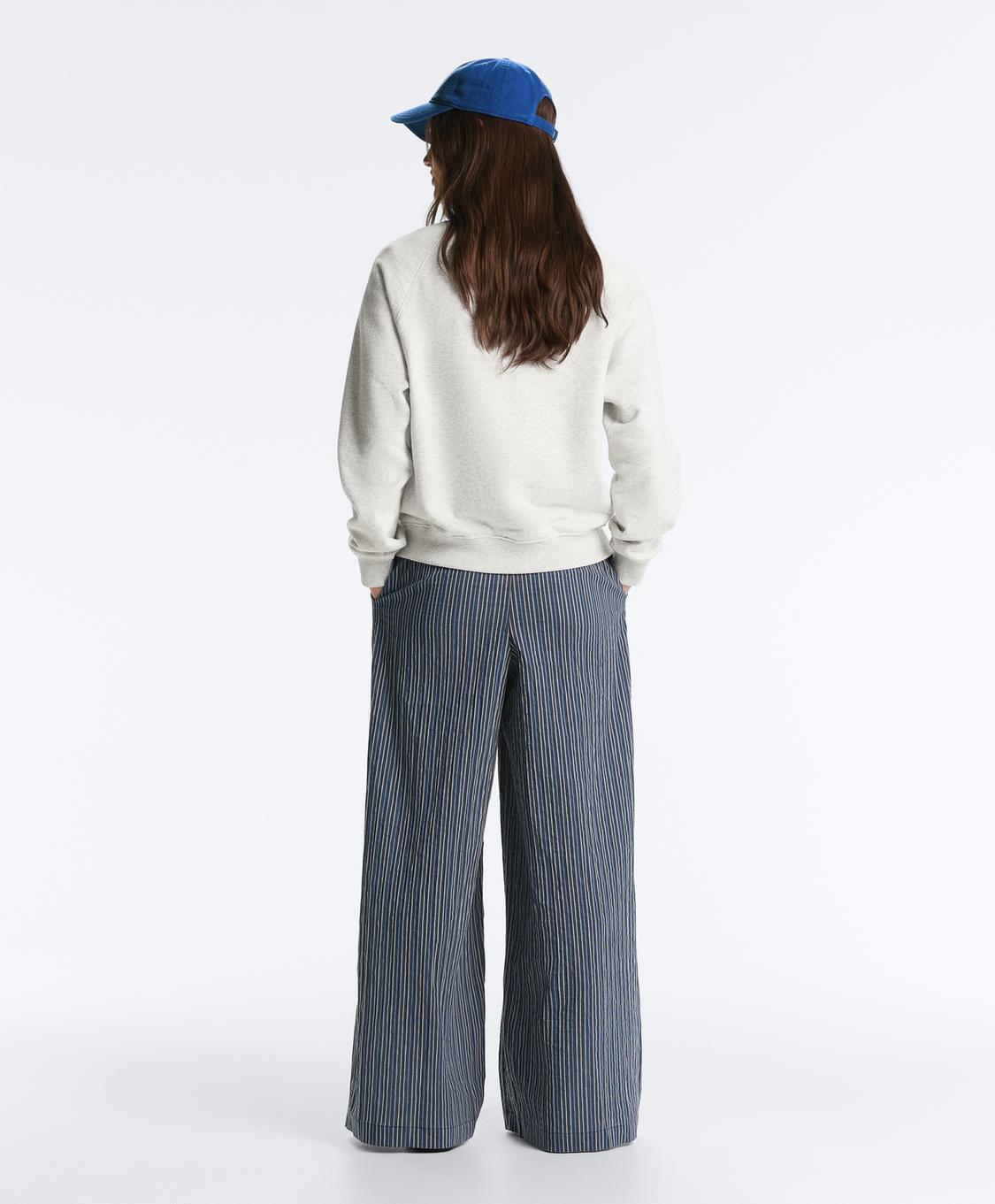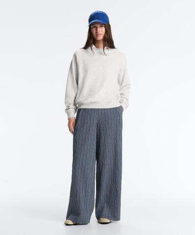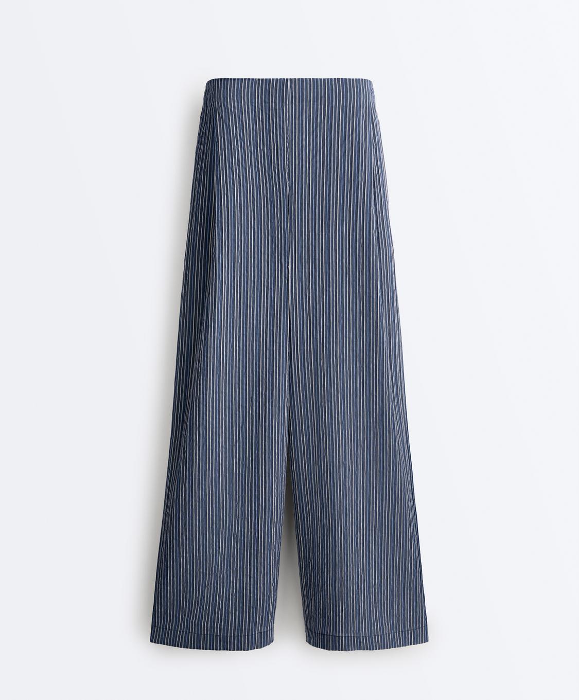 Широкие брюки в полоску с регулируемым эластичным поясом. Ткань — смесовый хлопок.