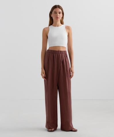 Широкие прямые брюки с перекрестными штанинами спереди. С передними карманами и регулируемым эластичным поясом. Ткань: 100% лен.