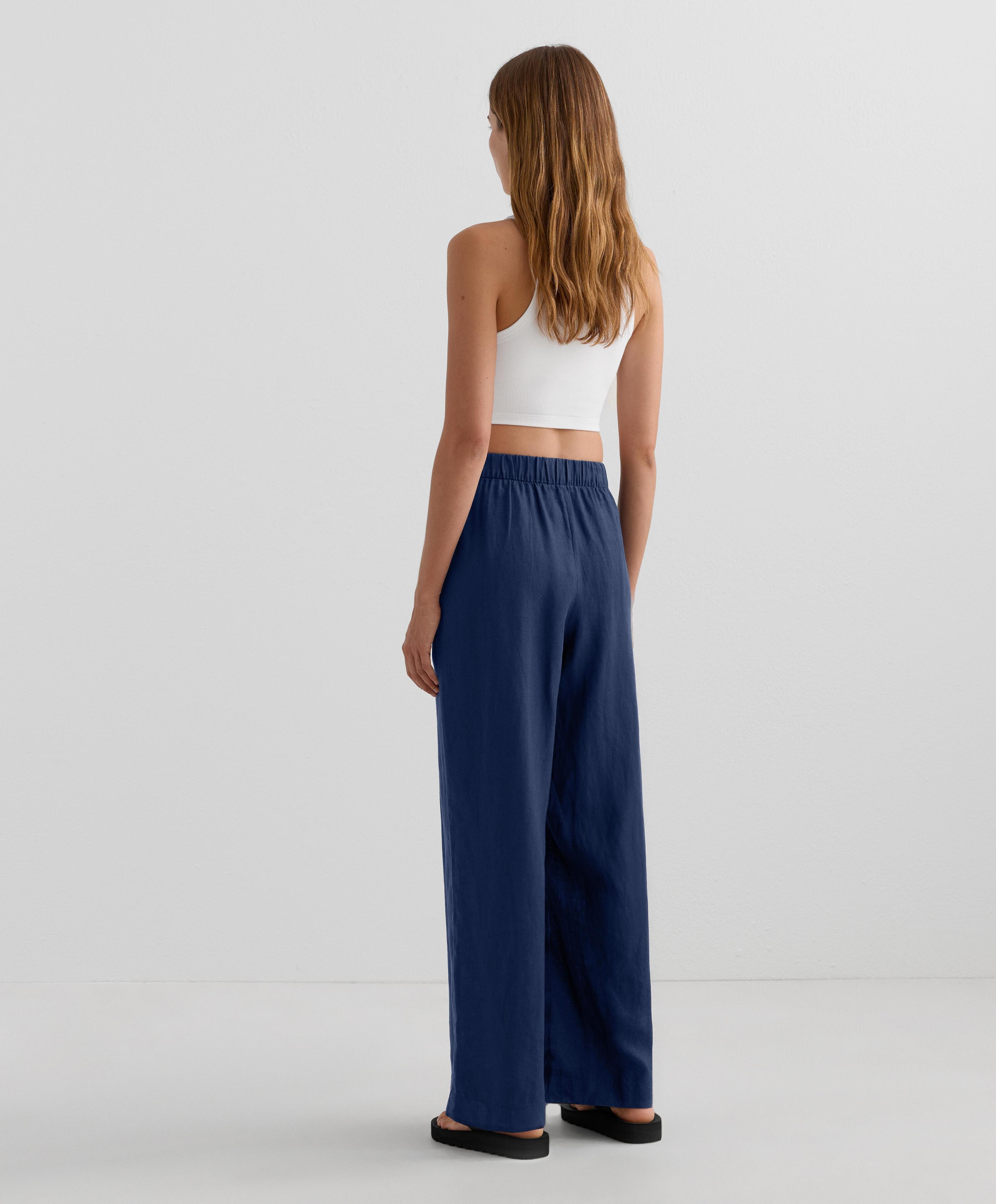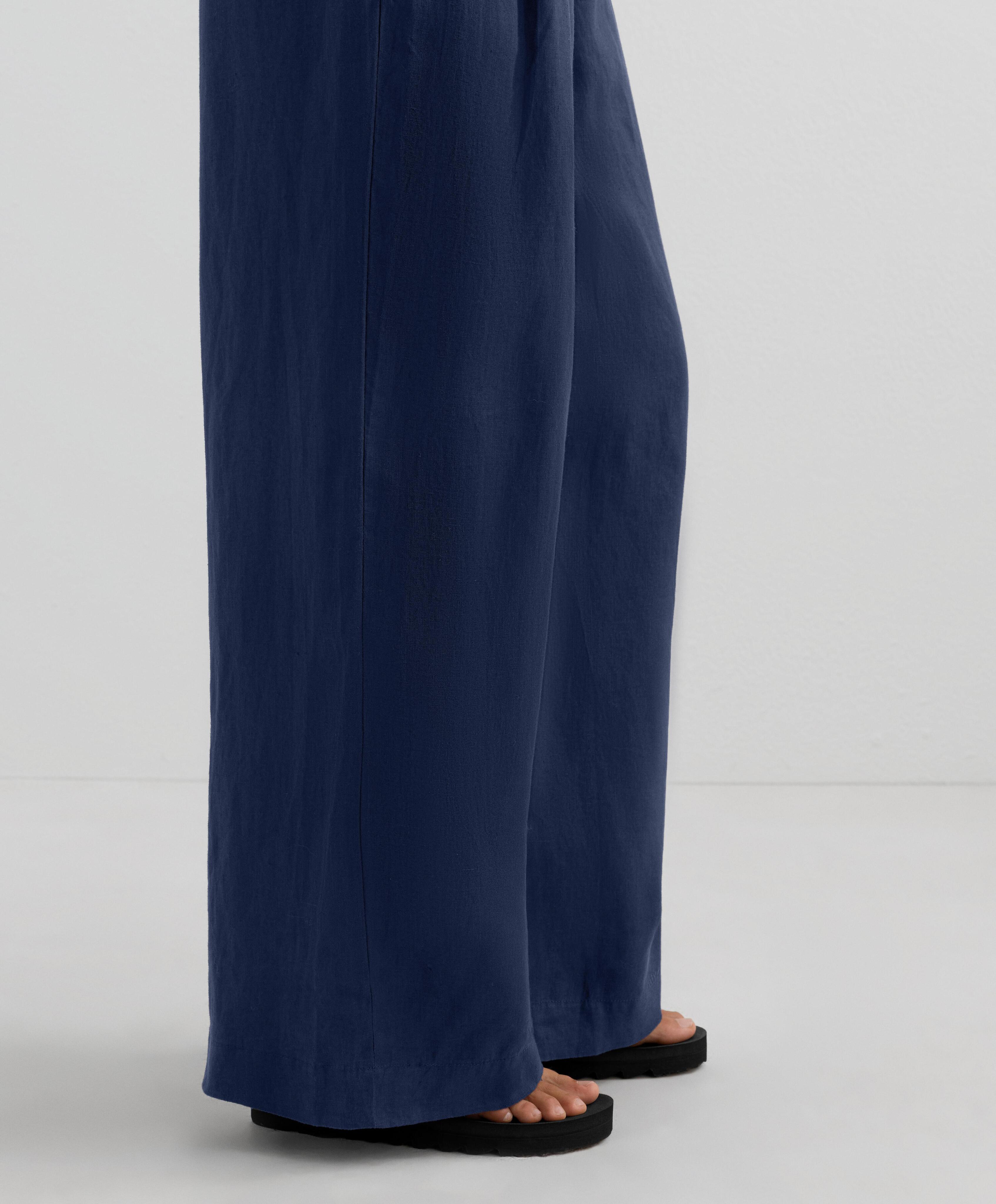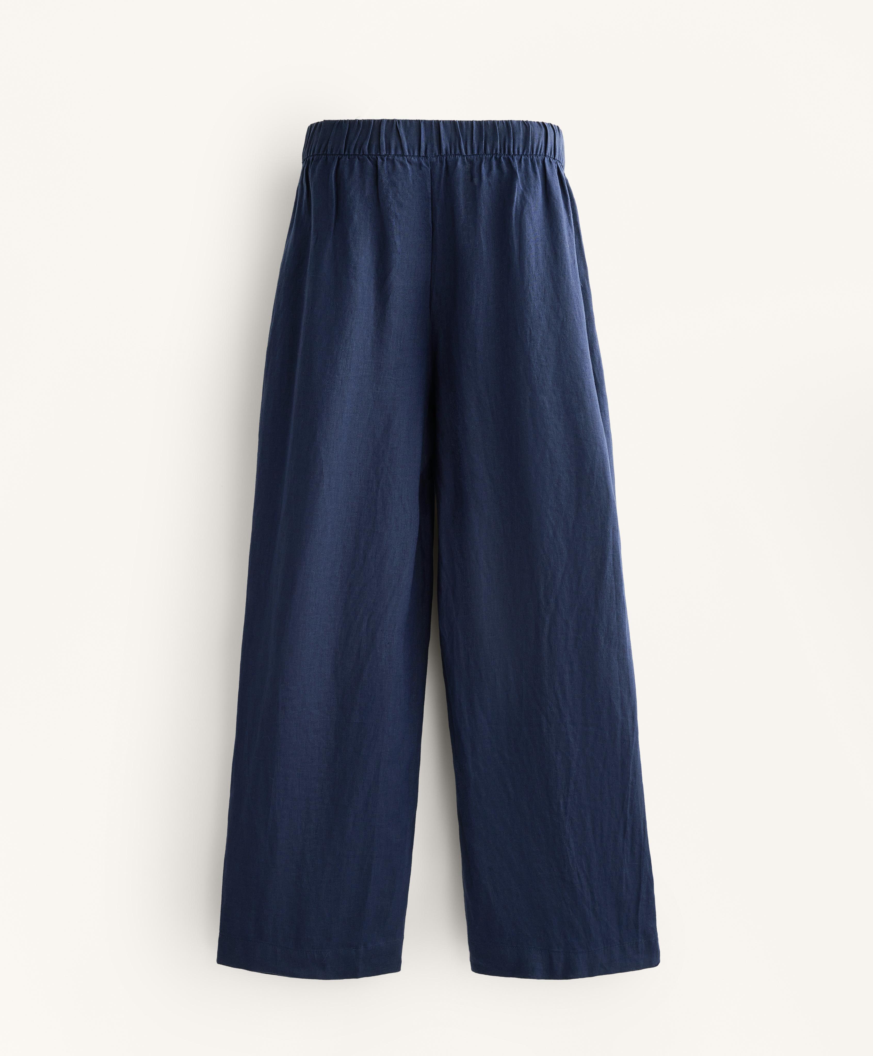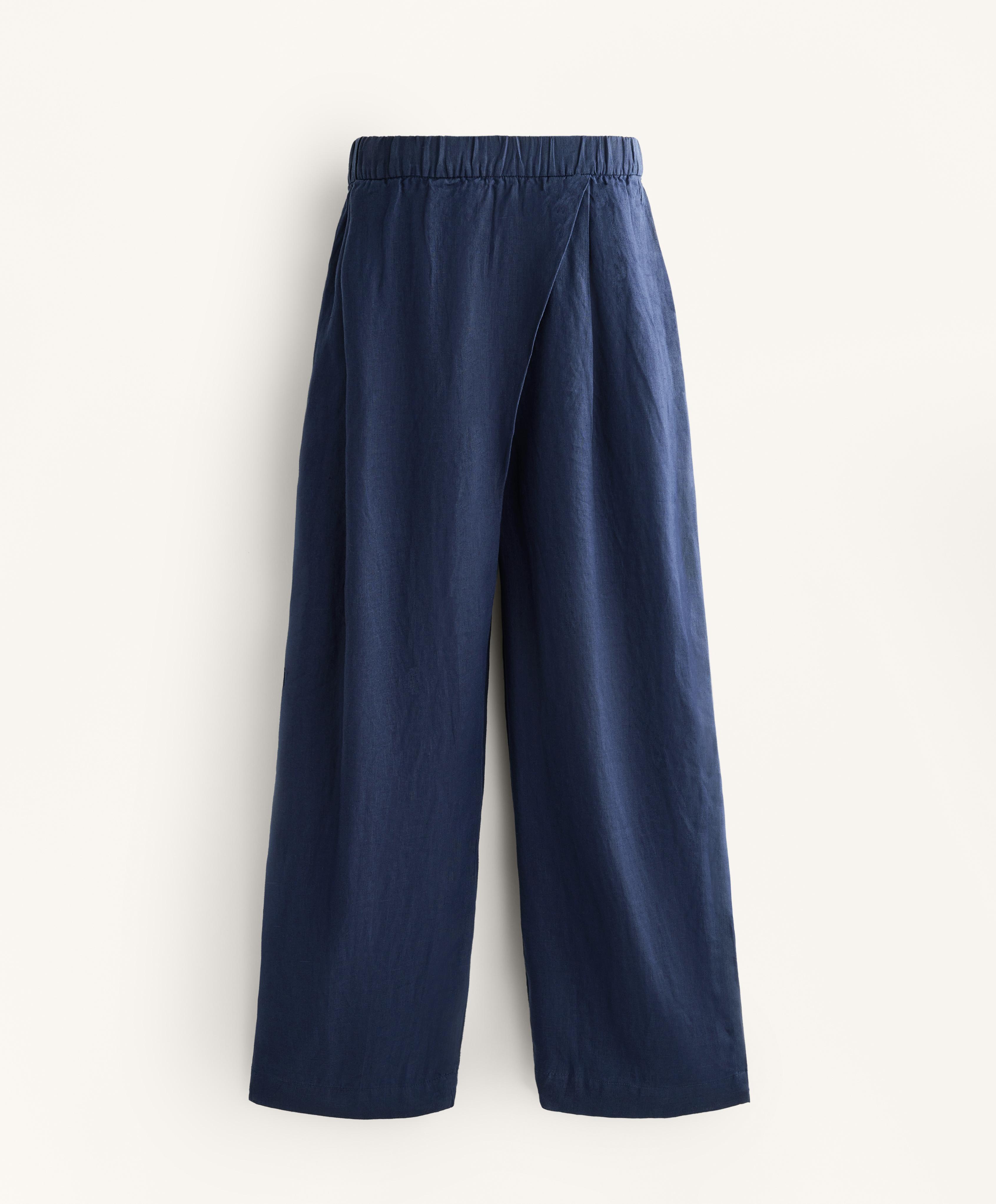 Широкие прямые брюки с перекрестными штанинами спереди. С передними карманами и регулируемым эластичным поясом. Ткань: 100% лен.