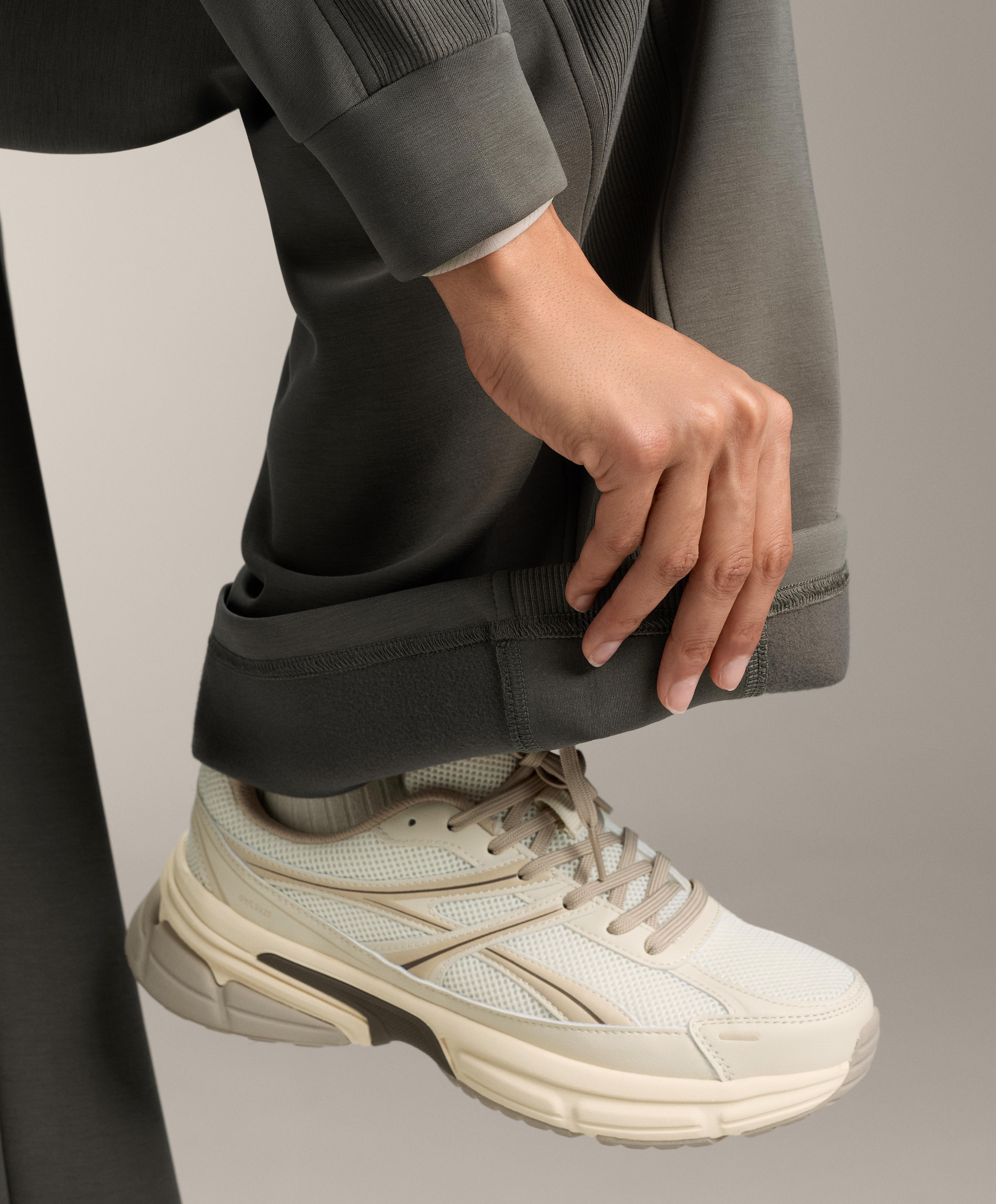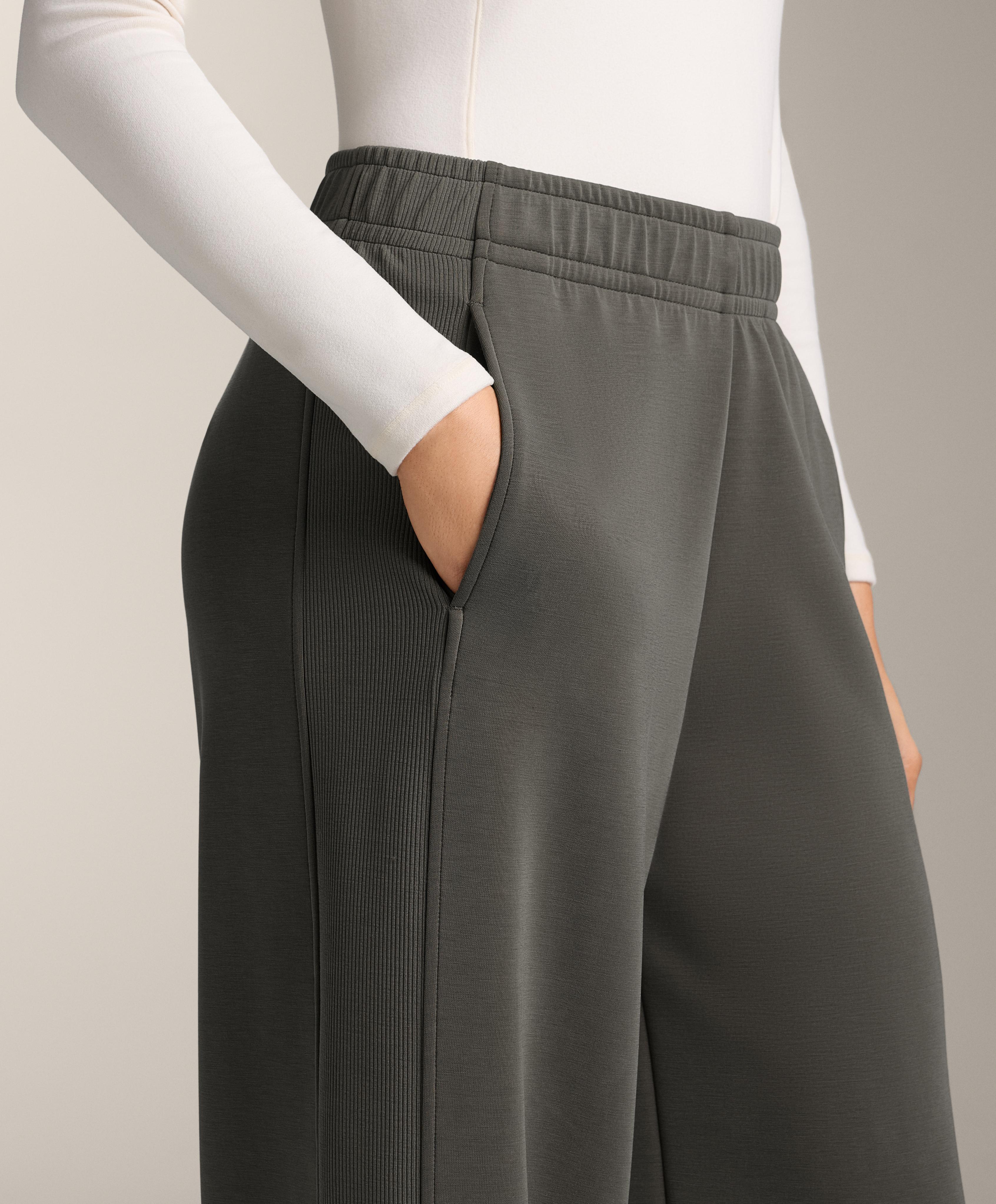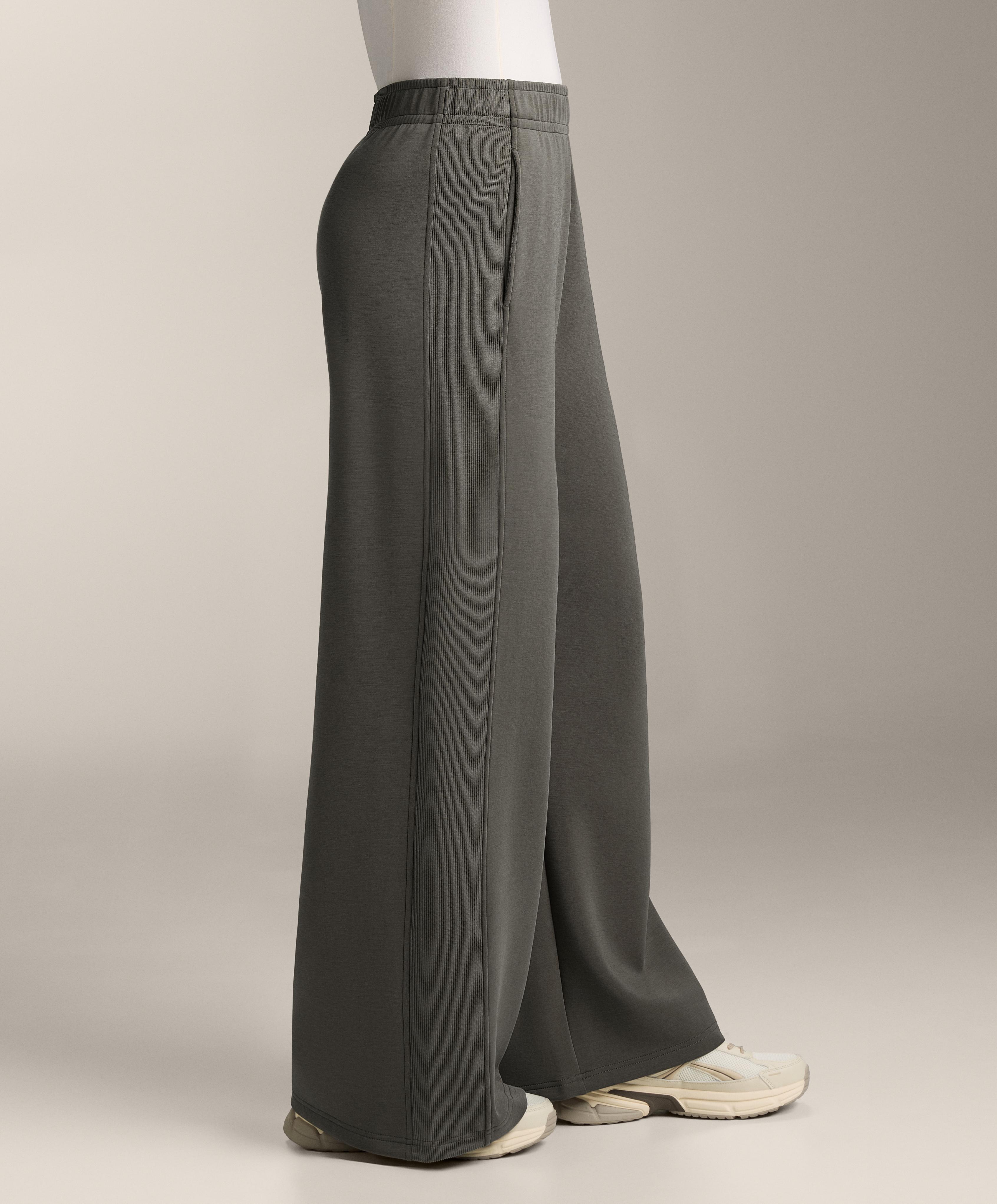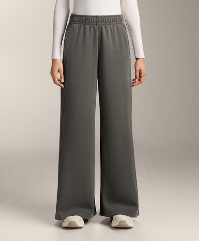 Длинные прямые брюки с широкими штанинами, регулируемым эластичным поясом и передними карманами. Ребристая отделка по бокам штанин. Дышащая ткань из модала с начесом внутри.