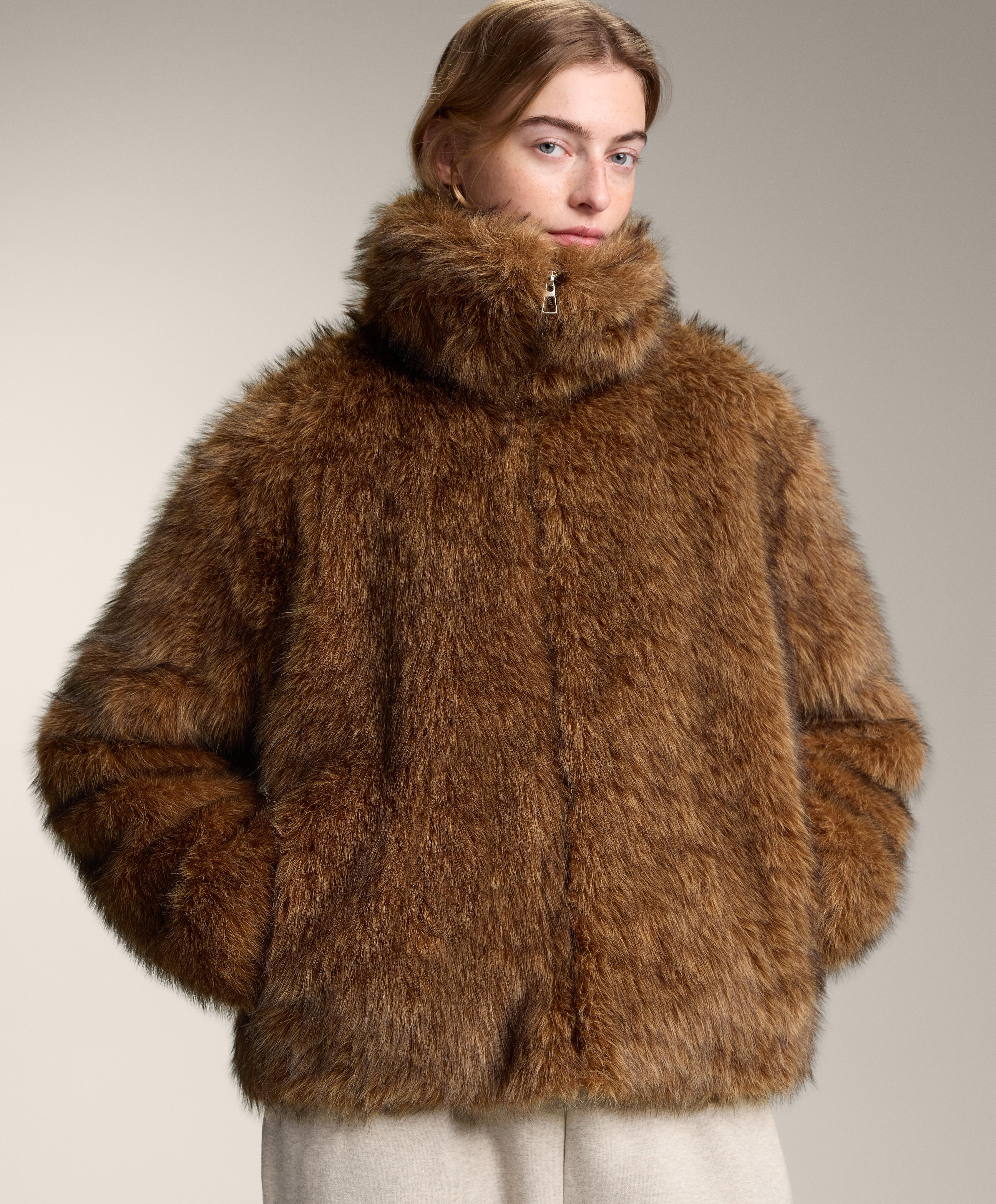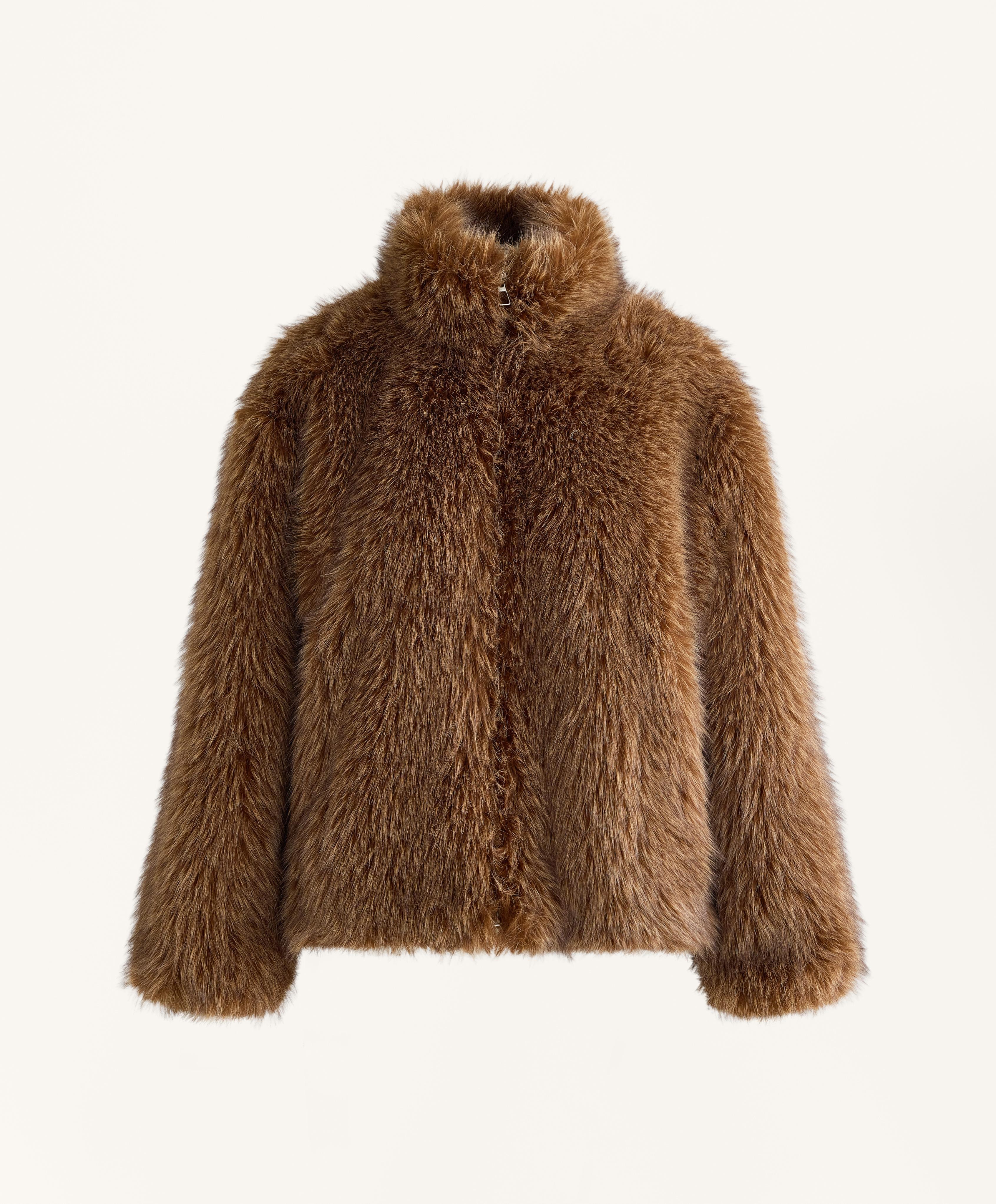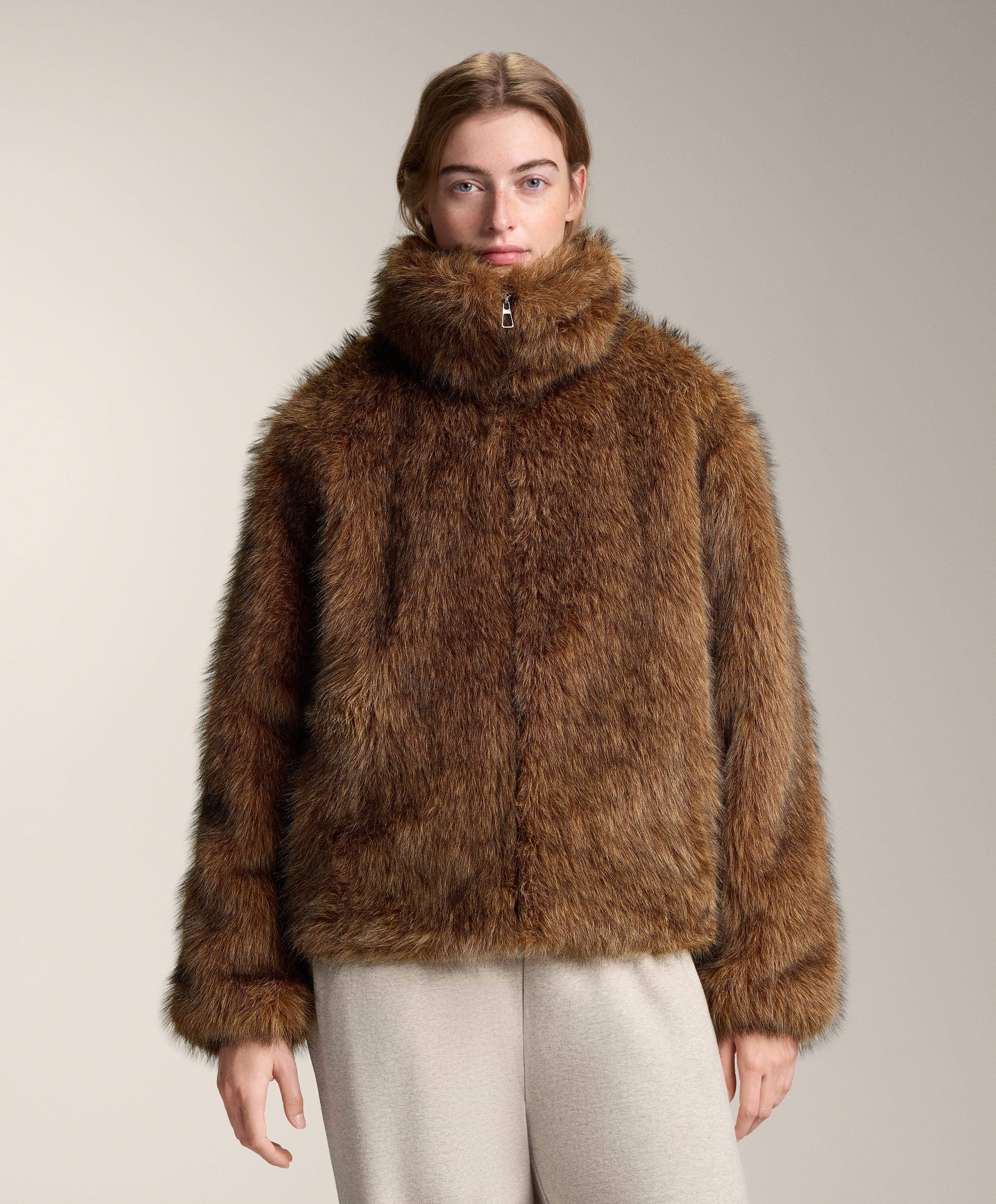 Куртка из искусственного меха с воротником-стойкой. Застежка-молния спереди. Боковые карманы и кулиска по нижнему краю. Рукава с эластичными манжетами внутри.