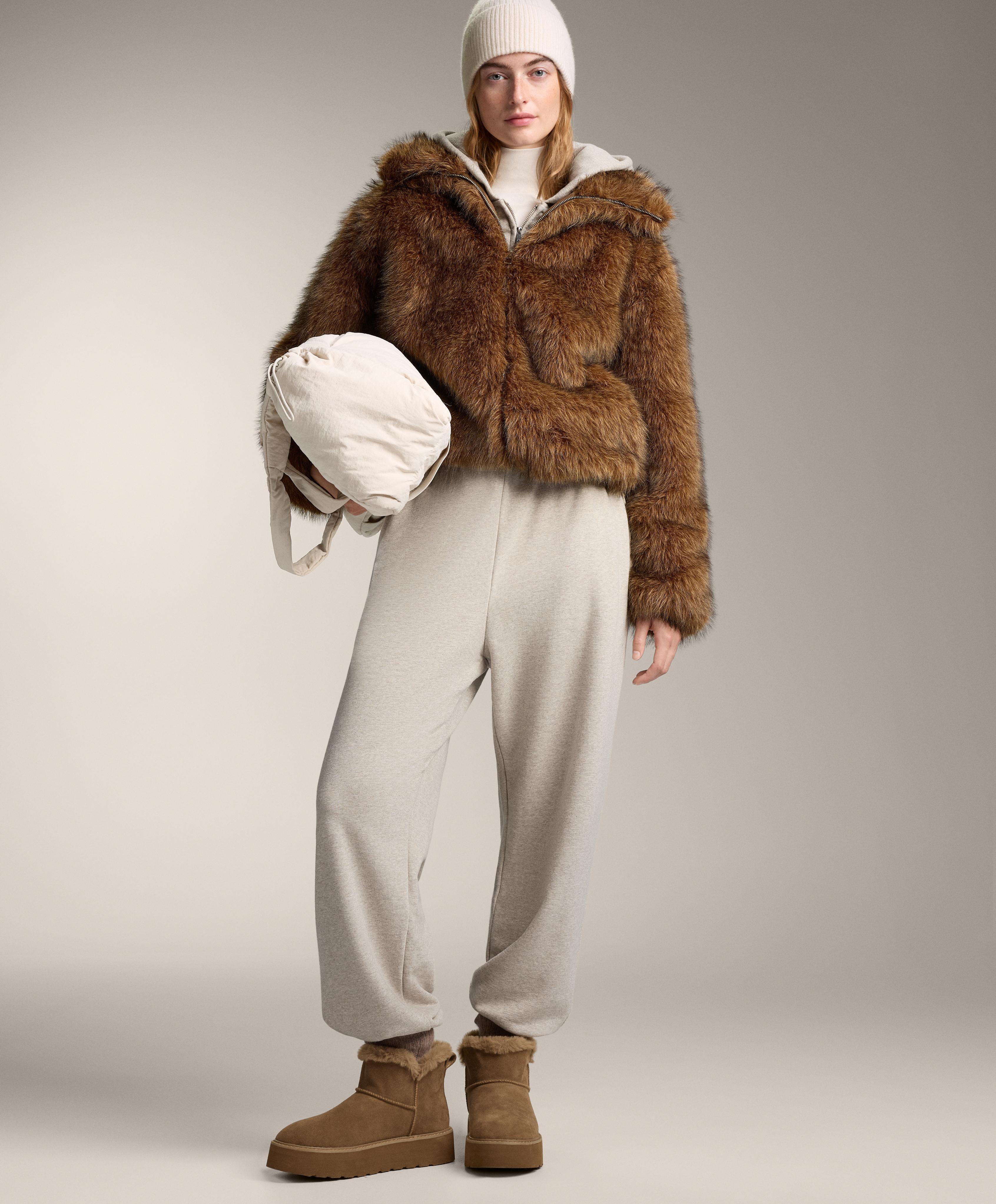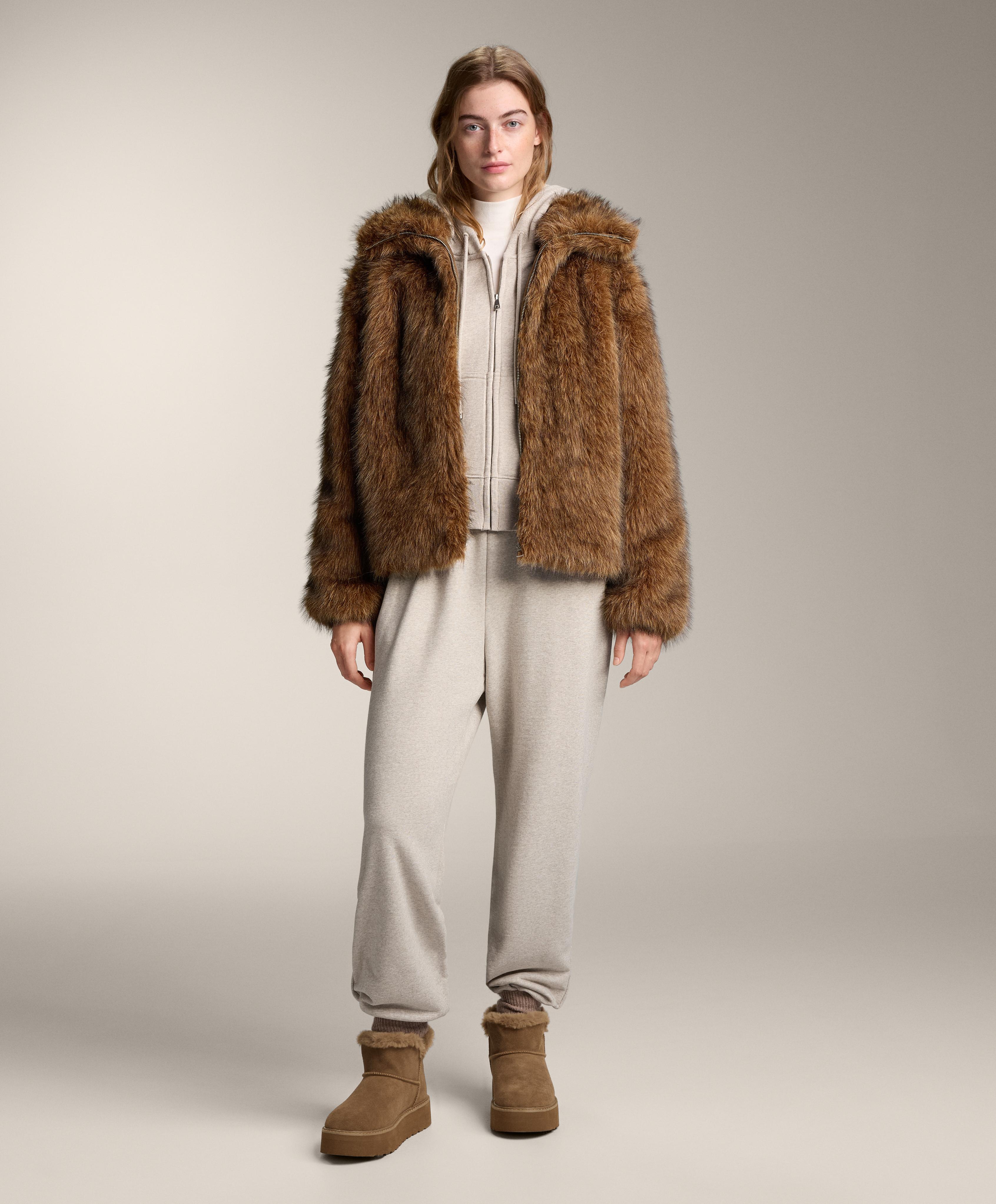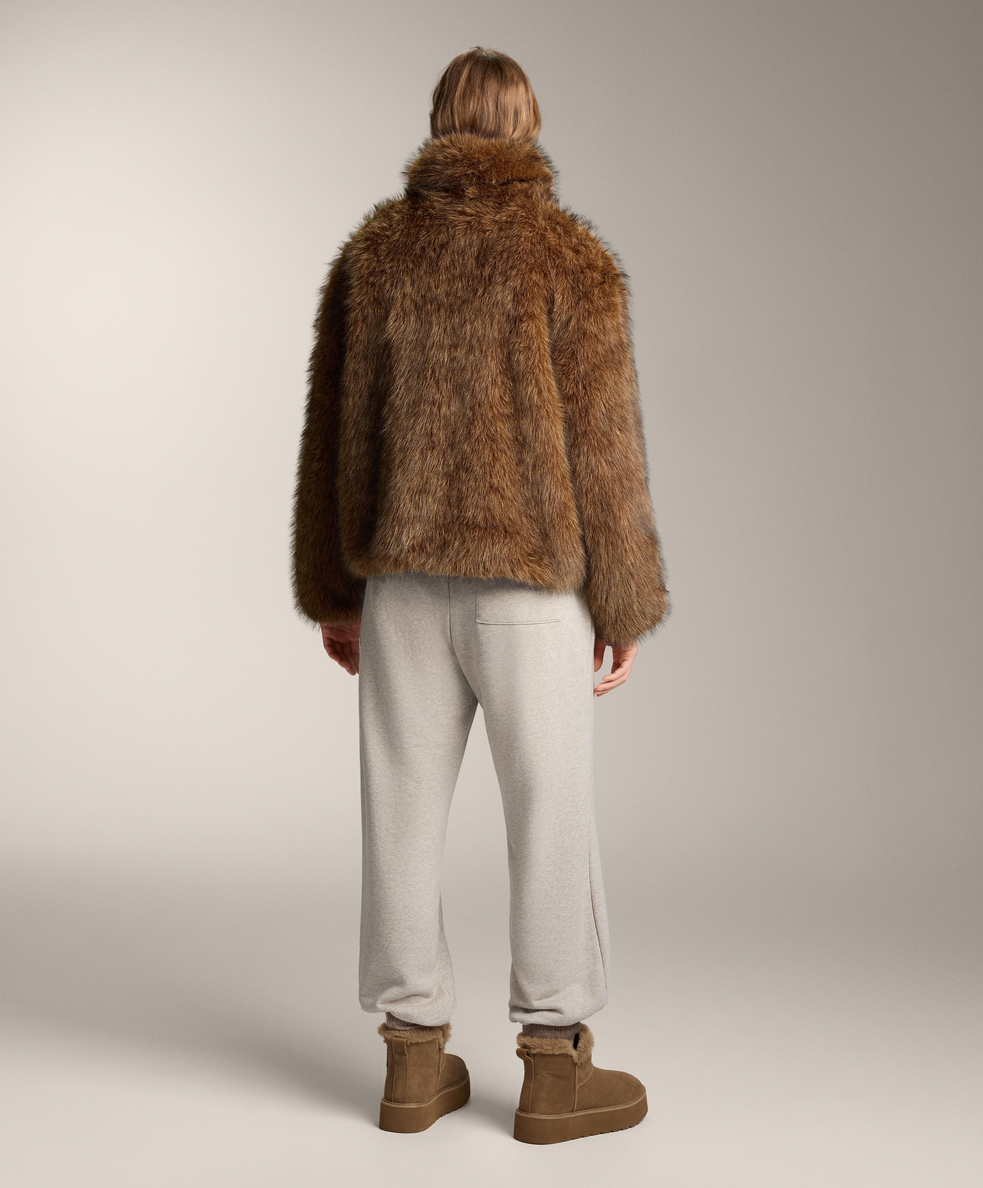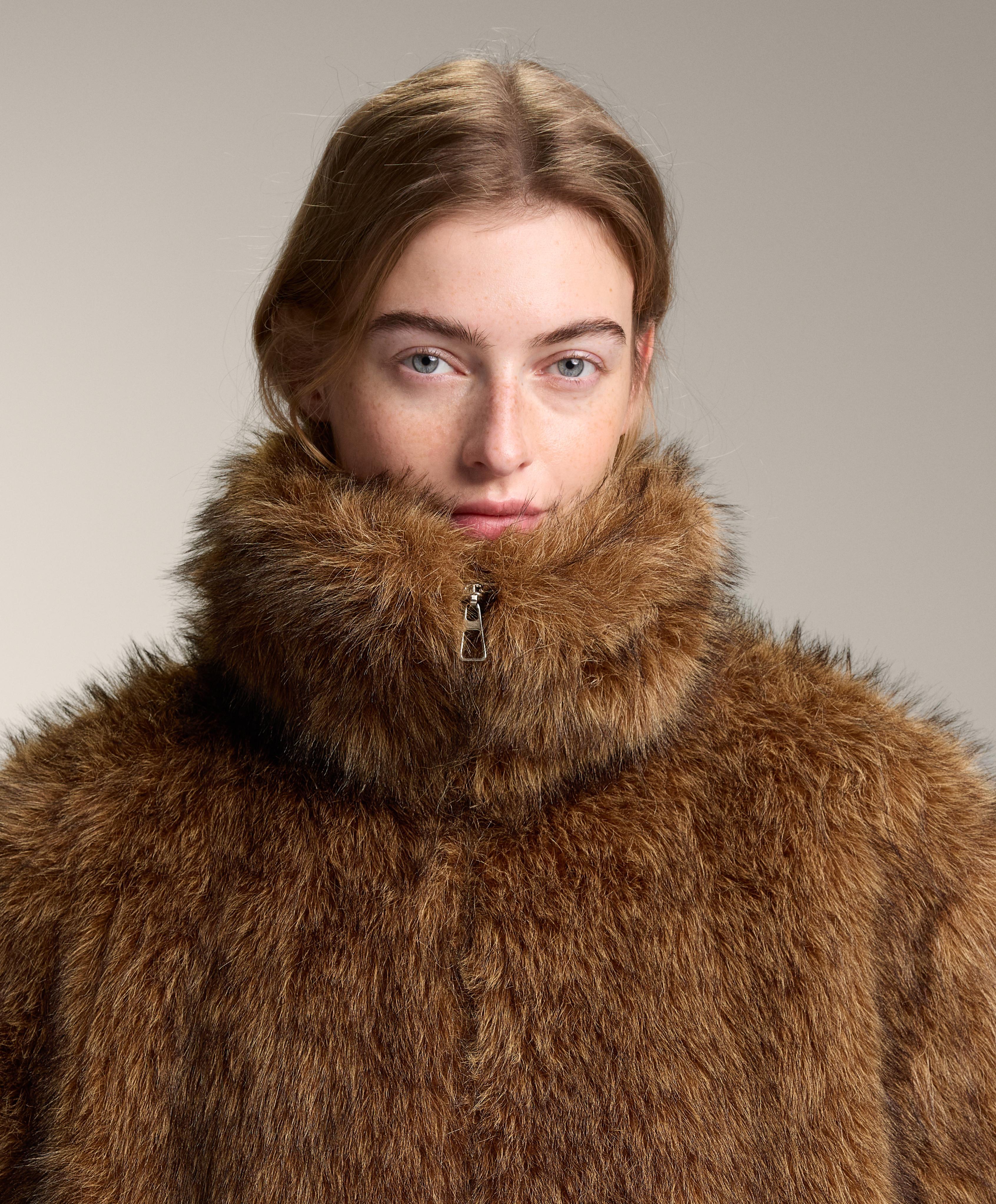 Куртка из искусственного меха с воротником-стойкой. Застежка-молния спереди. Боковые карманы и кулиска по нижнему краю. Рукава с эластичными манжетами внутри.