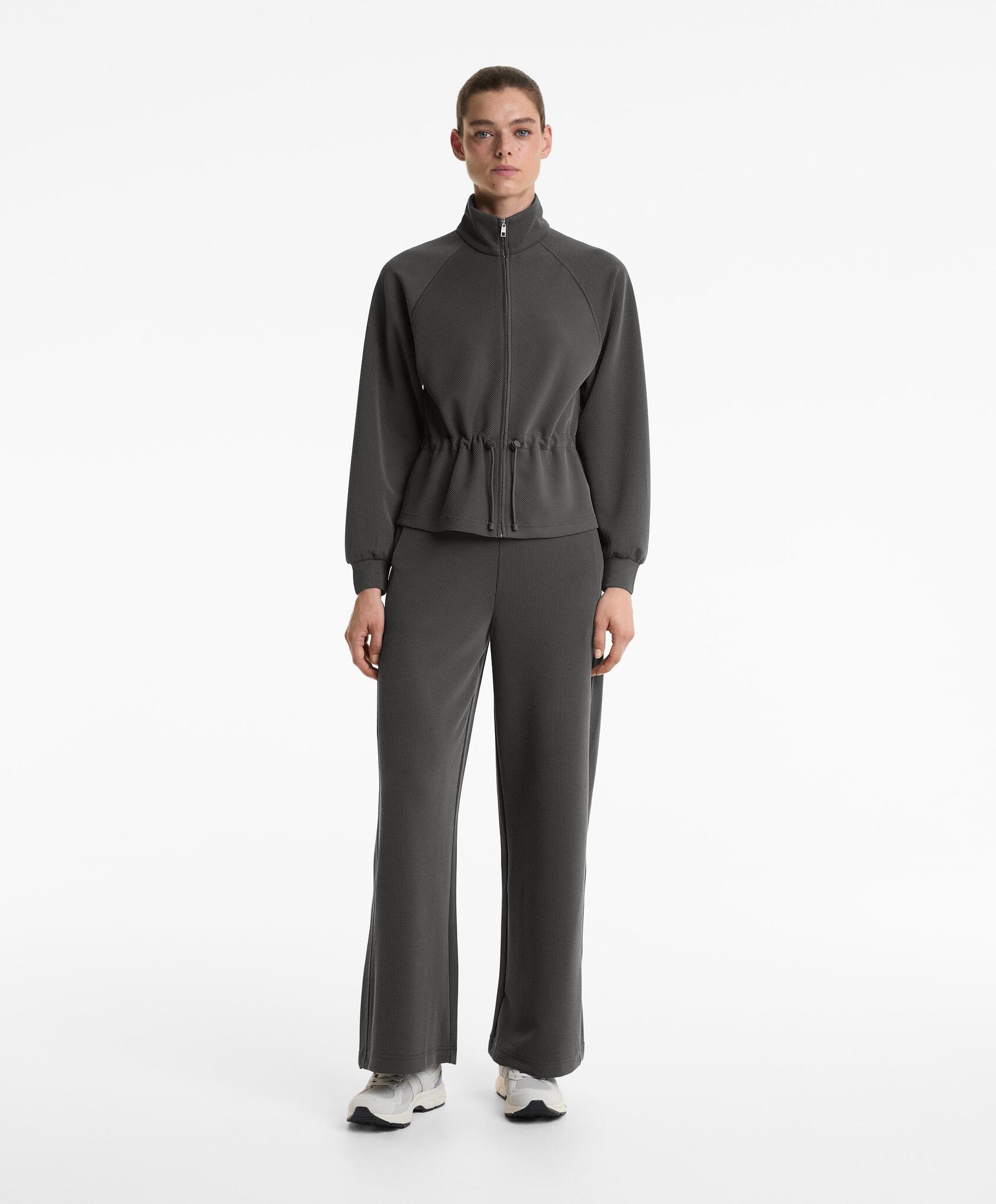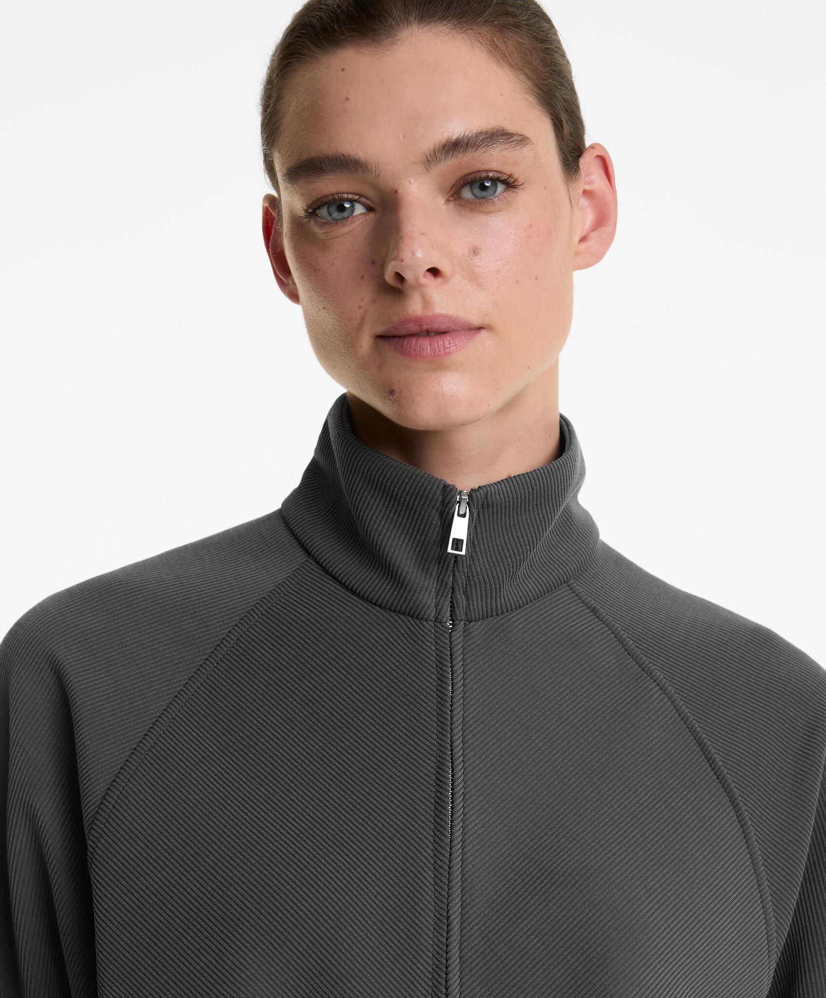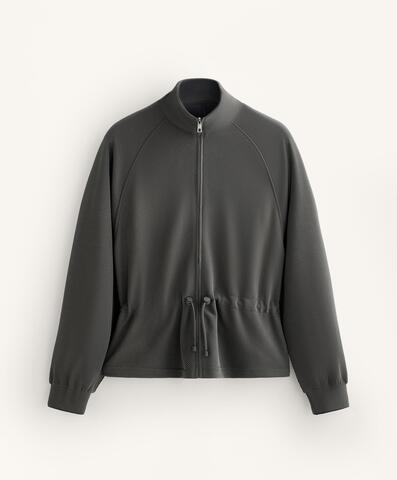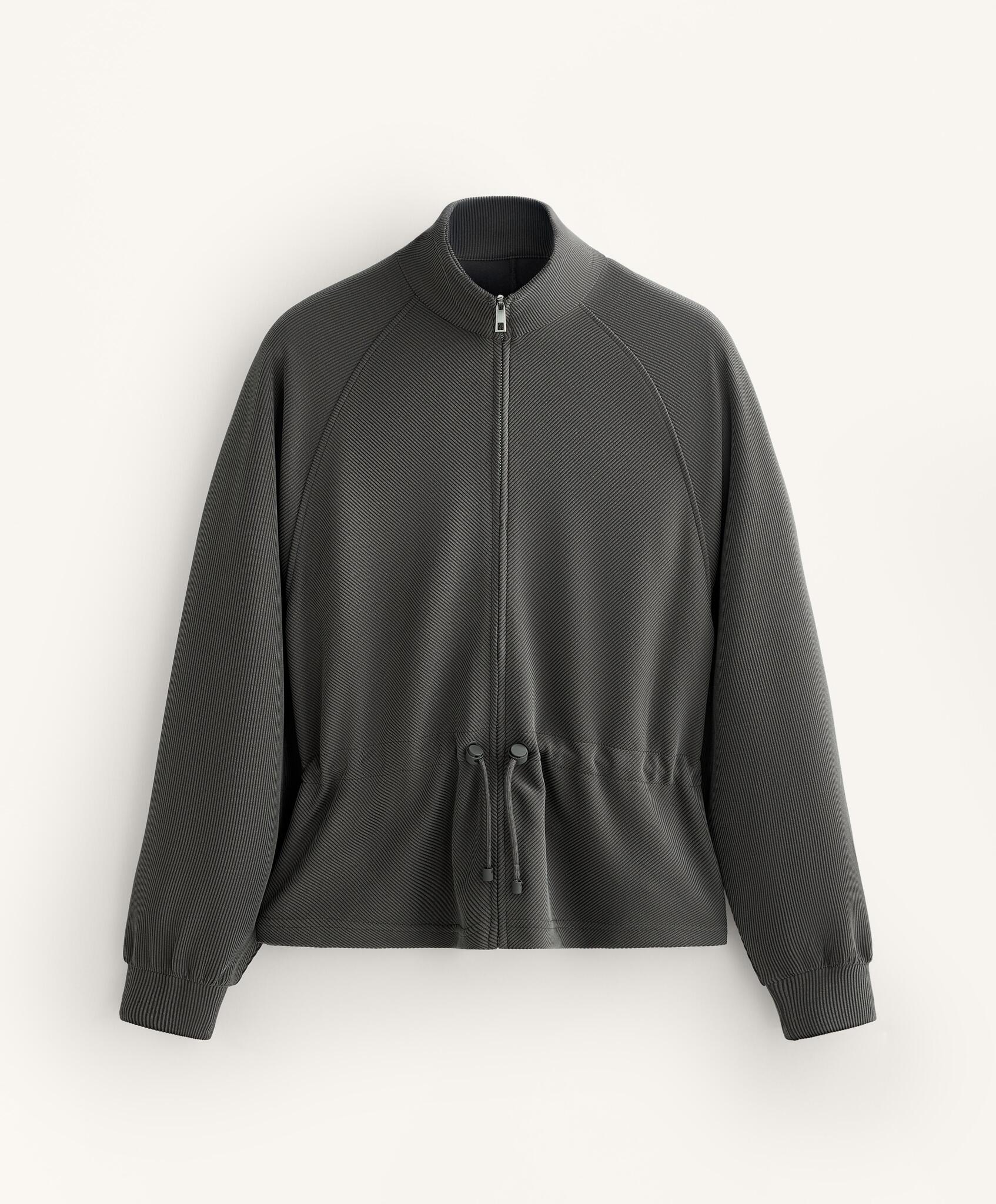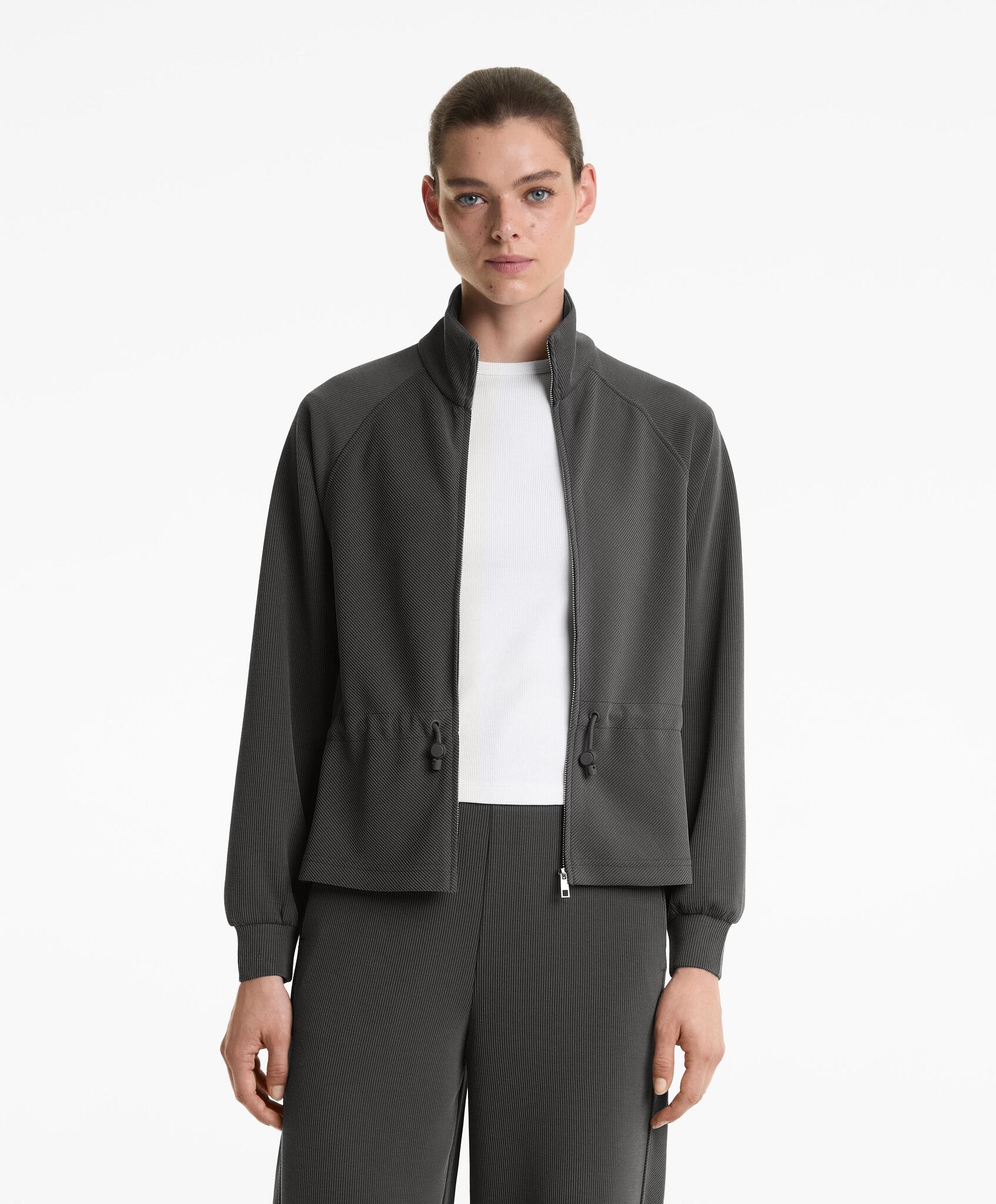 Куртка на молнии спереди и с высоким воротом. С регулируемой кулиской на талии и кантом. Ткань в рубчик с содержанием модала 29 %.