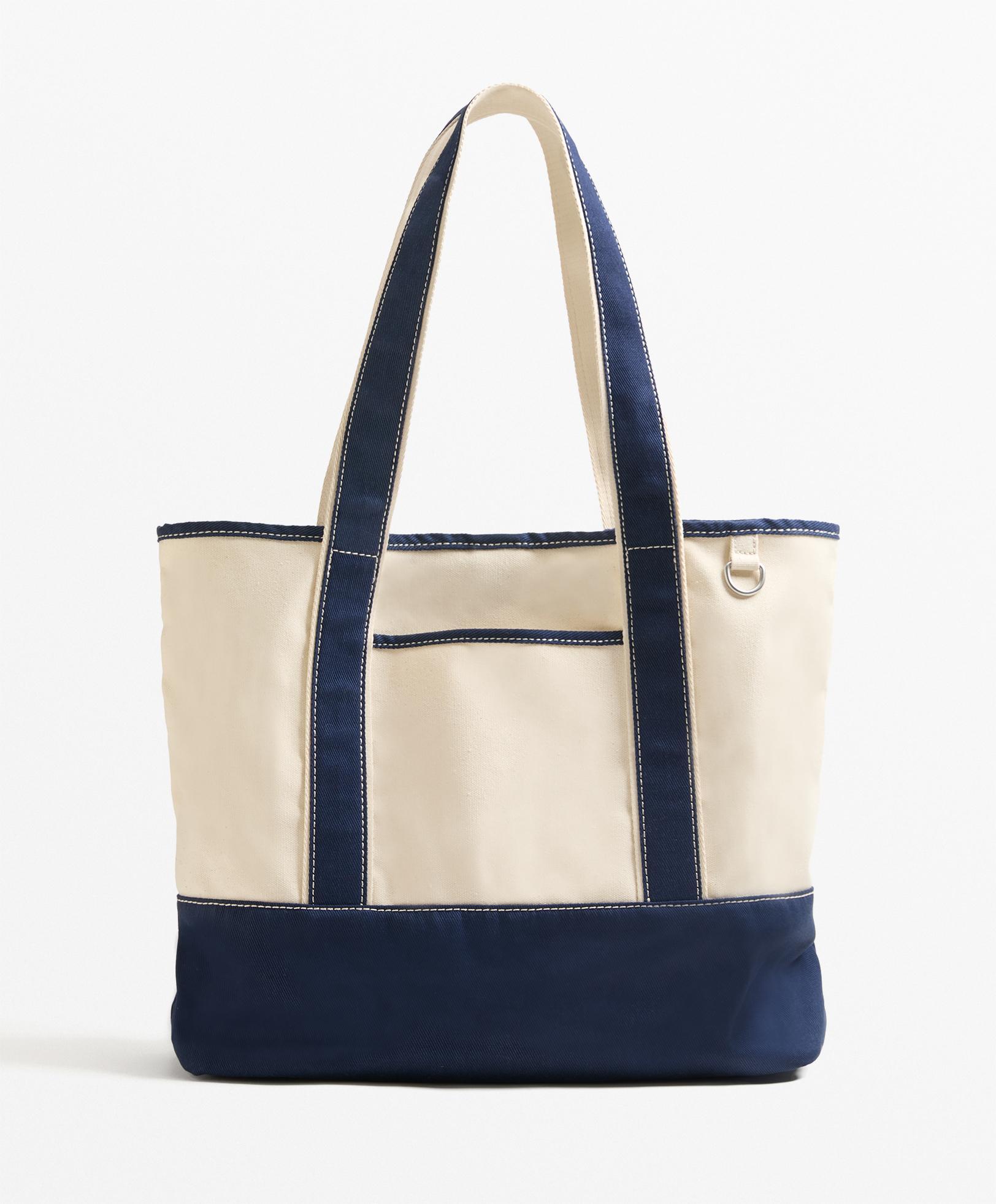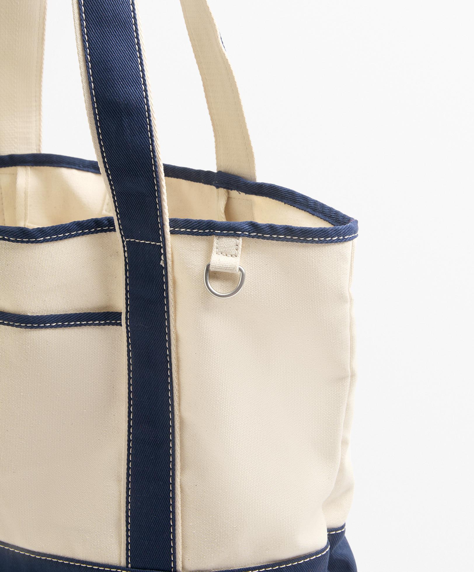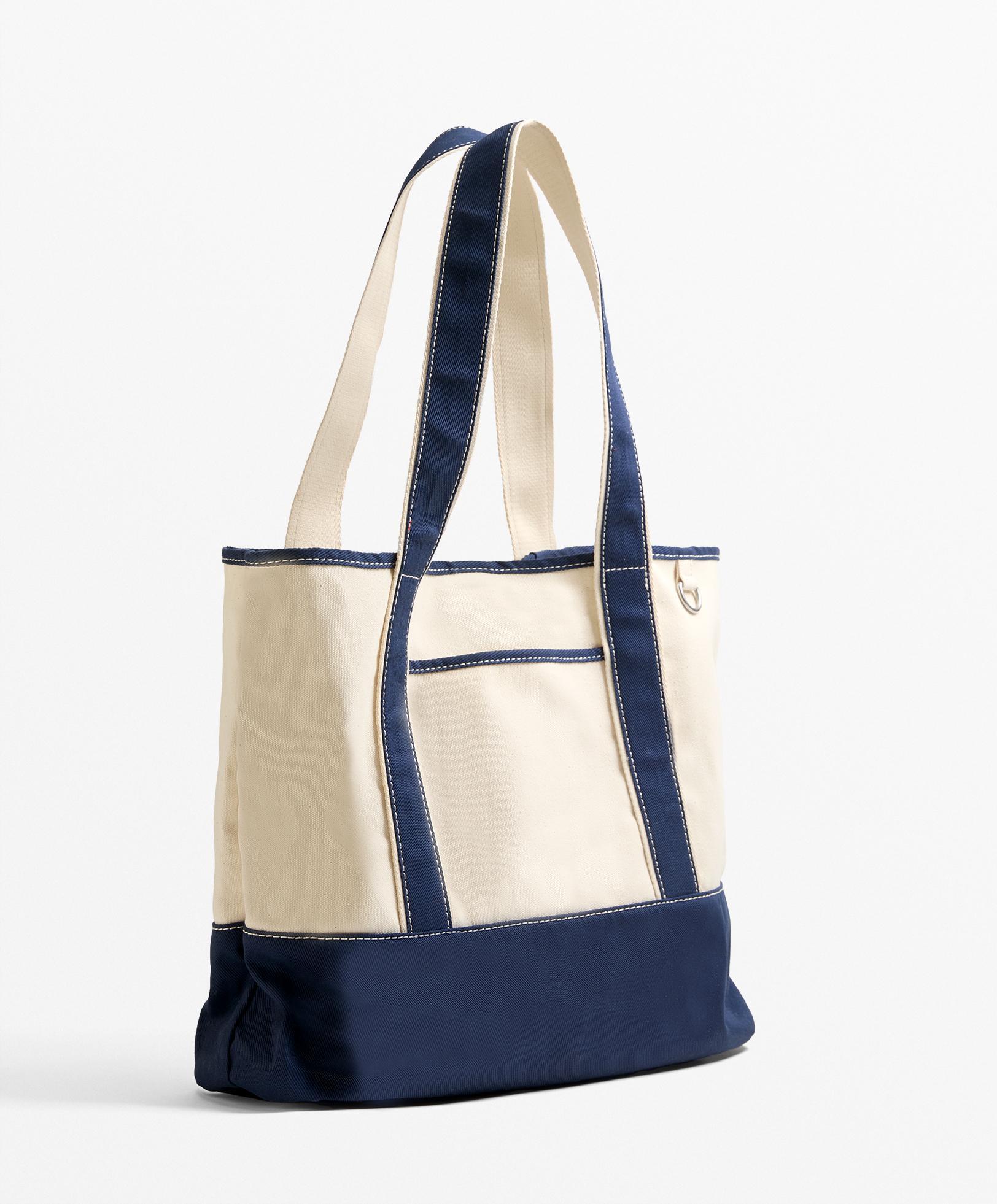Сумка-шоппер из парусиновой ткани с контрастным основанием и ручками. Один внутренний и один внешний карман. Также есть внутренний крючок и пряжка, чтобы можно было повесить несессер, бутылку с водой, кошелек и т. д. Застежка на пуговицы. Размеры: 37 x 50 x 13 см. Размеры ремня: 30 см.