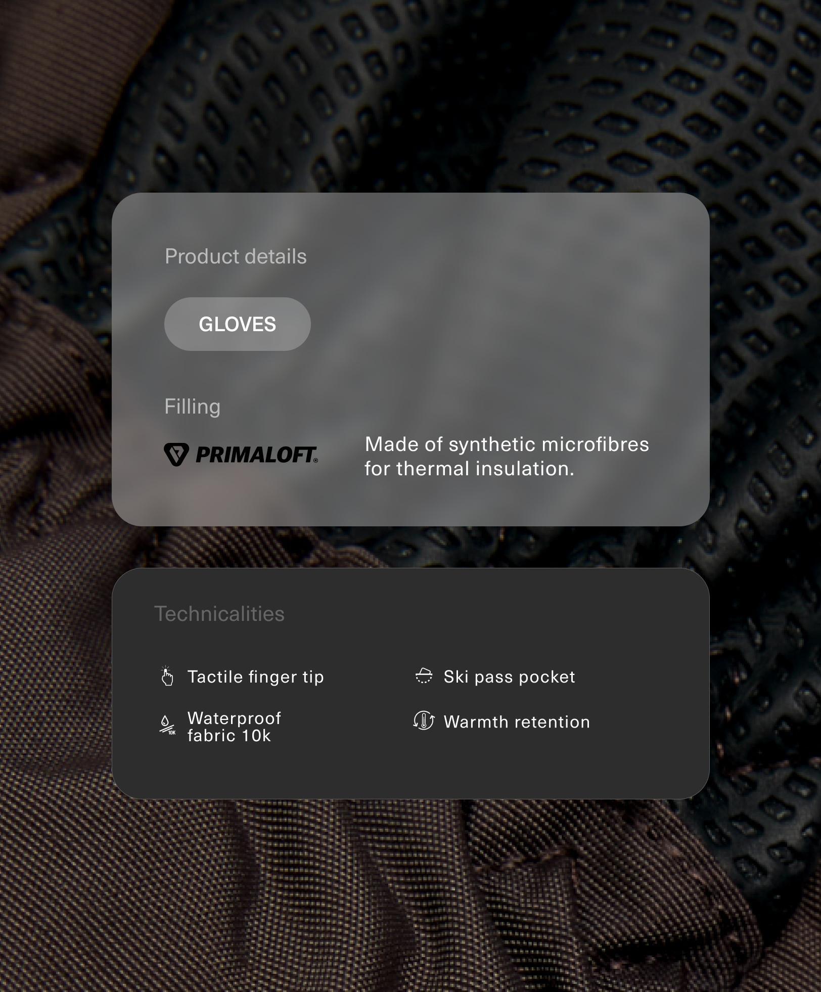 Перчатки из технологичной ткани с наполнителем Primaloft®. Технология Primaloft® заключается в использовании синтетических микроволокон, обеспечивающих теплоизоляцию. Даже во влажном состоянии перчатки сохраняют свои теплоизоляционные свойства и лёгкость, обеспечивая тепло и комфорт. Изготовлены из водонепроницаемой ткани 10K, что гарантирует защиту от снега и влаги. Сенсорные накладки на кончиках пальцев позволяют пользоваться мобильными устройствами, не снимая их. Функциональный дизайн с карманом для ски-пасса сзади и эластичной регулировкой на запястье.