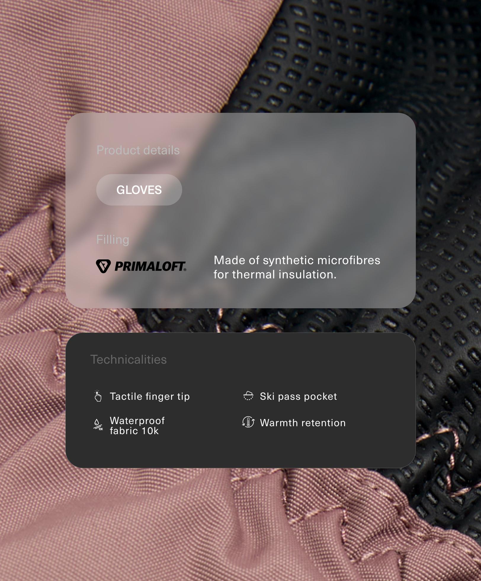 Перчатки из технологичной ткани с наполнителем Primaloft®. Технология Primaloft® заключается в использовании синтетических микроволокон, обеспечивающих теплоизоляцию. Даже во влажном состоянии перчатки сохраняют свои теплоизоляционные свойства и лёгкость, обеспечивая тепло и комфорт. Изготовлены из водонепроницаемой ткани 10K, что гарантирует защиту от снега и влаги. Сенсорные накладки на кончиках пальцев позволяют пользоваться мобильными устройствами, не снимая их. Функциональный дизайн с карманом для ски-пасса сзади и эластичной регулировкой на запястье.