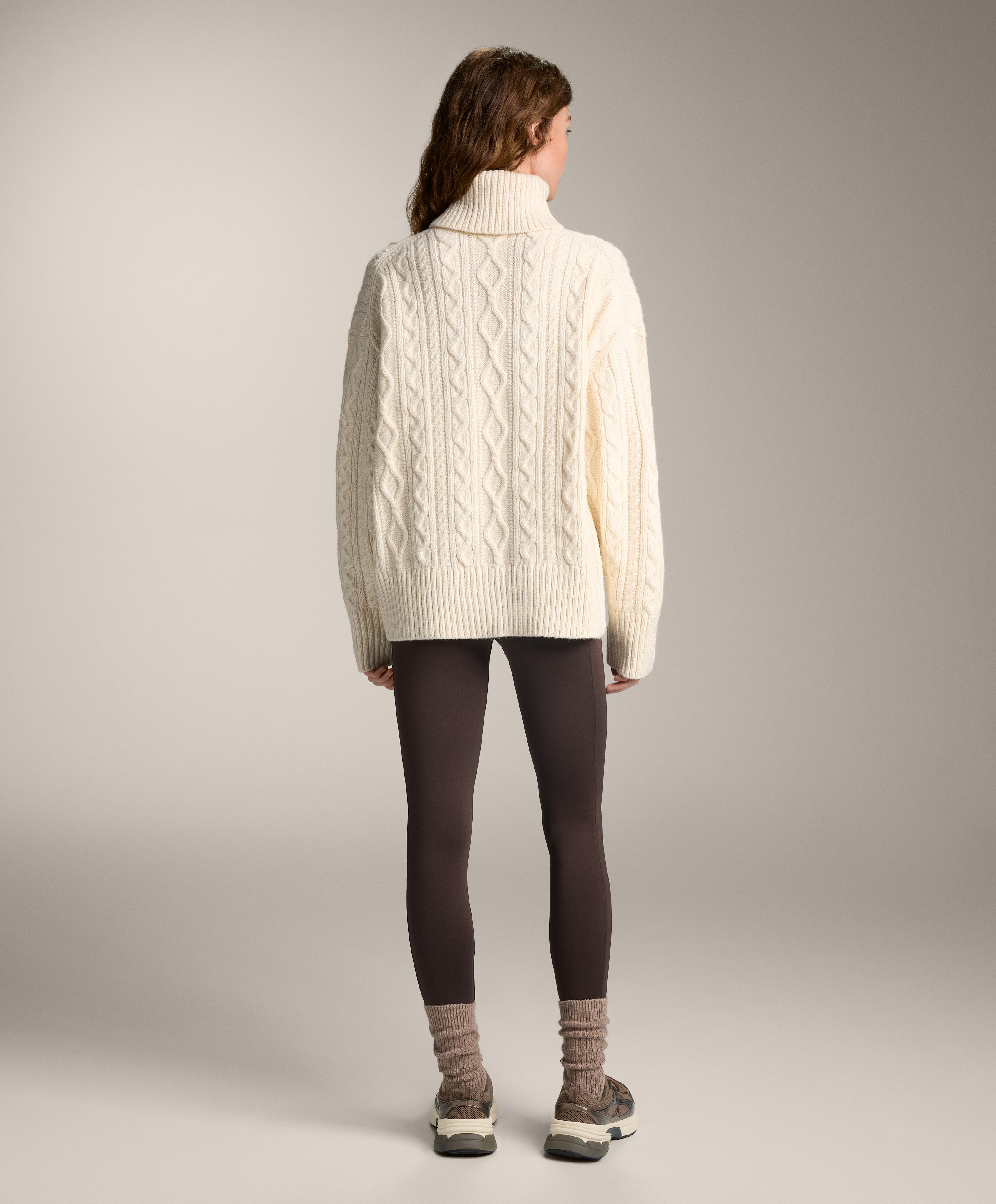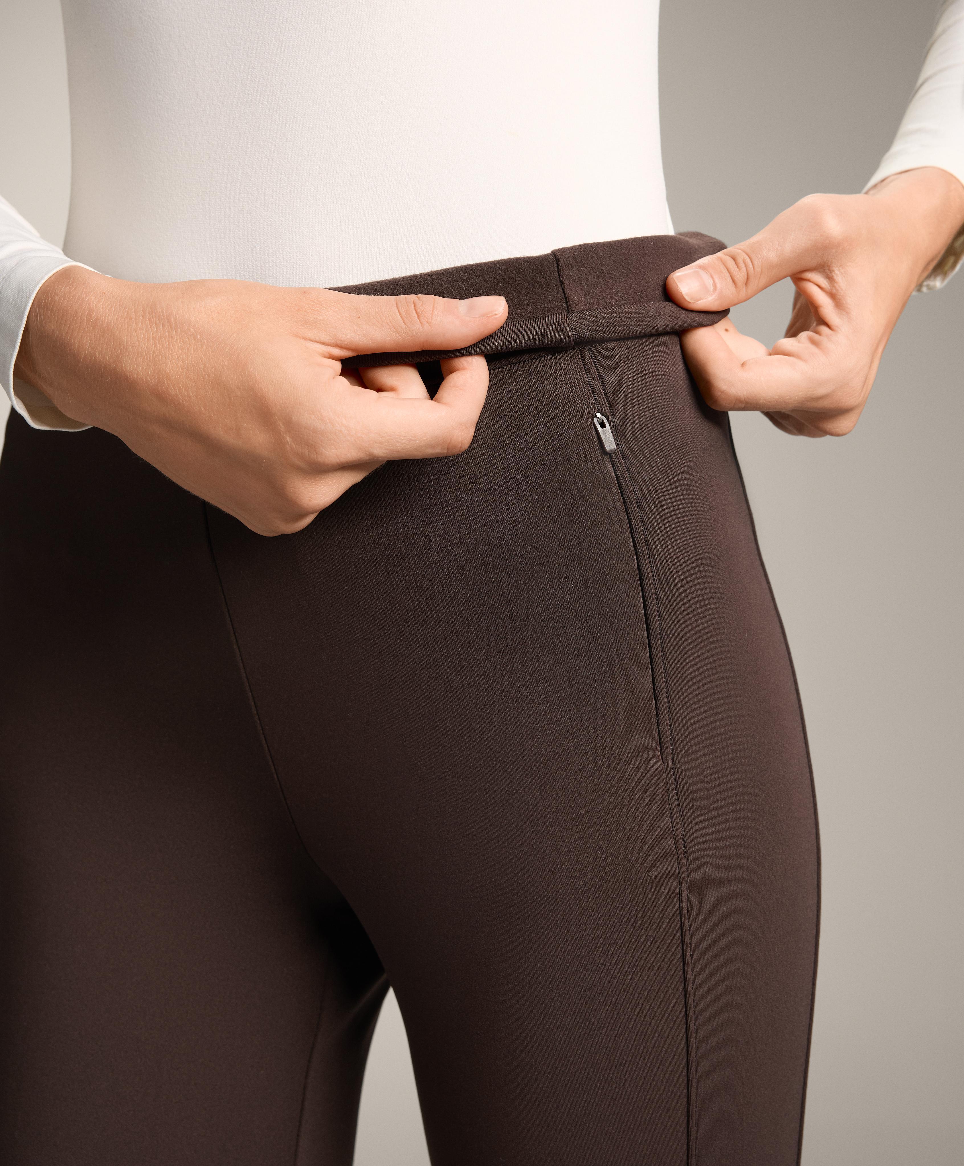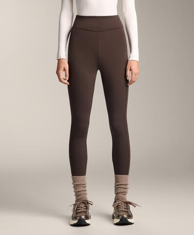 Теплые легинсы с начесом внутри. Длина до щиколотки, высокая талия. Боковые карманы на молнии. Дышащая, высокопрочная ткань. Этот предмет одежды сертифицирован как выдерживающий температуру от +15ºC (низкая активность) до -3ºC (умеренная активность) в ходе стандартизированного испытания с имитацией ветра 0,4 м/с. На нём надета куртка, футболка с длинными рукавами и высоким воротом, нижнее белье, носки, обувь, перчатки и вязаная шапка.