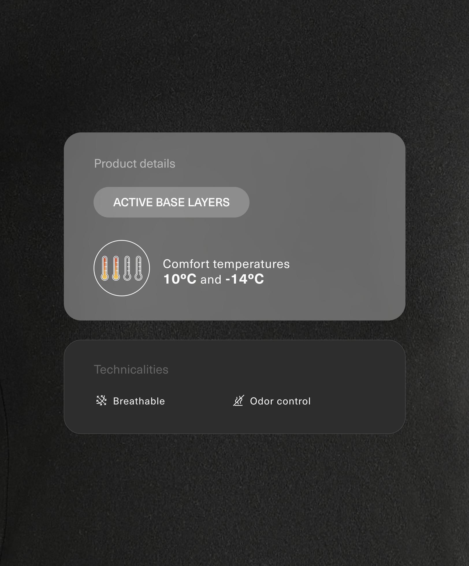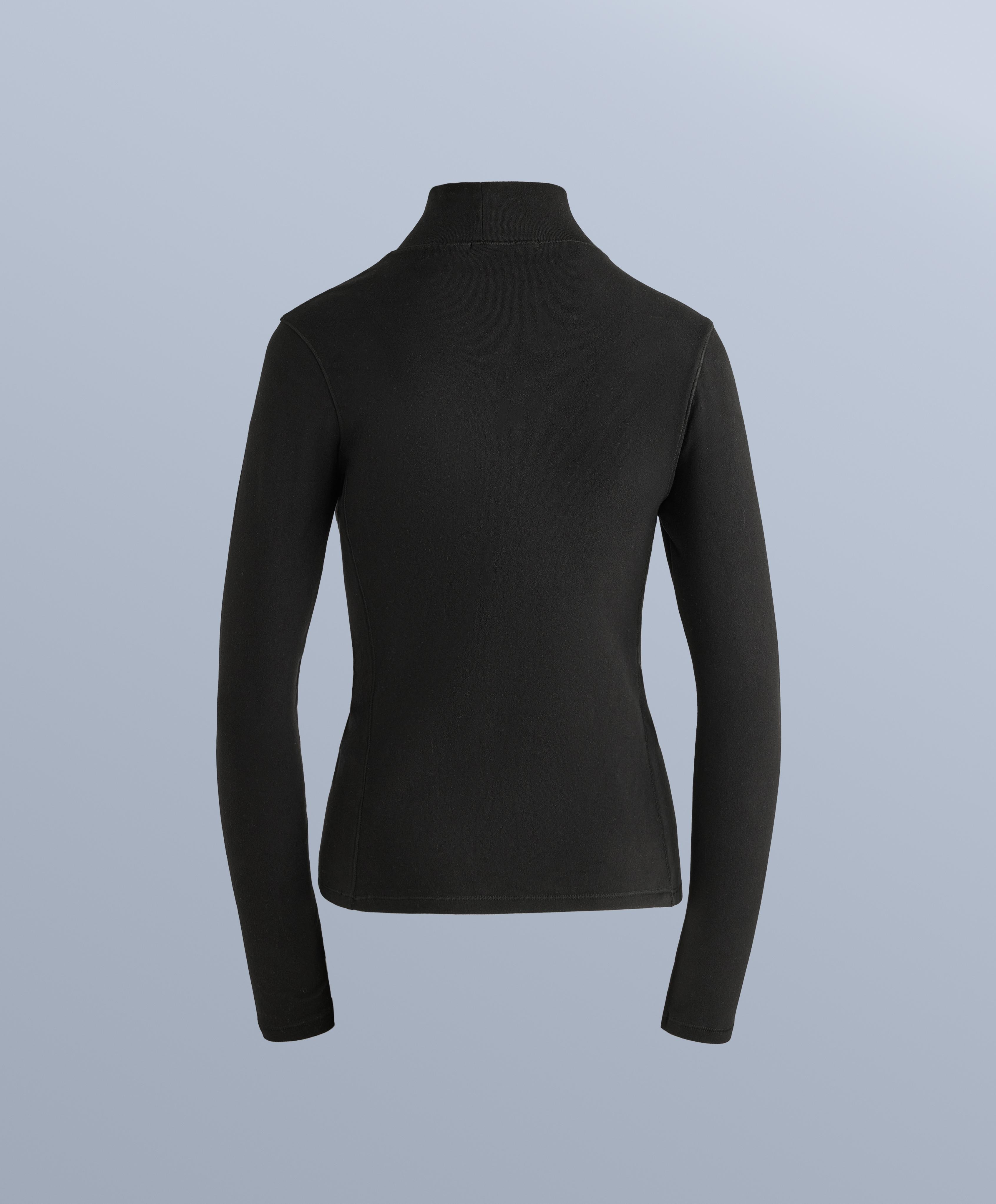 Флисовая термофутболка с длинным рукавом и высоким воротом. Из дышащей ткани с дезодорирующим эффектом. Изделие защищает от холода при температуре 10°C (низкий уровень активности) и -14°C (умеренная активность). Результаты подтверждены стандартным испытанием с имитацией ветра 0,4 м/с. На испытуемом были: куртка, брюки, нижнее белье, носки, обувь, перчатки и вязаная шапка.