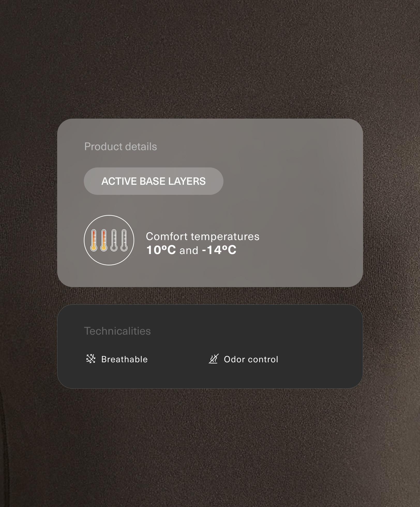 Флисовая термофутболка с длинным рукавом и высоким воротом. Из дышащей ткани с дезодорирующим эффектом. Изделие защищает от холода при температуре 10°C (низкий уровень активности) и -14°C (умеренная активность). Результаты подтверждены стандартным испытанием с имитацией ветра 0,4 м/с. На испытуемом были: куртка, брюки, нижнее белье, носки, обувь, перчатки и вязаная шапка.
