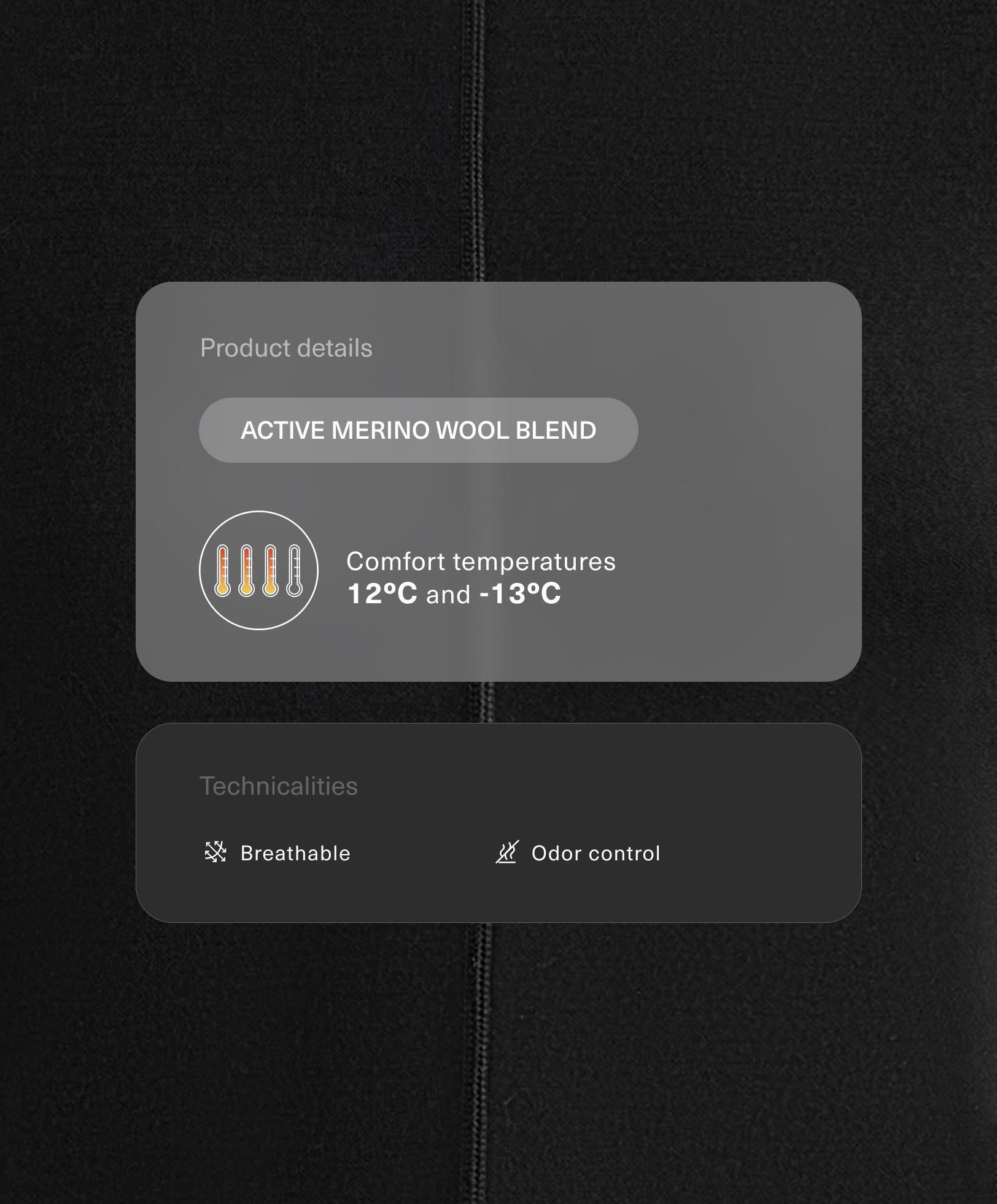 Футболка из мериносовой шерсти с длинными рукавами и высоким воротом, с тёплым внутренним слоем. Изготовлена из смеси мериносовой шерсти. Дышащая ткань с дезодорирующим эффектом. Этот предмет одежды сертифицирован и выдерживает температуру от 12ºC при низкой активности до -13ºC при умеренной активности в ходе стандартизированного испытания с имитацией ветра 0,4 м/с. Футболка надевается на куртку, футболку с длинными рукавами и высоким воротом, нижнее белье, носки, обувь, перчатки и вязаную шапку.