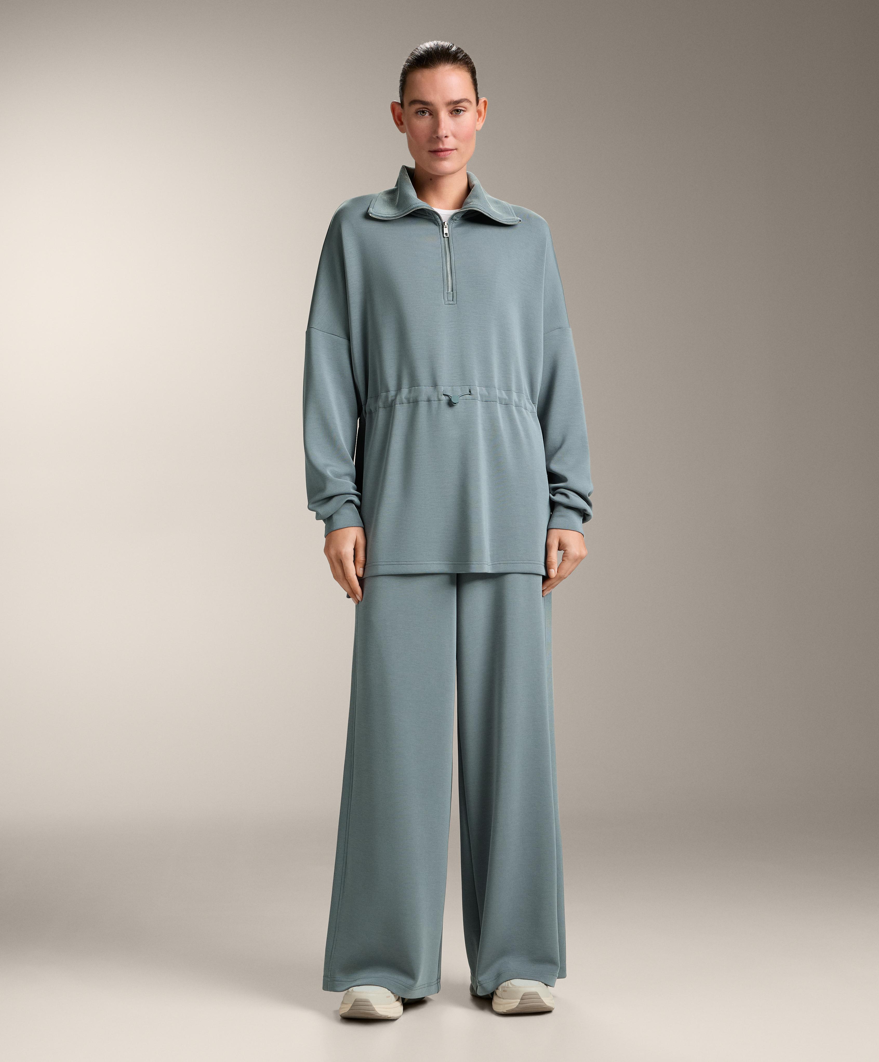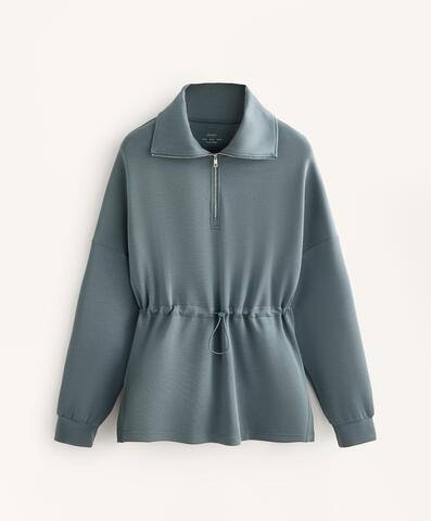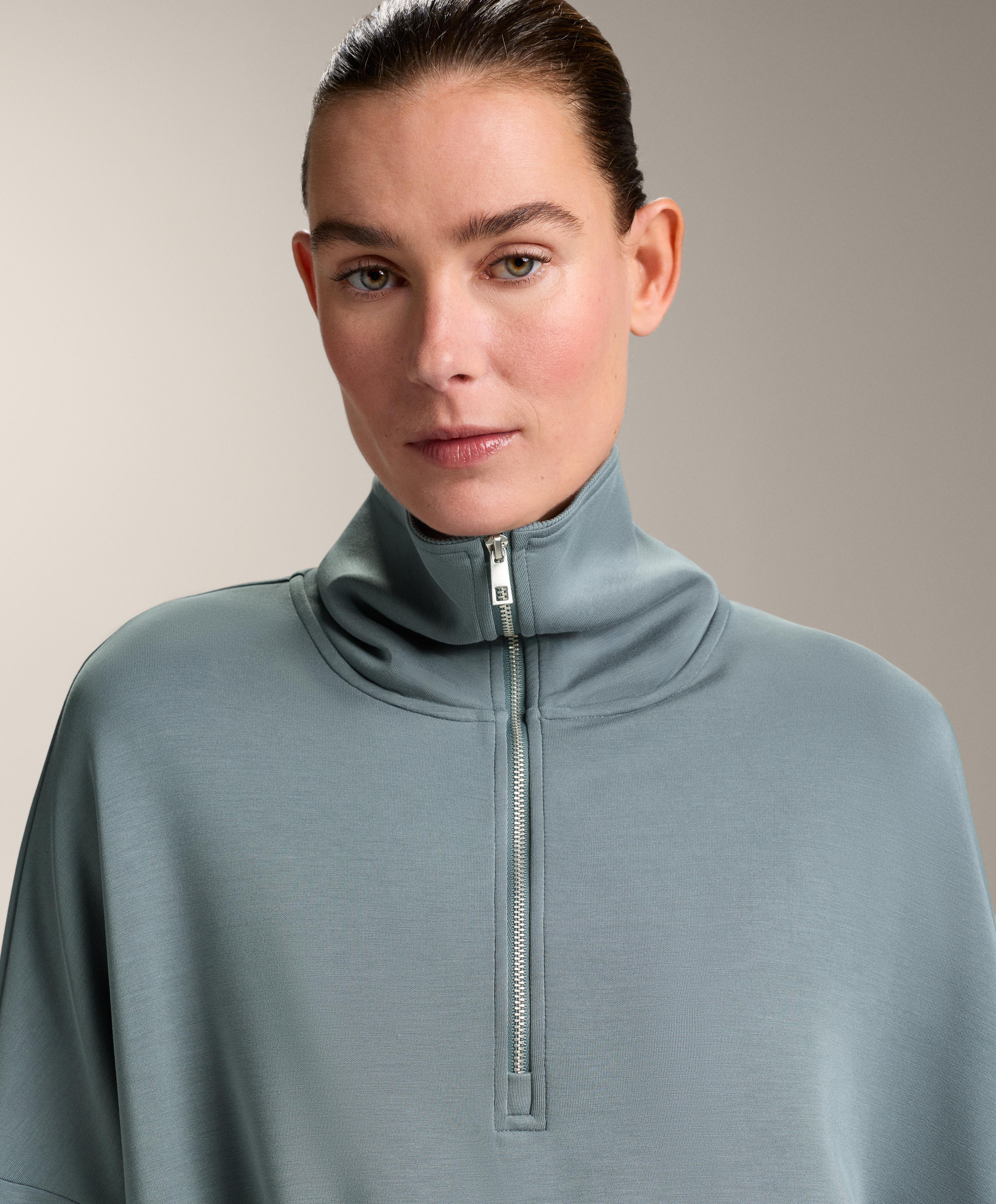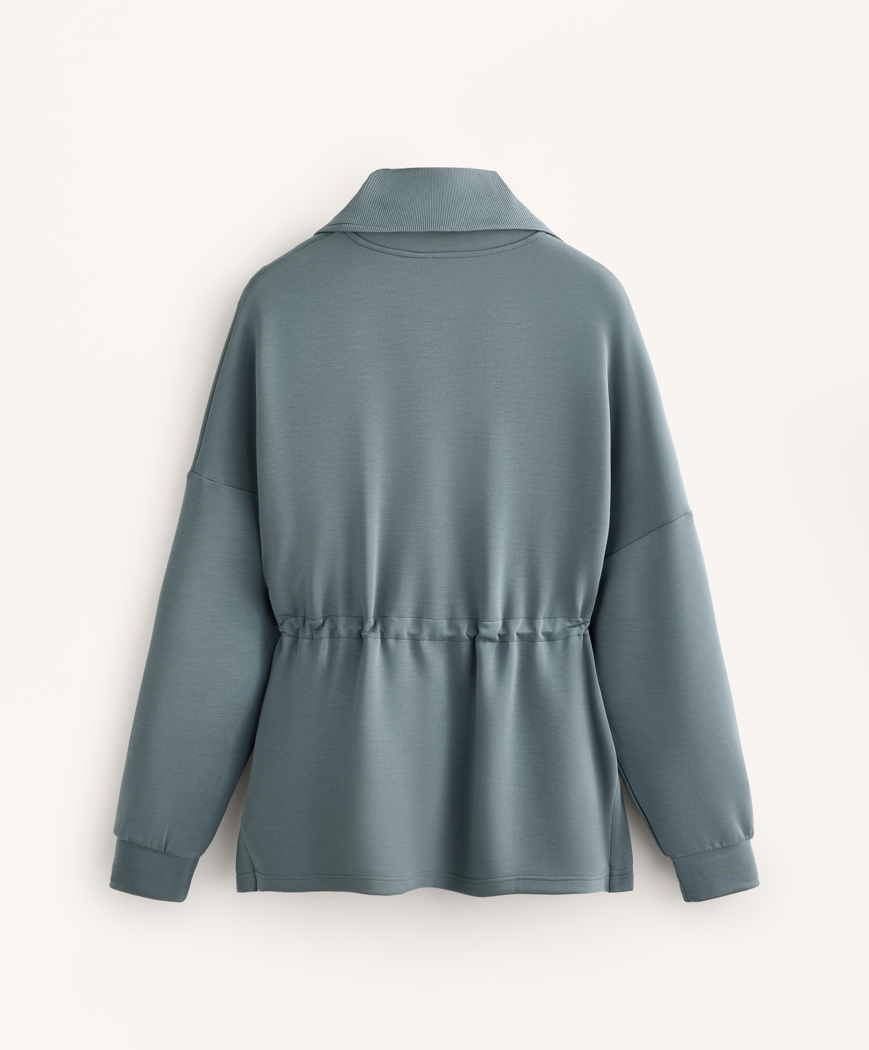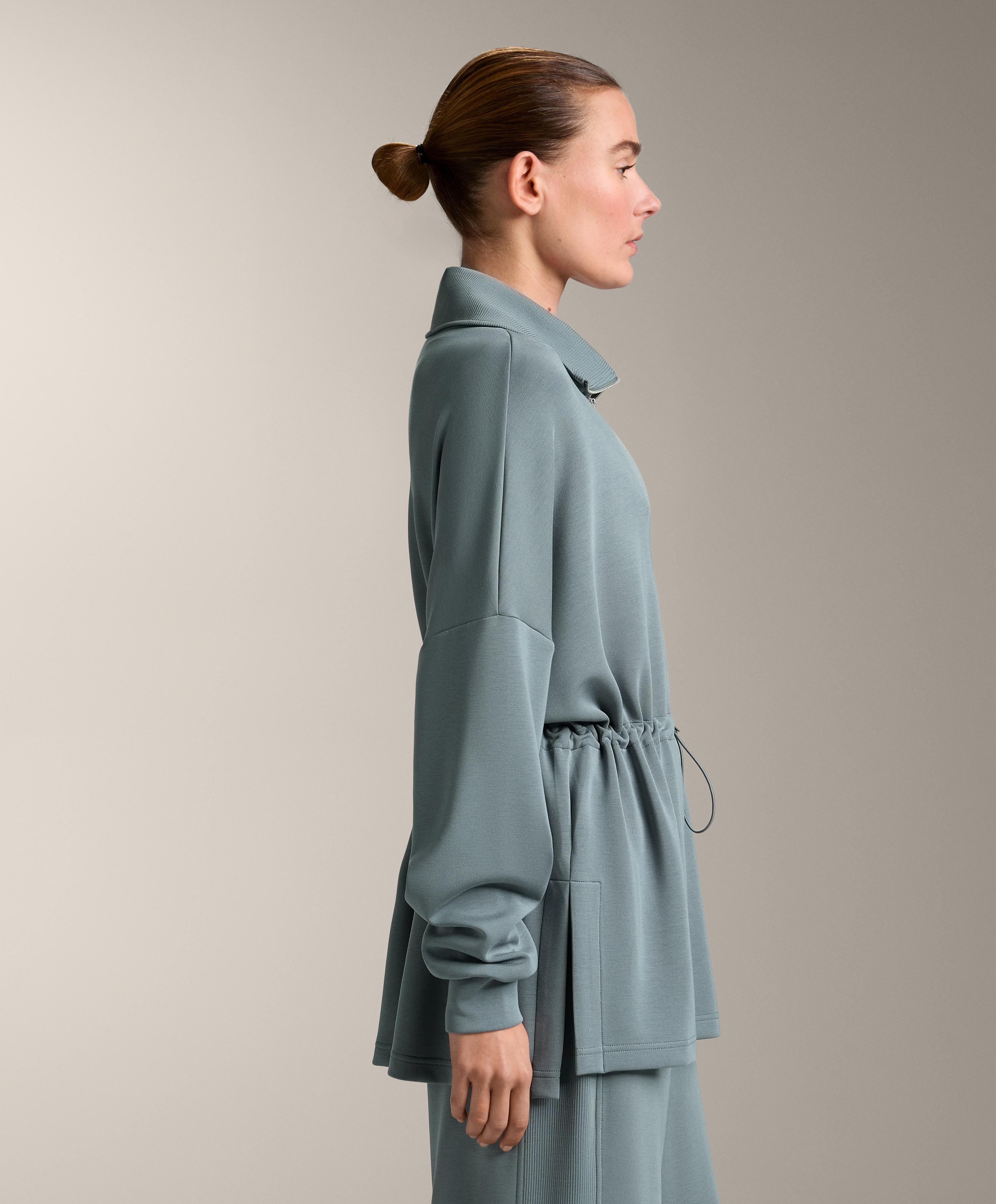 Толстовка с застежкой-молнией до середины груди. Регулируемый пояс на шнурке. Воротник-стойка с деталями в рубчик и манжеты на рукавах. Изготовлена из дышащей ткани с модалом и очень мягким прикосновением.