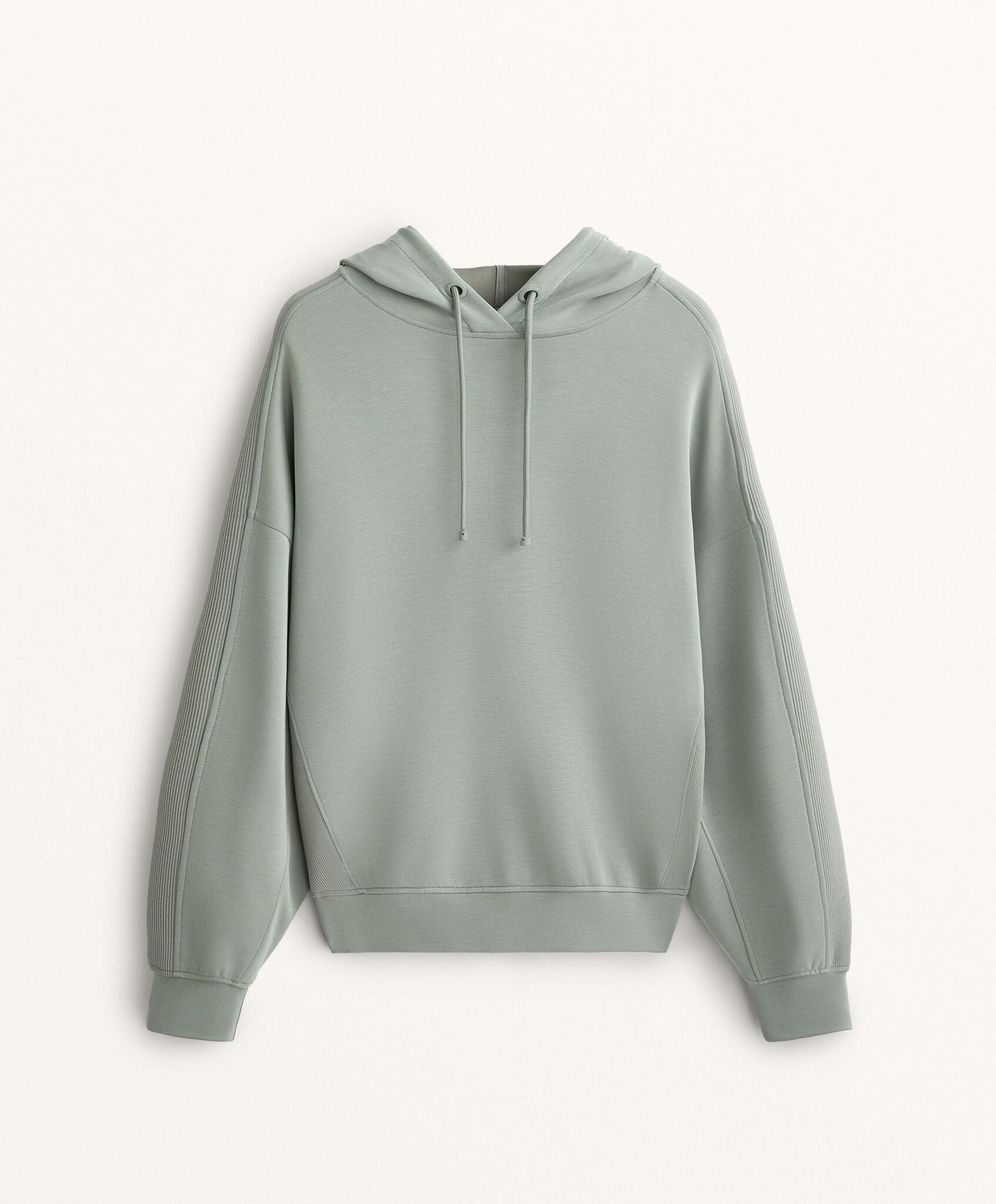 Свободный свитшот с регулируемым капюшоном на шнурке. Рукава и низ отделаны резинкой. Ткань с добавлением модала очень мягкая на ощупь.