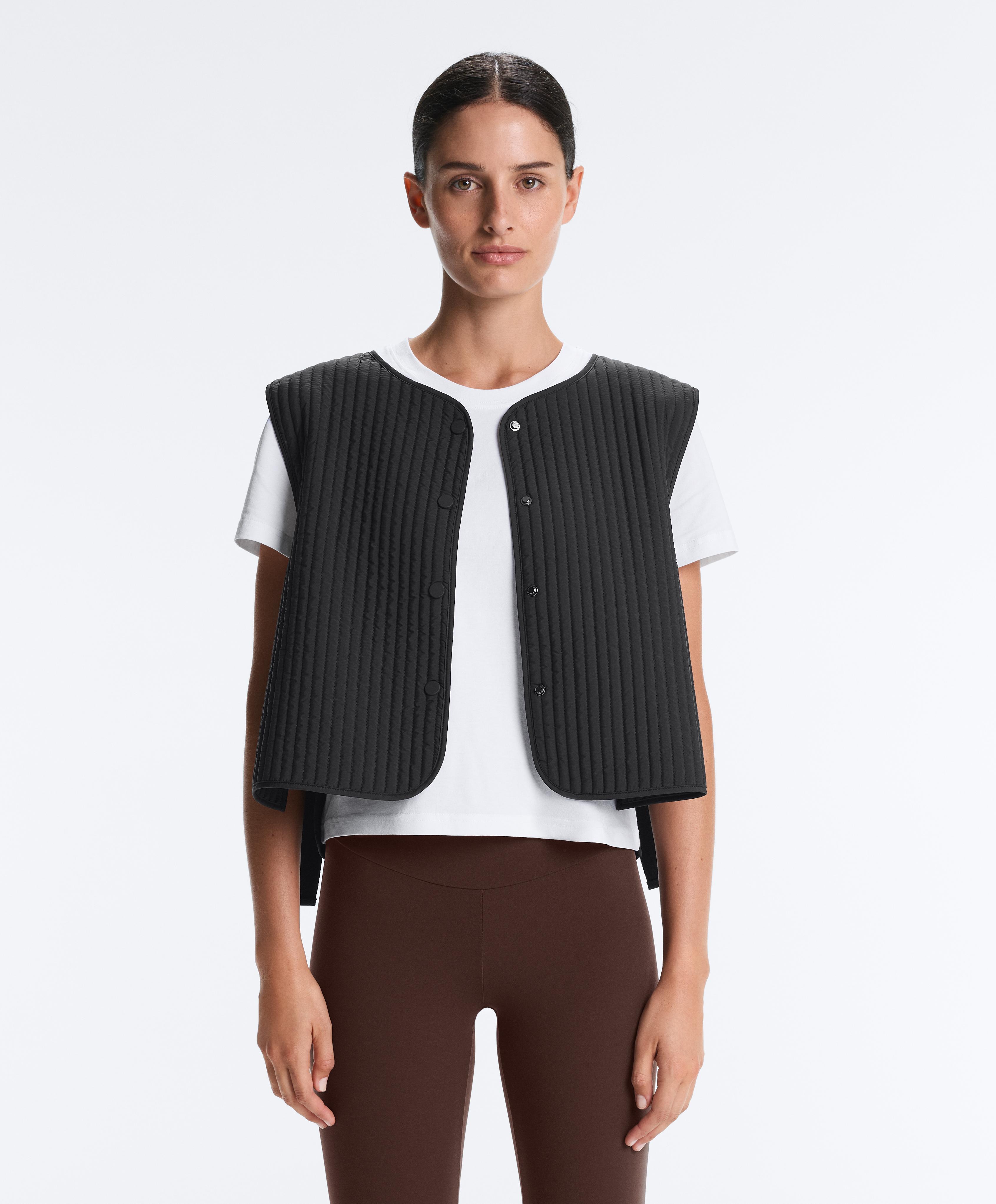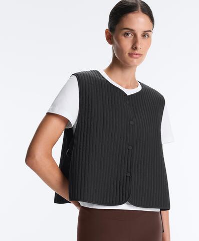Тонкий стеганый нейлоновый жилет. Застежка на пуговицы спереди и регулируемые боковые лямки.