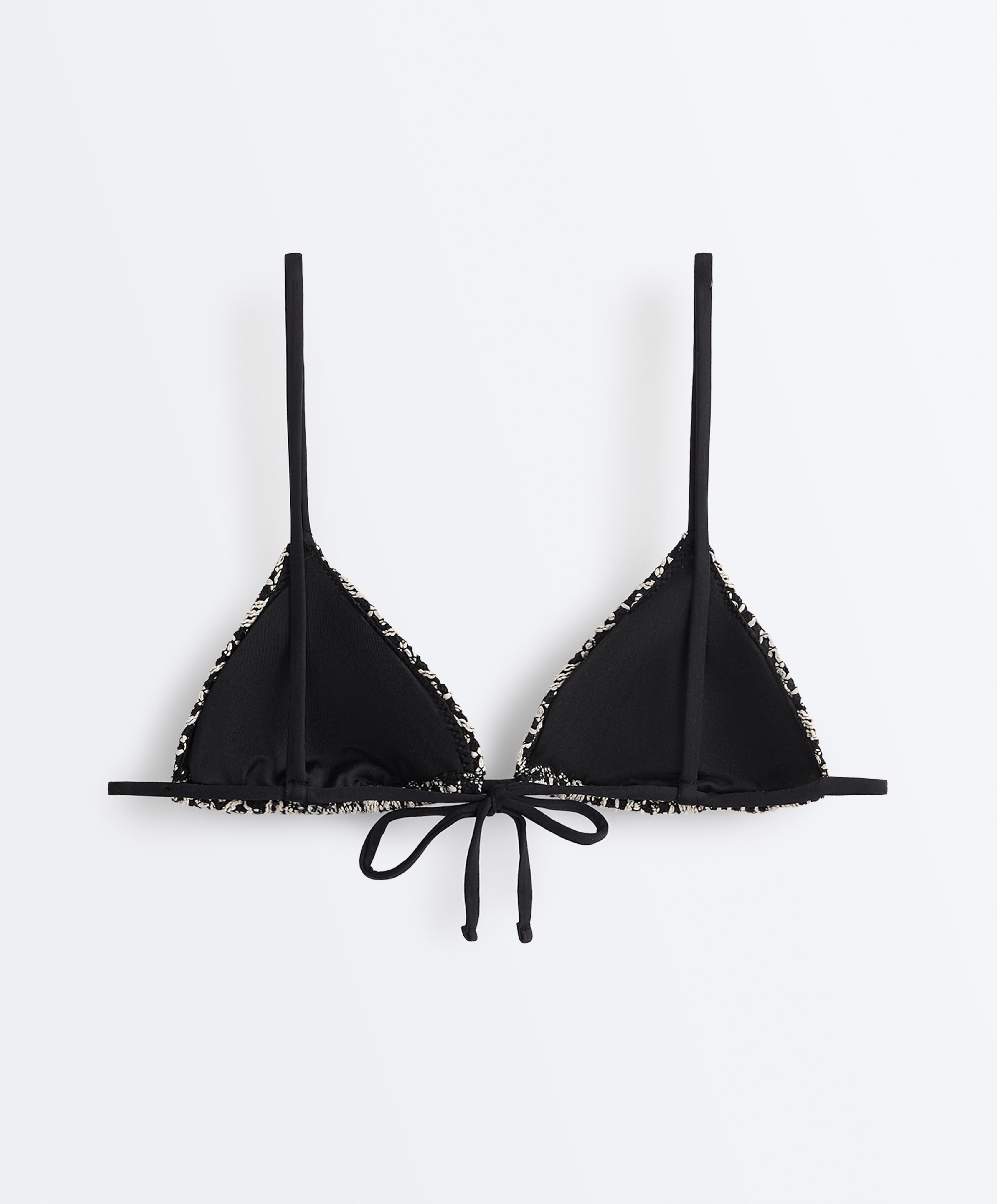 Бикини-топ треугольной формы без косточек, с регулируемой степенью закрытости и съемными чашечками. Тонкие бретельки и завязка сзади. Контрастная вязаная ткань.