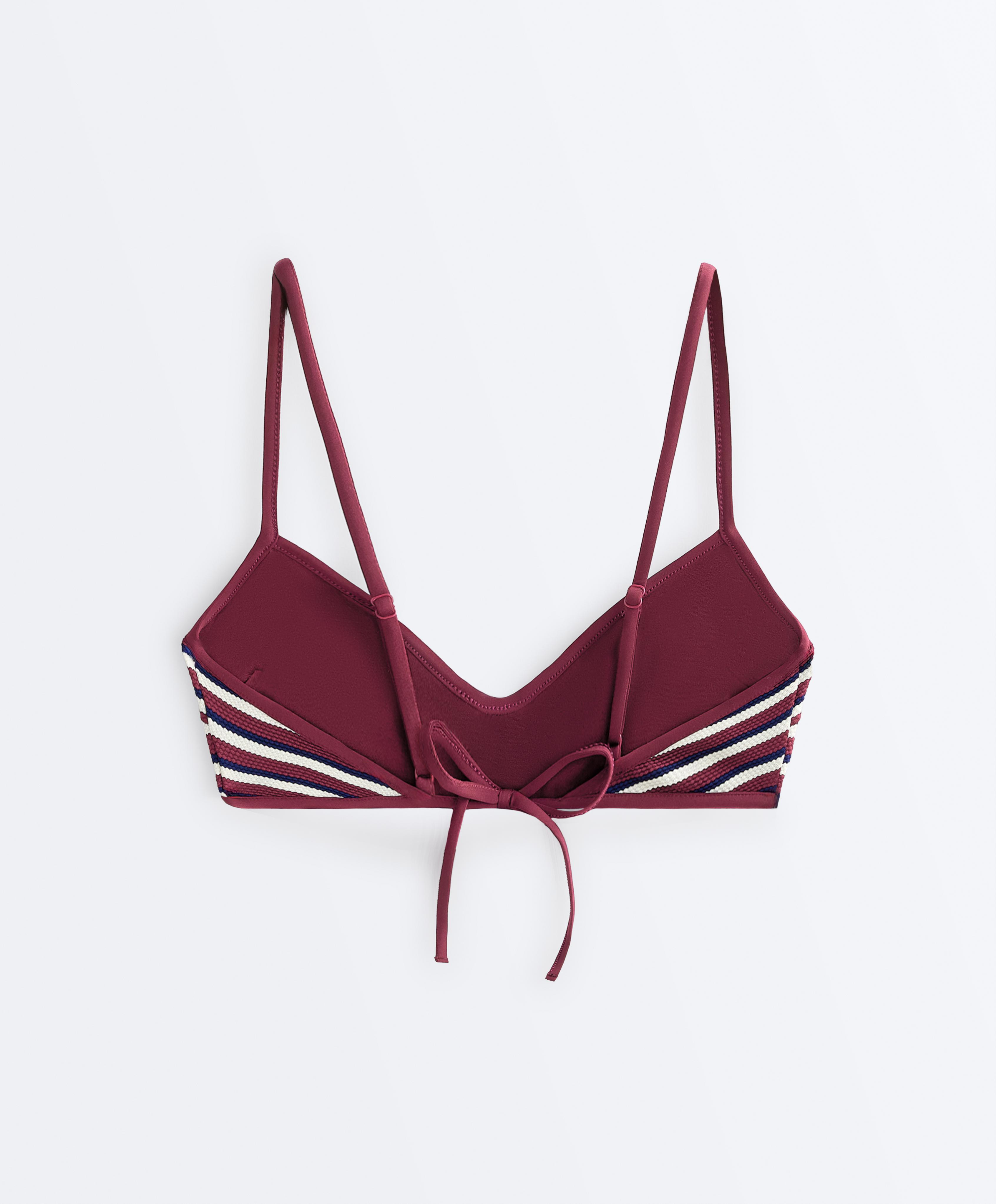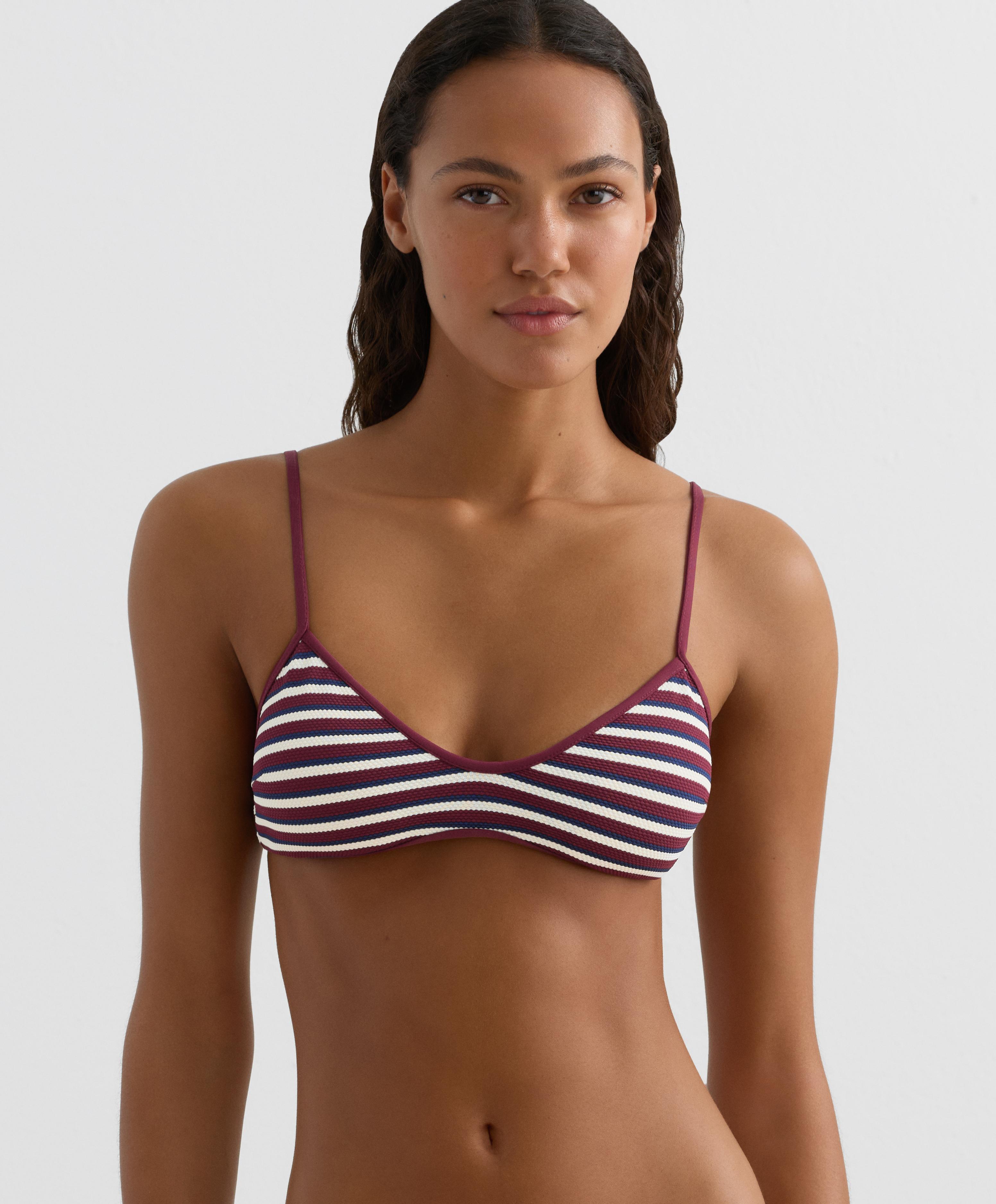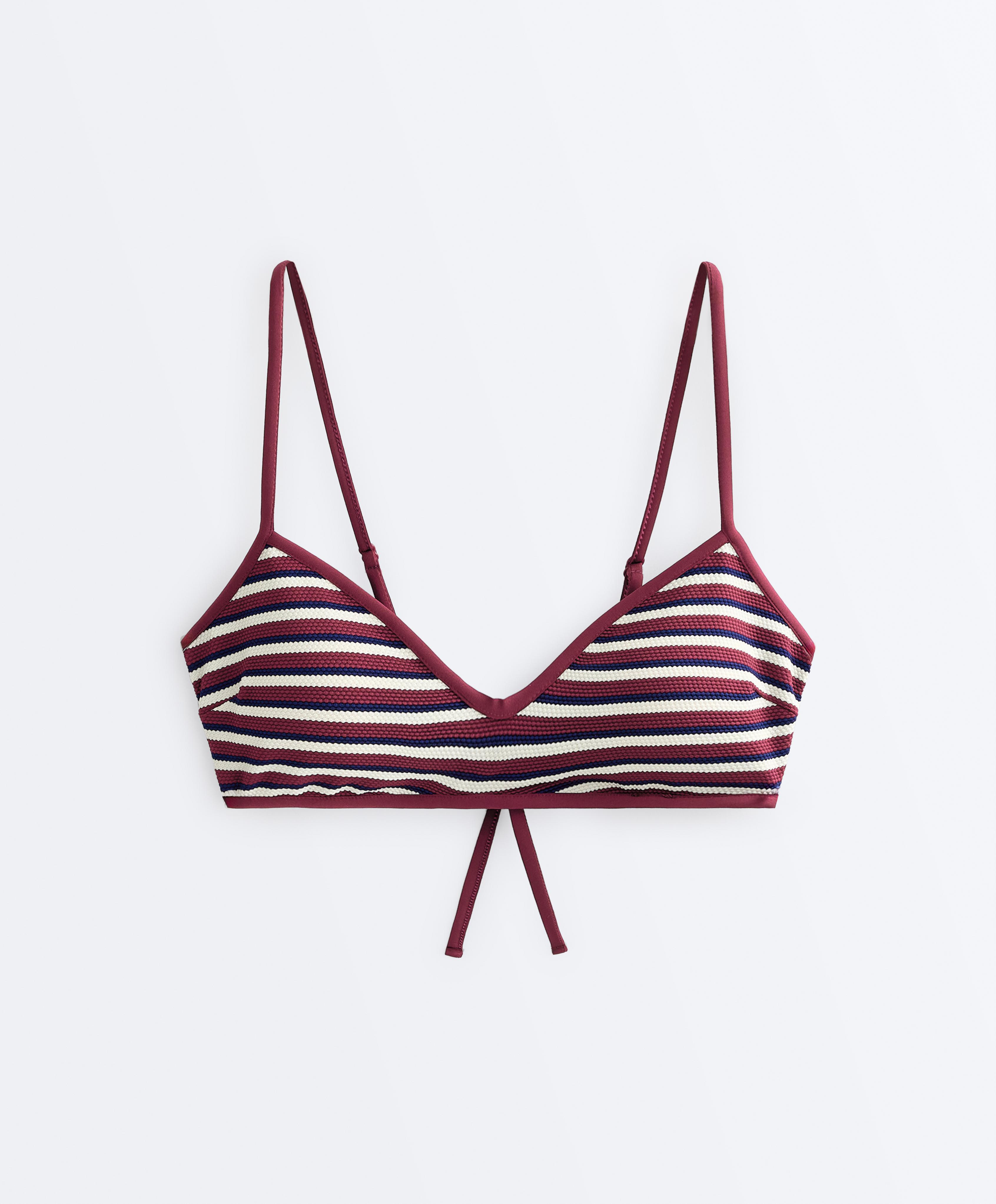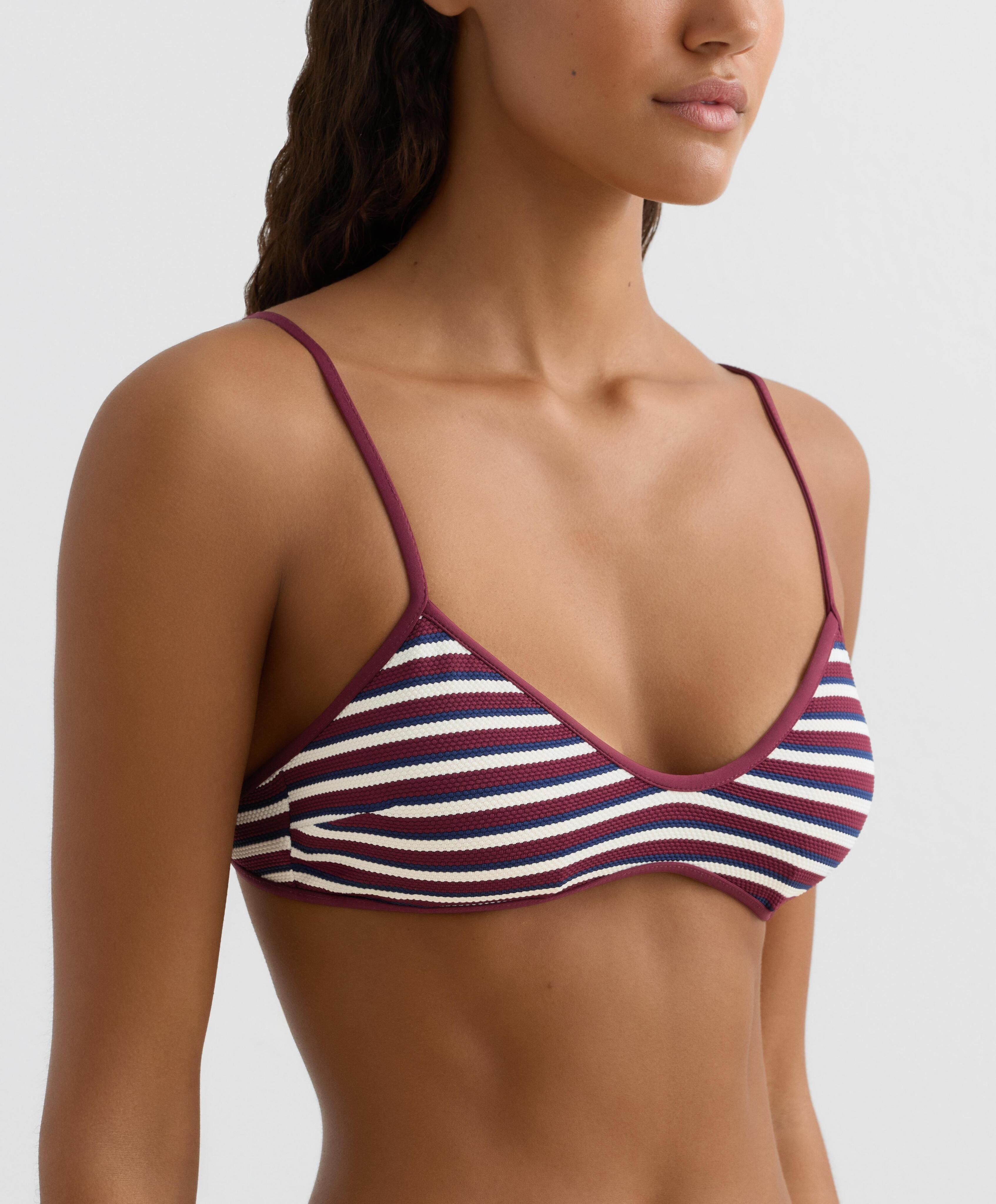 Верхняя часть бикини-треугольника без косточек со съемными чашечками. Регулируемые бретели и завязка сзади. Текстурированная ткань с полосатым принтом.