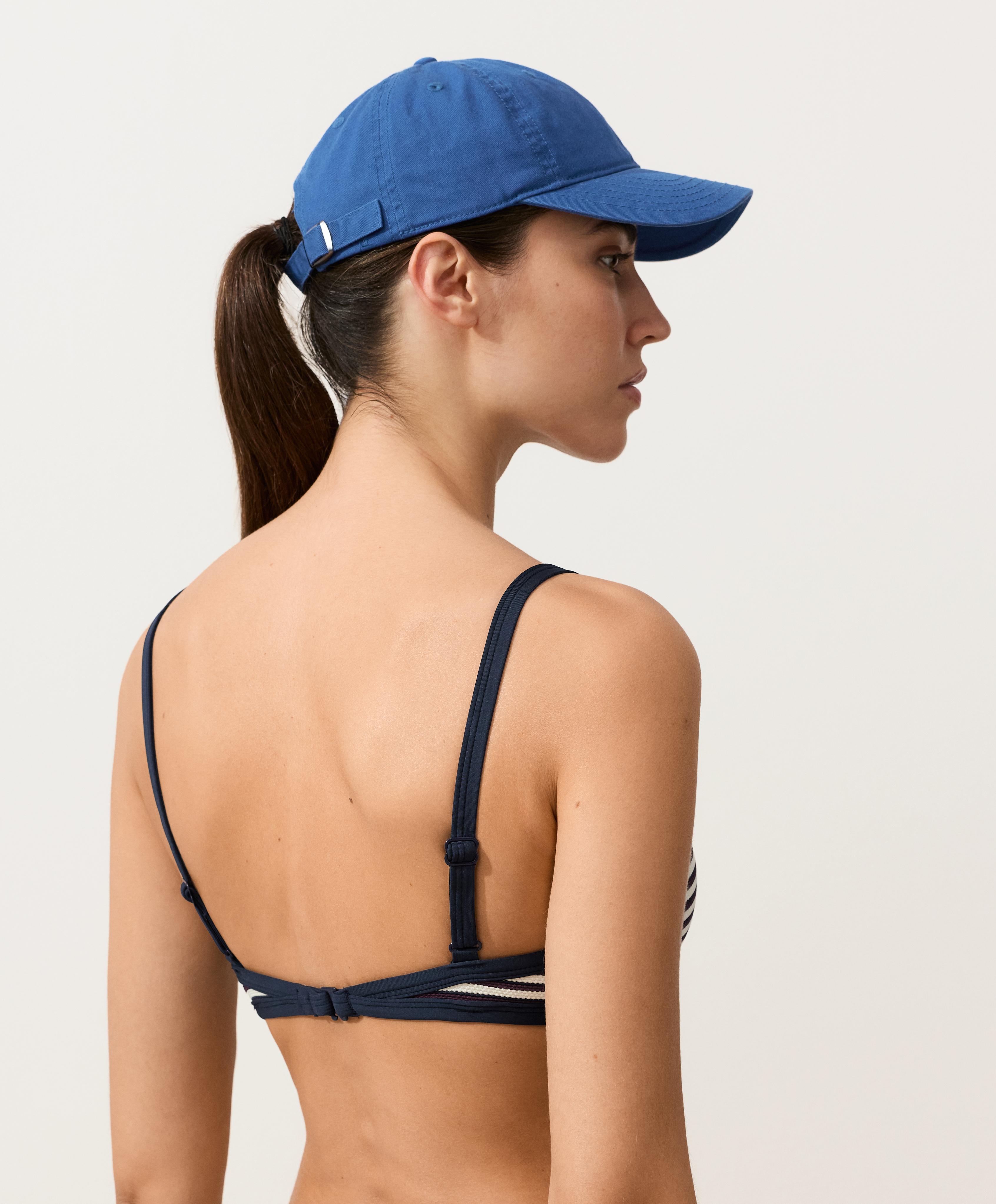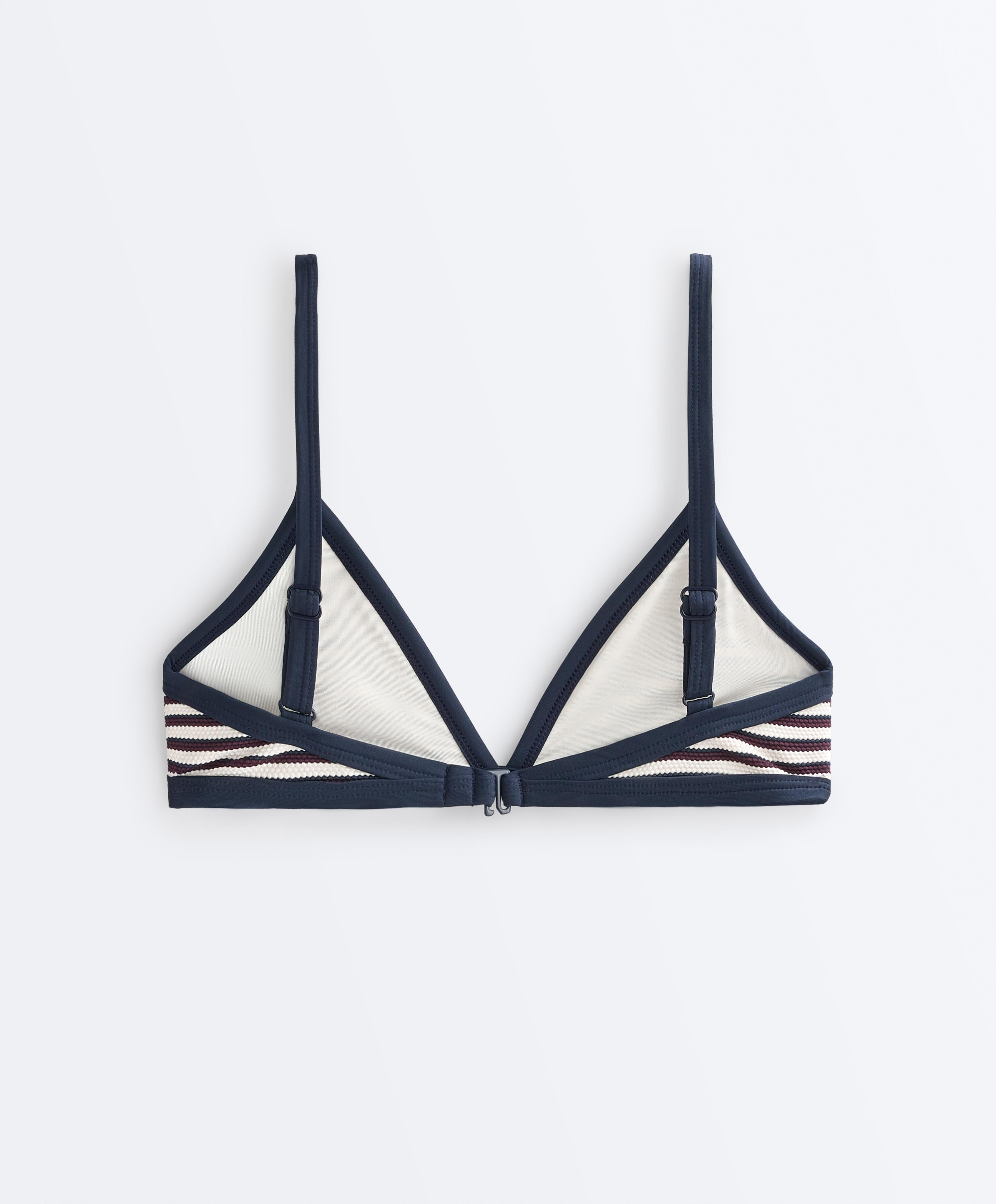 Верхняя часть бикини-треугольника без косточек со съемными чашечками. Регулируемые бретели и застежка на спине. Текстурированная ткань с полосатым принтом и контрастной отделкой.